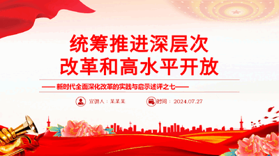 宣人:某某某讲:时间2024.07.27统筹推进深层次改革和高水平开放——新时代全面深化改革的实践与启示述评之七——前言 党的十八大以来,神州大地上改革与开放彼此激荡、相得益彰。以扩大开放促进深化改革,以深化改革促进扩大开放,为经济发展注入新动力、增添新活力、拓展新空间。习近平总书记深刻阐明改革与开放的内在统一关系。必须坚持依靠改革开放增强发展内生动力,统筹推进深层次改革和高水平开放——这是新时代我们党做好经济工作的规律性认识之一,也是新征程上坚定不移以进一步全面深化改革书写中国式现代化新篇章的致胜之道。目录1以开放促改革、促发展,是我国改革发展的成功实践2以深化改革促进扩大开放3既扩大开放之门,又将改革之路走稳以开放促改革、促发展,是我国改革发展的成功实践1以开放促改革、促发展,是我国改革发展的成功实践以放促改革、促展,是我改革展的成功开发国发实践 上海东部,滴水湖畔,重大工程热火朝天,科创地标拔节生长。6月21日,上海自由贸易试验区临港新片区对外发布了涵盖提升贸易投资环境、外籍人士服务等推进高水平开放的十项新举措。十年前的2014年5月,习近平总书记深入上海自贸试验区考察调研,寄语这块试验田要播下良种,精心耕作,精心管护,期待有好收成,并且把培育良种的经验推广开来,同时提出要把扩大开放同改革体制结合