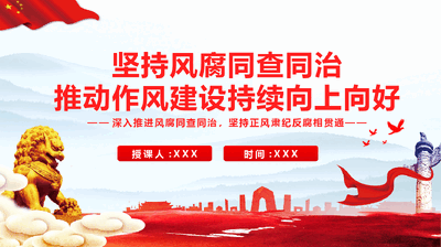 坚持风腐同查同治推动作风建设持续向上向好——深入推进风腐同查同治,坚持正风肃纪反腐相贯通——授课人:XXX时间:XXX前言/ INTRODUCTION总书记在二十届中央纪律检查委员会第四次全体会议上讲话指出,要深入推进风腐同查同治,并强调坚持以同查严惩风腐交织问题、以同治铲除风腐共性根源。总书记的重要讲话,进一步深刻阐明了党风廉政建设的内在规律,为深入推进全面从严治党提供了根本遵循。 01提高政治站位,深刻领悟风腐同查同治内涵要求 02坚持同查同治,推动形成常态长效长治工作格局 03 04坚持问题导向,深入聚焦突出问题认真查摆剖析坚持担当作为,稳步加强作风建设锤炼过硬作风目录PART ONE第一部分提高政治站位,深刻领悟风腐同查同治的内涵要求壹风腐同查同治何为风腐同查同治?风腐一词听起来较为生疏,其实早已出现。 2024年1月10日,中国共产党第二十届中央纪律检查委员会第三次全体会议召开,会议审议通过的《中国共产党第二十届中央纪律检查委员会第三次全体会议公报》提出,健全风腐同查同治工作机制,既由风查腐又由腐纠风。半年后,党的二十届三中全会通过的《中共中央关于进一步全面深化改革、推进中国式现代化的决定》,要求健全不正之风和腐败问题同查同治机制。作为纪检监察领域的专有名词,风腐指的是不正之风和腐败问题。 而风腐