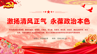 激扬清风正气永葆政治本色主讲人:文可居文库 时间:20XX.XX.XX作风建设是永恒课题,要标本兼治,经常抓、见常态,深入抓、见实效,持久抓,见长效,通过立破并举、扶正祛邪,不断巩固和扩大已经取得的成果,努力以优良的党风政风带动全社会风气根本好转作风建设是永恒课题,要标本兼治,经常抓、见常态,深入抓、见实效,持久抓,见长效,通过立破并举、扶正祛邪,不断巩固和扩大已经取得的成果,努力以优良的党风政风带动全社会风气根本好转。习近平总书记的重要论述,为我们持之以恒抓好作风建设指明了方向。作风建设,关系党的形象,关系人心向背,关系党和国家的生死存亡。开展作风建设和整治违规吃喝问题,是贯彻落实党中央全面从严治党要求的重要举措,是营造风清气正政治生态的必然要求,是推动XX市经济社会高质量发展的有力保障。前言党的十八大以来,党中央持之以恒正风肃纪,开展了史无前例的反腐败斗争,不敢腐、不能腐、不想腐一体推进,打虎拍蝇猎狐多管齐下,反腐败斗争取得压倒性胜利并全面巩固,消除了党、国家、军队内部存在的严重隐患,确保党和人民赋予的权力始终用来为人民谋幸福。党中央以得罪千百人、不负十四亿的使命担当祛疴治乱,锲而不舍、久久为功,抓铁有痕、踏石留印,刹住了一些长期没有刹住的歪风,纠治了一些多年未除的顽瘴痼疾,党风政风为之一新,社风民风持续向好。但也要清醒看到,四风问题