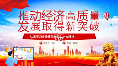 授课人:XXX时间:202X--认真学习宣传贯彻党的二十大精神--推高动经济质量推高量动经济质展取得新突发破展取得新突破发前 言党的二十大报告提出:高质量发展是全面建设社会主义现代化国家的首要任务。这是在科学研判我国发展新的历史条件和阶段,全面认识和把握我国社会主义现代化建设历程和社会主义经济建设规律的基础上,统筹国内国际两个大局、审时度势作出的具有全局性、长远性、战略性意义的重大判断。未来五年是全面建设社会主义现代化国家开局起步的关键时期。党的二十大报告明确了未来五年我国发展的主要目标任务,经济高质量发展取得新突破排在首位。领导人在参加十四届全国人大一次会议江苏代表团审议时强调要牢牢把握高质量发展这个首要任务,提出四个必须重要要求。我们要深入学习领会领导人关于高质量发展的重要论述和党的二十大精神,深刻认识和准确把握其历史逻辑、科学内涵、重大意义、实践要求,扑下身子真抓实干,以新气象新作为推动我国经济高质量发展取得新突破。实现高质量发展是中国式现代化的本质要求之一01以高质量发展把握战略主动02以高质量发展开创未来03C目录ONTENTS第01部分高量展是实现质发中式代化的本要求之一国现质--认真学习宣传贯彻党的二十大精神--党的十八大以来,中国特色社会主义进入了新时代,我国经济发展也进入了新时代,基本特征就是我国经济已由高速增长阶段转向高质量发展阶段。推动高质量发展,是保持经济持续健康发展的必然要求,是适应我国社会主要矛盾变化的必然要求,是遵循经济规律发展的必然要求。我们以推进高质量发展为主题、以供给侧结构性改革为主线,推动发展的平衡性协调性包容性持续提高,我国经济迈上更高质量、更有效率、更加公平、更可持续、更为安全的发展之路。党的二十大报告明确了新时代新征程中国共产党的使命任务:团结带领全国各族人民全面建成社会主义现代化强国、实现第二个百年奋斗目标,以中国式现代化全面推进中华民族伟大复兴。实现高质量发展是中国式现代化的本质要求之一,没有高质量发展,就谈不上社会主义现代化。实现高质量发展是中国式现代化的本质要求之一新时代十年的伟大实践充分证明,只有牢牢把握高质量发展这个首要任务,完整、准确、全面贯彻新发展理念,加快构建以国内大循环为主体、国内国际双循环相互促进的新发展格局,推动经济实现质的有效提升和量的合理增长,才能不断壮大我国经济实力、科技实力、综合国力。完成脱贫攻坚、全面建成小康社会的历史任务,实现第一个百年奋斗目标后,乘势而上开启全面建设社会主义现代化国家新征程、向第二个百年奋斗目标进军,这标志着我国进入了一个新发展阶段。在强国建设、民族复兴的新征程上,必须坚定不移推动高质量发展。实现高质量发展是中国式现代化的本质要求之一本质要求坚定不移推动高质量发展,必须完整、准确、全面贯彻新发展理念,必须更好统筹质的有效提升和量的合理增长,必须坚定不移深化改革开放、深入转变发展方式,必须以满足人民日益增长的美好生活需要为出发点和落脚点。高质量发展是十四五乃至更长时期我国经济社会发展的主题,关系我国社会主义现代化建设全局。这不只是一个经济要求,而是对经济社会发展方方面面的总要求;不是只对经济发达地区的要求,而是所有地区发展都必须贯彻的要求;不是一时一事的要求,而是必须长期坚持的要求。实现高质量发展是中国式现代化的本质要求之一 高质量发展是体现新发展理念的发展第02部分以高量展把握略主质发战动--认真学习宣传贯彻党的二十大精神--当前,我国发展面临新的战略机遇、新的战略任务、新的战略阶段、新的战略要求、新的战略环境。坚定不移推动高质量发展,才能把国家和民族发展放在自己力量的基点上,把我国发展进步的命运牢牢掌握在自己手中。以高质量发展应对复杂严峻的外部环境。当前,世界百年未有之大变局加速演进,不确定、难预料因素增多。一方面,随着全球经济增速放缓,国际经济贸易形势日趋复杂,同时单边主义、保护主义、逆全球化思潮明显上升,多边贸易体制遭受冲击,贸易摩擦不断升级,全球产业链加速重构,给我国经济发展带来诸多不确定性。另一方面,地缘政治风险上升,我国发展面临的国际环境更趋复杂严峻。我们只有集中精力办好自己的事,提高发展质量,增强国家综合实力和抵御风险能力,才能处变不惊、从容应对,实现经济行稳致远、社会和谐安定。以高质量发展把握战略主动 发展是党执政兴国的第一要务进入新发展阶段,我国发展站在了更高历史起点上,但发展不平衡不充分问题仍然突出,如创新能力还不适应高质量发展要求、城乡区域发展和收入分配差距仍然较大等。根据新发展阶段的新要求,坚持问题导向,自觉主动解决地区差距、城乡差距、收入分配差距等问题,同时把实施扩大内需战略同深化供给侧结构性改革有机结合起来,必将在实现创新成为第一动力、协调成为内生