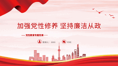 授课人:XXXX时间:加强党性修养 坚持廉洁从政——党性教育专题党课——REFACE前言P今年我们召开会议,主要目的是对照当前从严治党要求,坚持廉洁从政开展学习,希望大家要对照刚才学习内容,认真检视自己,进一步提高站位、勇于担当、真抓实干,以良好的工作状态抓好各项工作的落实。下面,结合我本人的学习心得与大家讲一节廉政党课。目录01 什么是党性修养02 如何准确把握党性修养03如何提升党性修养第一部分 PART ONE什么是党性修养所谓党性修养就是一名党员对于党的伟大事业、党的伟大工程、党的伟大斗争的总体世界观,是一名党员政治理想和人生理念的集中体现。第一部分/什么是党性修养世界观是一个人的总开关 是一个人对于世界的根本看法和总体认识,也决定人的一生。同时,不同的世界观也决定不同的政治理想和政治立场。历史经验告诉我们,一个人如果没有修养就不能树立正确的世界观,就干不成任何事;种种腐败案例告诫我们,一名党员如果没有良好的党性修养就会丧失政治立场、动摇理想信念,进而就坠入贪腐的深渊。党章第一部分/什么是党性修养坚持廉洁从政就要加强党性修养第一 廉加强党性修养是廉洁从政的基础和保障,是共产党人保持先进性的重要内容和内在要求,其核心要义就是为民务实清廉。党员干部自身建设搞得好,党性修养过硬,歪风邪气就难以入侵,才能确保严守党纪,廉洁从政。廉是中国古代思想史上非常重要的概念,其本意为堂屋之侧边和物体露出的棱角,引申为人的品行端方不苟、方正刚直。第一部分/什么是党性修养加强党性修养是检验执政能力的重要保证第二 加强党性修养是提高执政能力的永恒课题纵观党史,越是困难时期,人民群众对党员干部越是抱有更高的期望,越是对作风建设、执政能力提出更高的要求。我们要进一步加强党性修养,提升工作能力和水平,以坐不住、等不起、慢不得的紧迫感和责任感、更务实的工作作风推进落实今年各项工作任务。第一部分/什么是党性修养党性是党员干部立身、立业、立言、立德的基石,必须在严格的党内生活锻炼中不断增强。我们要坚持通过党性修养,把领导新时代中国特色社会主义思想转化为坚定不移的政治信仰,转化为辩证全面的思维方法,转化为立身做人的基本准则,转化为增强四个意识、坚定四个自信、做到两个维护的具体行动。加强党性修养、坚持廉洁从政是改造世界观的终身课题第三 党性修养自我教育1自我改造2自我完善3第一部分/什么是党性修养第二部分 PART TWO如何准确把握党性修为第一政治坚定古语言——疾风知劲草,板荡识诚臣坚持和加强党的领导不动摇坚持和发展中国特色社会主义不动摇坚持实现中华民族伟大复兴的宏伟目标不动摇尤其在当前危难时期、关键时刻,必须坚持。历史经验告诉我们,一个人如果立场不坚定,吃着碗里、看着锅里,那么最终将会什么也得不到、什么事也干不成。三个不动摇第二部分/如何准确把握党性修为第二作风优良作风就是要看你的领导作风、生活作风和工作作风领导作风方面我们领导干部尤其一把手要检视有没有霸道作风,存在搞一言堂的现象,对下严格要求、对己放任自流,不受纪律约束等;生活作风方面我们要检视在金钱关、亲情关、亲友关、利益关方面是否过硬,是否能经得起诱惑、耐得住寂寞、守得住底线;工作作风方面我们要检视有没有经常深入基层、深入人民群众,深入基层、深入人民群众我们要干什么、目的是什么第二部分/如何准确把握党性修为第三纪律严明政治纪律上我们要反思在言行上是否与党中央保持高度一致、怎样才能与党中央保持高度一致;组织纪律上我们要反思是真入党还是假入党,是否真正做到了从思想上入党,能否经得起四个考验;经济纪律上我们要反思自身的贪腐防线是否筑牢,在经济活动中能否做到严格自律、能认真把好亲商关系,第二部分/如何准确把握党性修为第四勤政为民要做到勤政为民,就要坚持权为民所用、情为民所系、利为民所谋,为群众诚心诚意办实事,尽心竭力解难事,坚持不懈做好事。先有勤政,才能为民,领导指出行动至上就是勤政为民。我们通行业是服务民生的行业,为人民群众提供安全、舒适、满意的环境就是勤政为民。第二部分/如何准确把握党性修为第五恪尽职守恪尽职守在其位、谋其政,任其职、尽其责要做到恪尽职守,首先要搞清楚自己的主业、主绩、主责,对责任和任务列出清单,进行清单化管理,聚焦提升工作效率和工作业绩。尤其是要熟练掌握业务技能,谋个事成个事,干个事像个事。第二部分/如何准确把握党性修为第六清正廉洁党的十八大以来,我们应该从被查处的党员干部身上举一反三,不收手、不当事,胆大妄为、不听招呼的只会妻离子散、家破人亡,这种惨重的代价希望不要发生在大家身上。做政治上的明白人做经济上的清醒人做作风上的正派人第二部分/如何准确把握党性修为第三部分 PART THRE