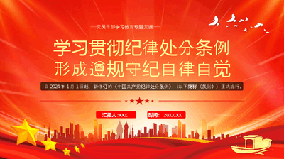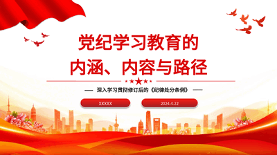 党纪学习教育的内涵、内容与路径XXXXX2024.4.22——深入学习贯彻修订后的《纪律处分条例》——第一2024年党纪学习教育的内涵与意义第二党纪学习教育的主要内容目录第三党纪学习教育的实施路径2024年党纪学习教育的内涵与意义[ 第一部分 ]第一部分/2024年党纪学习教育的内涵与意义在全面从严治党的新时代背景下,中共中央办公厅印发《关于在全党开展党纪学习教育的通知》,标志着全党范围内的一次深刻的思想洗礼和党性锤炼正式拉开帷幕。此次党纪学习教育,旨在深入学习贯彻修订后的《中国共产党纪律处分条例》,进一步强化党员干部的政治纪律和政治规矩,确保全党在思想上政治上行动上同党中央保持高度一致。开展党纪学习教育,是加强党的纪律建设的重要举措,是提升党员干部党性修养的重要途径,也是推动全面从严治党向纵深发展的必然要求。通过学习教育,广大党员干部将更加深刻地认识到党的纪律的严肃性和权威性,更加自觉地遵守党的纪律,更加坚定地维护党的团结统一。党纪学习教育的主要内容[ 第二部分 ]第二部分/党纪学习教育的主要内容党纪学习教育的内容丰富而深刻,主要包括以下几个方面:(一)深入学习党的纪律体系党员干部要全面系统地学习党的纪律体系,包括党的政治纪律、组织纪律、廉洁纪律、群众纪律、工作纪律、生活纪律等。通过学习,要明确各项纪律的具体要求,把握纪律的精神实质,增强纪律意识和规矩意识。第二部分/党纪学习教育的主要内容(二)重点学习《中国共产党纪律处分条例》《中国共产党纪律处分条例》是党的纪律建设的基本遵循,是全体党员必须遵守的行为准则。党员干部要重点学习《条例》的新精神、新要求、新规定,深刻领会其精神实质和核心要义,确保在实际工作中能够准确运用、严格执行。(三)强化党性教育和道德教育党性教育和道德教育是党员干部提升自我修养、增强党性观念的重要途径。要通过学习党的历史、党的优良传统和作风,引导党员干部坚定理想信念、牢记党的宗旨、增强四个意识、坚定四个自信、做到两个维护。同时,要加强社会公德、职业道德、家庭美德和个人品德教育,引导党员干部树立正确的世界观、人生观和价值观。党纪学习教育的实施路径[ 第三部分 ]第三部分/党纪学习教育的实施路径为确保党纪学习教育取得实效,需要采取以下实施路径:(一)加强组织领导,确保学习教育有序开展各级党组织要高度重视党纪学习教育工作,加强组织领导,制定详细的学习教育计划,明确学习教育的目标、任务和要求。要建立健全学习教育制度,确保学习教育活动的规范化、常态化。同时,要加强对学习教育活动的督促检查,确保各项任务落到实处。第三部分/党纪学习教育的实施路径(二)创新学习方式方法,提高学习教育效果要充分利用现代信息技术手段,创新学习方式方法,提高学习教育的针对性和实效性。可以通过举办讲座、研讨会、培训班等形式,组织党员干部集中学习;也可以利用网络平台、微信公众号等渠道,开展在线学习、互动交流等活动。同时,要注重理论与实践相结合,通过案例分析、情景模拟等方式,增强学习的吸引力和感染力。(三)强化学习成果运用,推动全面从严治党向纵深发展学习教育的最终目的是要转化为推动工作的强大动力。因此,要注重学习成果的运用,将学习教育成果转化为推动全面从严治党向纵深发展的实际行动。要通过学习教育,引导党员干部自觉遵守党的纪律和规矩,严格执行党的决策部署和各项规定;要通过学习教育,推动党员干部在工作中勇于担当、敢于负责、善于作为,为党和人民事业作出新的更大贡献。结语 开展党纪学习教育是全党的一项重要任务,也是每个党员干部的政治责任。广大党员干部要以高度的政治自觉和行动自觉投身到学习教育中来,以学习教育为契机,不断提升自身的党性修养和纪律意识,为推进全面从严治党、实现党的历史使命而不懈奋斗。同时,各级党组织要加强组织领导,创新方式方法,强化成果运用,确保学习教育取得实实在在的成效。通过本次党纪学习教育,我们坚信,全党上下将形成更加严明的纪律氛围,广大党员干部将以更加饱满的热情和更加坚定的信念,投身于新时代中国特色社会主义伟大事业中,为实现中华民族伟大复兴的中国梦而努力奋斗。内涵、内容与路径2024年党纪学习教育深度解析