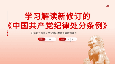 律分例学习贯彻纪处条形成遵守自律自规纪觉汇报人:XXX 时间:20XX.XX自2024年1月1日起,新修的《中共党律分例》(以下《例》)正式施行。订国产纪处条简称条——党干部育党——员学习教专题课前 言 PREFACE自2024年1月1日起,新修订的《中国共产党纪律处分条例》(以下简称《条例》)正式施行。《条例》坚持以领导人新时代中国特色社会主义思想为指导,全面贯彻党的二十大精神,深刻领悟两个确立的决定性意义、坚决做到两个维护,进一步严明党的政治纪律和政治规矩,带动各项纪律全面从严,不断增强党自我净化、自我完善、自我革新、自我提高能力,保证党的理论和路线方针政策不折不扣贯彻执行。广大党员干部要以学习贯彻《条例》为契机,形成尊崇党章、遵守党纪的良好习惯,养成守纪律、讲规矩的自律自觉。目 录 CONTENTS深刻认识党的纪律建设的重要意义01纪律建设的核心内容与纪律教育的时代精神02学纪知纪明纪守纪,让铁的纪律转化为日常习惯和自觉遵循03深刻认识党的纪律建设的重要意义01自2024年1月1日起,新修的《中共党律分例》(以下《例》)正式施行。订国产纪处条简称条一、深刻认识党的纪律建设的重要意义党要管党、治党,靠什管,凭什治?从严么么 就要靠明律。严纪领导人指出严明纪律是马克思主义政党的本质属性,是中国共产党的优良传统,加强纪律建设是新时代全面从