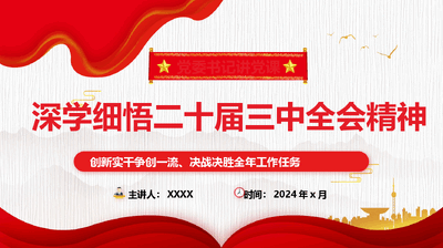 深学细悟二十届三中全会精神创新实干争创一流、决战决胜全年工作任务主讲人:XXXX时间:2024年x月党委书记讲党课2024年7月15日至18日,举国瞩目、举世瞩目的党的二十届三中全会在北京胜利举行。改革开放后,党的历届三中全会都是研究改革,党的第二十届中央委员会第三次全体会议紧扣推进中国式现代化主题,是在以中国式现代化全面推进强国建设、民族复兴伟业的关键时期举行的一次十分重要的会议。全会听取和讨论了习近平总书记受中央政治局委托所作的工作报告,充分肯定了党的二十届二中全会以来中央政治局的工作,高度评价新时代以来全面深化改革的成功实践和伟大成就,深刻揭示了中国式现代化的科学内涵,审议通过了《中共中央关于进一步全面深化改革、推进中国式现代化的决定》(以下简称《决定》),为接下来五年的工作明确了目标、指明了方向。前言目录1回首来时路2迈向新征程3砥砺共前行第一部分回首来时路回顾改革开放以来党的历届三中全会十一届三中全会【划时代的】时间:1978年12月主题:拨乱反正,开启改革开放伟大历程重大意义:全会确定了解放思想、实事求是、团结一致向前看的指导方针,作出把工作重点转移到社会主义现代化建设上来和实行改革开放的决策。回顾改革开放以来党的历届三中全会十二届三中全会时间:1984年10月主题:改革从农村走向城市,推动经济体制改革重大意义:通过了《中共中央关于经济体制改