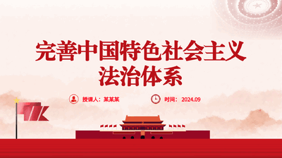来自版权所有来自版权所有完善中国特色社会主义法治体系授课人:某某某时间:2024.09全面推进依法治国的总目标是建设中国特色社会主义法治体系,建设社会主义法治国家。建设中国特色社会主义法治体系,就是要在党的领导下,形成完备的法律规范体系、高效的法治实施体系、严密的法治监督体系、有力的法治保障体系,形成完善的党内法规体系。党的二十届三中全会站在党和国家事业发展全局的战略高度,着眼以中国式现代化推进强国建设、民族复兴伟业,对完善中国特色社会主义法治体系作出新的重大决策部署。我们要加快建设中国特色社会主义法治体系,更好发挥法治固根本、稳预期、利长远的保障作用,为强国建设、民族复兴伟业提供坚实法治保障。前 言PREFACE1深刻认识完善中国特色社会主义法治体系的重大意义CONTENT目 录2认真总结中国特色社会主义法治体系建设的伟大成就3准确把握完善中国特色社会主义法治体系的正确方向4全面落实完善中国特色社会主义法治体系的重点任务PARTONE深刻认识完善中国特色社会主义法治体系的重大意义0101深刻认识完善中国特色社会主义法治体系的重大意义建设中国特色社会主义法治体系,是XXX法治思想的重要内容,是全面推进依法治国的总抓手。完善中国特色社会主义法治体系,对于进一步全面深化改革、推进中国式现代化具有重大而深远的意义。XXX强调:中国特色社会主义法治体系,本质上是中国特色