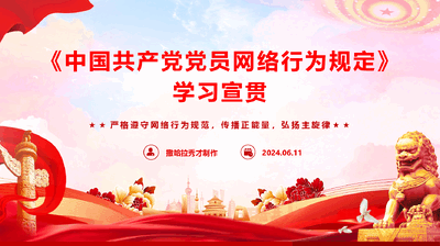 撒哈拉秀才制作2024.06.11《中国共产党党员网络行为规定》学习宣贯★★严格遵守网络行为规范,传播正能量,弘扬主旋律★★党的二十大报告强调,推进国家安全体系和能力现代化,坚决维护国家安全和社会稳定,做出了强化网络、数据安全保障体系建设,坚定维护国家政权安全、制度安全、意识形态安全等战略部署。2024年初,中共中央宣传部、中共中央组织部、中央网信办联合印发《关于规范党员干部网络行为的意见》(以下简称《规定》),要求党员干部严格遵守网络行为规范,在网络环境中也要行有所为、行有所止。前言PREFACE《规定》给党员网络行为划出了红线,彰显了党要管党、全面从严治党的坚定决心。全体党员干部要自觉坚守原则和底线,在网络行为中坚持正确政治方向,自觉宣传党的理论和路线方针政策,积极践行社会主义核心价值观,弘扬主旋律、传播正能量。前言PREFACE 二、强化底线思维,守牢网络意识形态阵地 一、严守政治纪律,严格遵守网络行为规范 三、强化协调联动,凝聚维护网络安全强大合力目录CONTENTS 四、《规定》全文学习1严守政治纪律,严格遵守网络行为规范一要牢固树立政治意识、大局意识、核心意识、看齐意识,坚决维护党中央权威,在思想上政治上行动上始终同以习近平同志为核心的党中央保持高度一致,严格遵守党规党纪,模范遵守国家法律法规,在网络行为中坚持正确政治方向,自觉宣传党的理