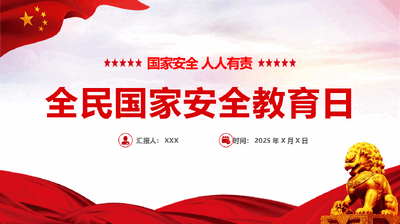 汇报人:XXX时间:2025年X月X日全民国家安全教育日国家安全 人人有责前言导读国家安全教育日全民国家安全教育日是为了增强全民国家安全意识,维护国家安全而设立的节日。2015年7月1日,全国人大常委会通过的《中华人民共和国国家安全法》第十四条规定,每年4月15日为全民国家安全教育日。目录Contents二危害国家安全罪相关法条内容三如何维护国家安全四工作中我们怎么做一树立国家安全意识第一部分树立国家安全意识COMMUNIST PARTY OF CHINA国家安全4月15日 国家安全教育日通过新的国家安全法,将每年4月15日定为全民国家安全教育日,通过多种形式开展国家安全宣传教育活动。主权统一和领土完整人民福祉 经济社会国家安全是指国家政权、主权、统一和领土完整、人民福祉、经济社会可持续发展和国家其他重大利益相对处于没有危险和不受内外威胁的状态,以及保障持续安全状态的能力。树立国家安全意识一树立国家安全意识一国家安全体系涵盖11种安全2014年4月15日,领导人在主持召开中央国家安全委员会第一次会议时提出,坚持总体国家安全观,走出一条中国特色国家安全道路。在这次会议上,领导人首次提出总体国家安全观,并首次系统提出11种安全。政治安全国土安全军事安全经济安全文化安全社会安全科技安全信息安全生态安全资源安全核安全树立国家安全意识一破坏国家安全的行为有哪些《中华人民共