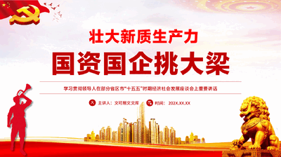 主讲人:文可居文文库时间:202X.XX.XX学习贯彻领导人在部分省区市十五五时期经济社会发展座谈会上重要讲话壮大新质生产力国资国企挑大梁上海历来是国资国企重镇,五个中心建设的方方面面都可见国资国企的身影。4月29日至30日,领导人在上海考察并主持召开部分省区市十五五时期经济社会发展座谈会。我们作为上海国资国企广大党员干部群众中的一块砖、一颗螺丝钉,应自觉走在深入学习贯彻领导人重要讲话精神的前列,紧紧围绕座谈会精神,化学习为动力,积极推动上海国资国企进一步深化改革、优化布局、强化功能,因地制宜发展新质生产力,在推进上海五个中心建设进程中更好地挑大梁、当主力。前言高起点谋划十五五01培育壮大新质生产力02打造科创耐心资本03加快推进产业升级04目录CONTENTS高起点谋划十五五Part01一、高起点谋划十五五双收官之年是十四五规划和国企改革深化提升行动的双收官之年关键之年是科学谋划十五五发展蓝图、开启新一轮改革攻坚的关键之年站在新的历史起点上国资国企广大党员干部要深入学习贯彻领导人在部分省区市十五五时期经济社会发展座谈会上的重要讲话精神统一思想、凝聚共识,以更高的站位、更实的举措谋划好十五五发展全局一、高起点谋划十五五上海市国资委党委书记、主任贺青指出国资国企将坚定不移贯彻党中央决策部署,聚焦服务国家战略,牢牢把握