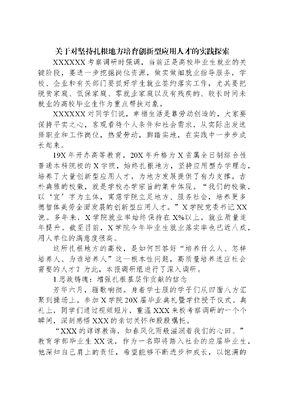 关于对坚持扎根地方培育创新型应用人才的实践探索XXXXXX考察调研时强调,当前正是高校毕业生就业的关键阶段,要进一步挖掘岗位资源,做实做细就业指导服务,学校、企业和有关部门要抓好学生就业签约落实工作,尤其要把脱贫家庭、低保家庭、零就业家庭以及有残疾的、较长时间未就业的高校毕业生作为重点帮扶对象。XXXXXX对同学们说,幸福生活是靠劳动创造的,大家要保持平实之心,客观看待个人条件和社会需求,从实际出发选择职业和工作岗位,热爱劳动,脚踏实地,在实践中一步步成长起来。19X年开办高等教育,20X年升格为X省属全日制综合性普通本科院校的X学院,始终扎根地方,坚持应用型办学理念,培养了大量创新型应用人才,为地方发展提供了有力支撑。古朴典雅的校徽,就是学校办学宗旨的集中体现。我们的校徽,以宜字为主体,寓意学院立足地方、服务社会,培养更多德智体美劳全面发展的创新型应用人才。X学院党委书记XX说。多年来,X学院就业率始终保持在X%以上,就业质量连年提升。截至目前,X学院今年毕业生就业落实率也已近八成,用人单位的满意度很高。这所扎根地方的高校,是如何回答好培养什么人、怎样培养人、为谁培养人这一根本性问题,高质量培养适应社会需要的人才?为此,本报调研组进行了深入调研。1.思政铸魂:增强扎根基层作贡献的信念芳华六月,骊歌响彻。身着学士服的学子们从四面八方汇聚到操场上,参加X学院20X届毕业典礼暨学位授予仪式。典礼上,同学们通过视频短片,重温XXX来校考察调研的一个个瞬间,深刻感悟XXX的亲切关怀和殷殷嘱托。XXX的谆谆教诲,如春风化雨般滋润着我们的心田。教育学部毕业生XX说,作为一名即将踏入社会的应届毕业生,他深知自己肩上的责任,希望能够不断进步和成长,以饱满的热情积极投身到教育事业实践中去。XXX的关怀让我热泪盈眶。文学与音乐艺术学部毕业生X说,一定要时刻牢记XXX嘱托,砥砺奋进,实干笃行。多年来,X学院站在为党育人、为国育才的政治高度,紧紧围绕立德树人根本任务和创新型应用人才培养目标,厚植大学生爱党、爱国、爱社会主义的情感,引导大学生把个人的发展融入国家和地方发展的需要中去。学校不仅充分利用各种资源讲好大思政课,做好课程思政,还通过第二课堂等方式,鼓励同学们走出校门,了解国情、增长才干,增强扎根这片土地作贡献的理想与信念。X月X日,一场精彩的分享会在学校博雅楼举办。来自教育学部的X名学生代表,分享了他们利用假期看望母校恩师的过程与感受。同学们绘声绘色地讲述老师的感人故事,引起强烈共鸣。大家纷纷表示,一定不负师恩,努力奋斗,奉献社会。这是我们的特色活动,通过寻找、整理、分享,让同学们在实践中受到思想洗礼,学习作为一名教师应该拥有的高尚品格。X学院教育学部负责人介绍,学部连续多年开展寻找感动我的老师活动,组织学生利用假期看望最感动自己的老师,在小组、班级和学部内分享老师的感人故事和先进事迹,每年编辑形成一部《X》故事集。X学院由原X师范高等专科学校与X教育学院X分院合并升格而来。学校在推进多学科发展的同时,始终保持着教育类专业的优势。教育学部通过寻找感动我的老师等第二课堂活动,强化大家扎根基层、追求卓越的内在动力与专业理想。近年来,X学院为X及周边区域,培养了超过一半的中小学和幼儿园骨干教师。地方教育部门、中小学和幼儿园一致评价,X学院的毕业生具有吃得苦、下得去、留得住、教得好的情怀和能力。进入X月,高温持续。骑手X送完一单外卖,在路口碰上了X学院城市YI爱馆的志愿者在派发绿豆汤。他取下头盔,文可居文库——海量学习资料,手机电脑均可下载www.wenkeju.com接过绿豆汤,一口就喝掉大半杯,边擦汗边说:谢谢你们啦,老朋友!我做骑手两年了,最大的问题是娃娃没人带,只能带着她一起送外卖。X说,X学院启动X志愿服务项目,不仅给骑手提供休息的房间、充电的车位,还可以搭伙做饭,最重要的是,志愿者帮忙辅导孩子做作业,解决了骑手的最大难题。帮助骑手这一群体更好融入城市,也让作为志愿者的我们收获了成长。X学院志愿者张玉婷说,虽没有物质上的报酬,但我们在精神上很满足。在多样的、深入的社会实践活动中,同学们加深了对学校所在地方的了解,增进了对自己所学专业的认同感和荣誉感,增强了扎根基层作贡献的信心和决心。2.产教融合:培养适应社会需要的能力XX县X镇X村的酒粮定制基地,三千多亩高粱大豆长势喜人。骄阳之下,来自X学院的博士专家服务团满头大汗,正忙着给村民指导田间管理技术:高粱太密,多的要拔掉,有病虫害的叶片也要及时清理这是博士服务团的工作常态。我们已向X各区县派出博士服务团30多支,重点在电子商务、锂电产业、文化旅游、农林渔业和基层治理等方面,提供智力服务。X学院学科