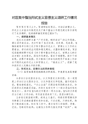 对区集中整治形式主义官僚主义调研工作情况报告X年X月X日上午,X调研组到X区,对该区官僚主义、形式主义自查自纠情况及关于集中整治工作意见建议等方面进行了走访调研,现将调研情况简要汇报如下:一、调研基本情况我们本次调研本着广开言路、畅所欲言的工作思路,通过召开座谈会,充分听取了X区纪委、发改委、民政局、X镇街道等单位部门关于集中整治形式主义、官僚主义工作的主要看法、存在的突出问题和意见建议。从整体情况来看,X区纪委能够按照市纪委《关于集中整治形式主义、官僚主义的行动方案》总体要求,深化作风建设,紧抓干部管理,提升干部素质,浓厚干事氛围,但少数部门和单位的党员干部身上仍存在不同形式的形式主义和官僚主义、痕迹主义,损害了党和政府在人民群众中的形象。二、形式主义、官僚主义的具体表现(一)在贯彻落实党的路线方针政策、中央重大决策部署方面1.存在以会议落实会议、以文件落实文件问题。在一定程度上存在以会议落实会议、以文件落实文件现象,重形式轻内容,重安排轻落实,文山会海问题没有得到根本改变。如区政府办反映截至目前,共收文X份文件(一部分是临时性机构发文),其中有X%的文件要求一周内办结,X%的文件要求当日或三日内办结,有些甚至是连夜下文,层层分解任务。2.存在过度留痕问题。痕迹主义盛行,将痕迹管理情况作为衡量工作成绩的重要标准和依据,不求过程,只讲结果,热衷于做表面文章。如在X工作中,要求每项工作拍照、录像、记实,忽略实际效果;在微信工作群内接龙回复收到,缺乏思考、对待工作敷衍了事。3.存在脱离实际,搞华而不实、劳民伤财的政绩工程、形象工程问题。大部分党员干部反映上级部门在做决策时不做调查研究,没有充分考虑基层的实际情况,致使决策偏离实际。如区里因创卫需要,要求X镇把X个矿区X个村内的旱厕全部拆除,改为冲水公用厕所,但其中一个村吃水困难,基本生活用水还需要骑着三轮车到办事处提水,改为冲水厕所根本不切实际,有的群众甚至称公用厕所太豪华,比自己的家建得都好,自己不配去那么好的厕所;X要求社区内每栋楼都要清理小广告,部分老楼重新刷漆,这些花费需要每个街道办事处自行承担,但街道办事处经费紧张根本负担不起。(二)在联系群众服务群众方面4.存在新官不理旧事问题。如X区旅游局X年巡察反馈后,时任局长郭X正接受纪委调查,没有抓好巡察整改工作。乔X调任旅游局局长后,也未对巡察整改工作进行部署安排,致使巡察问题整改迟迟无法落地。5.服务群众方面,存在新的官僚主义方式问题。经过集中整治,四风问题有所好转,但变异成门好进,脸好看,事难办了,服务群众停留在口头上,缺乏实际行动。X区民政局反映区内的X敬老院每年的年检问题,由于该敬老院所占用土地属以租代征土地,没有办理土地证,X年后办理消防证时必须要求提供土地证,故X年至今该养老院未办理消防证,没有消防证就没法进行每年的年检。(三)在履职尽责、服务经济社会发展方面6.存在不担当、不作为问题。部分座谈人员反映有些党员领导干部不担当、不作为,怕担责干脆不干活。如X区人防办部分党组成员履职尽责不到位,缺乏担当精神。区征收办巡察反馈后,副主任李X对自己承担党建方面的整改任务,没有采取任何措施进行落实,导致有关问题整改遥遥无期。另外,还存在责任强压推诿的情况,有些区级单位与基层签订责任文可居文库——海量学习资料,手机电脑均可下载www.wenkeju.com状,成为本级推脱责任的挡箭牌,免责单,将工作责任层层下压,最后将层层负责变成了层层负不起责,问责追责不是牵头负责单位,而是牵头单位转交的负责落实的单位。7.不顾实际情况,责任追究制度不经科学论断。如信访工作属地式问责,属地管理坑死人基层工作人员深有感触,按信访人的户籍所在地追责,即使信访人反映的问题不在本地区,也要由其户籍所在地承担接访任务,并进行非访追责;X工作中,要求谁丢分追谁责,但总分为X分,得分X分以上就可以了,追责制度形同虚设。(四)在学风会风文风及检查调研方面8.存在开会不研究真实情况、不解决实际问题,为开会而开会问题。部分干部反映以会议贯彻会议问题、陪会问题比较突出,不管大事小事、有无必要,动不动就开会,但开会只是简单念念文件、传达传达精神,讲空话、讲套话,并无实际内容,会议的名称也是五花八门,有些会议还指定一把手必须参会,一些视频会议为了凑人数,确定每单位参会人员人数,达不到标准就进行通报批评,很多干部将大量时间耗费在开会上,无法真正扑下身子抓落实。9.存在检查考核多,考核内容不务实问题。党员干部普遍反映基层检查考核过多、过滥,没有心思干工作。部分考核标准不科学过于形式、过于呆板、过于苛刻,没有操作性,重复考核的情况也普遍存在,甚至有些今天收到检查通知,明天就迎接检查,逼着应付作假