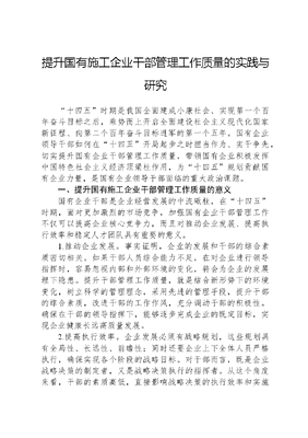 提升国有施工企业干部管理工作质量的实践与研究十四五时期是我国全面建成小康社会、实现第一个百年奋斗目标之后,乘势而上开启全面建设社会主义现代化国家新征程、向第二个百年奋斗目标进军的第一个五年。国有企业领导干部如何在十四五开局起步之时担当作为、实干争先,切实提升国有企业干部管理工作质量,带领国有企业积极发挥中国特色社会主义经济顶梁柱作用,为十四五规划贡献国有企业力量,是国有企业领导干部面临的重大政治课题。一、提升国有施工企业干部管理工作质量的意义国有企业干部是企业经营发展的中流砥柱,在十四五时期,面对更加激烈的市场竞争,加强国有企业干部管理工作不仅可以提高企业核心竞争力,而且对推动企业发展、提高执行效率和稳定人才团队具有重要的意义。1.推动企业发展。事实证明,企业的发展和干部的综合素质密切相关。如果干部人员综合能力不足,在对企业进行领导指挥时,容易忽视内部和外部环境的变化,将会为企业的发展埋下隐患。提升干部管理工作质量,就是结合新形势下的环境变化,树立科学的管理理念,采用先进的管理手段,提升干部的综合素质,改进干部的工作作风,充分调动干部的积极性。确保在干部的领导指挥下,能够逐步完成企业的既定目标,实现企业健康长远高质量发展。2.提高执行效率。企业发展必须有战略规划,这些规划具有全局性、长远性、前瞻性;同时还要企业上下全体人员严格执行,确保实现各个阶段的战略目标。对干部而言,既是企业战略决策的制定者,又是战略决策执行的指挥者。从这个角度来看,干部的素质高低,直接影响战略决策的执行效率和实施成果。提升干部管理工作质量,不但有利于干部科学合理地制定战略规划,安排工作,对人力、物力、财力进行合理配置,而且员工也能积极配合上级的管理工作,从而提高战略决策的整体执行效率,推动企业向着正确的发展方向前进。3.稳定人才团队。在企业的发展历程中,涉及投标、采购、配送、营销、服务等多个环节,管理工作点多面广,生产安全、工程质量、经济效益、社会效益均要兼顾到,这就要求构建一支稳定的人才团队,既要各司其职,又能团结合作,从而实现企业制定的战略目标。提升干部管理工作质量,是企业发现人才、留住人才的保障,能够有效避免人才大量流失。提升干部管理工作质量,要从基层干部的选拔和聘用入手,提高干部的准入门槛,促使选拔聘用机制良好运行,实现人力资源管理的良性循环。近年来,国际经济、政治环境日益复杂,突发性政治、公共卫生事件日益增加。随着全球经济进一步深度融合和国内产业结构的优化升级到来。国有施工企业承接了诸多国内外大型施工项目,与国内和其他国家的行业竞争对手在全球经济一体化大环境下展开了激励地竞争。为此,国有施工企业必须深入挖掘自有人才潜力,提升干部管理工作质量,增强国企核心竞争力。国企只有不断加强自身干部队伍建设,提高企业干部的业务能力及管理水平,打造一支专业强、有担当、高素质的干部队伍,保证企业能够有效抵御、规避风险,在复杂多变的形势中顽强生存。二、当前国有施工企业干部管理工作存在的主要问题(一)干部外部流动流失速度过快。在20世纪80年代以前,我国长期实行计划经济,国有企业竞争意识相对缺乏。随着改革开放不断深化,国企不断改组,市场竞争意识觉醒,行业内部的竞争也愈演愈烈。现在的市场竞争迥异于传统企业间资本、技术、产品和服务的竞争,管理制度和人才资源日渐成为企业间角逐的重要资本。在国有施工企业,一定范围内的人文可居文库——海量学习资料,手机电脑均可下载www.wenkeju.com员流通可以促进企业梯队稳定,增强企业造血能力,从而提升企业整体人才质量。企业管理干部流动速度过快则会造成企业人才质量下降,以致出现断档,不利于企业持续发展。在这种情况下,公司中层领导干部的提拔任用速度也越来越快,在一定程度上导致了领导干部工作能力水平参差不齐的情况。再加上私营和外企优厚待遇的招揽,也造成了国有企业干部流动流失严重,对国企干部管理工作造成了较为不利的影响。(二)干部选拔任免考核流程不全面。目前,许多国有企业都已建立比较完善的干部选拔制度,明确规定出干部选拔任免的考核标准和程序流程,为干部人事任免提供明确合理的制度依据,在企业执行过程中,基本都可按照人事管理流程进行。虽然流程公正公开,但有些国企仍然会出现结果不公平的现象,主要是因为干部评价考核标准不够全面客观,考察结果较多受到人为主观因素的影响。(三)干部人事内部流动性较差。当前,我国一些国有企业并没有建立健全与现代市场经济制度相适应的干部人事管理机制,人事制度较为僵化,普遍存在易进难出、易上难下的现象。一方面,对于某些关键岗位的领导干部而言,对其考核和激励的办法不够全面,在激发领导干部工作积极性时,绩效考核所能产生的积极影响相对较小。另一方面,有些企业仍显示出人事管理方法创新不足、缺乏流动性的特