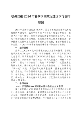 机关党委2024年春季学期政治理论学习安排意见2024年是新中国成立75周年,是全面贯彻落实党的XX大精神的关键之年,也是学校实现十四五规划目标任务,推进双一流建设、实现内涵式高质量发展的攻坚之年。为坚定不移加强机关各项建设,推进机关党建工作高质量发展,着力提升机关教职工队伍综合素质和工作效能,根据学校党委工作安排,对2024年春季学期政治理论学习作出如下安排:一、指导思想坚持以XXX新时代中国特色社会主义思想为指导,全面贯彻落实党的XX大和二十届二中全会精神,深入学习贯彻XXX文化思想,认真贯彻落实XXXXXX关于教育、科技、人才的重要论述,深刻领悟两个确立的决定性意义,增强四个意识、坚定四个自信、做到两个维护,巩固拓展主题教育成果,推动党史学习教育常态化长效化,以加快推进双一流建设、实现内涵式高质量发展,投身教育强国建设为主线,不断加强理论武装,持续强化思想引领,拼搏实干、奋进争先,为开创学校事业发展新局面提供有力的思想保证、精神动力、舆论支持和文化条件,以优异的成绩迎接新中国成立75周年。二、学习内容(一)学习贯彻XXX新时代中国特色社会主义思想深入学习领会XXX新时代中国特色社会主义思想的核心要义、基本精神、实践要求,掌握贯穿其中的马克思主义立场观点方法,不断巩固拓展主题教育成果。学习《中共中央办公厅关于巩固拓展学习贯彻XXX新时代中国特色社会主义思想主题教育成果的意见》,始终做XXX新时代中国特色社会主义思想的坚定信仰者和忠实实践者;持续深入学习XXXXXX关于教育的重要论述,牢牢坚持社会主义办学方向;学习XXX文化思想,通过九个坚持十四个强调七个着力,深刻把握XXX文化思想产生的时代背景、丰富内涵和重大意义,有效应对意识形态领域的各种挑战;学习中华民族共同体意识,充分理解铸牢中华民族共同体意识,建设中华民族共有精神家园是XXX文化思想的重要内容。(二)持续深化党史学习教育开展党史学习教育,充分发挥党史以史鉴今、资政育人的作用,是党和国家工作大局中的一件十分重要的工作。中共中央印发的《党史学习教育工作条例》,对党史学习教育的领导体制和工作职责、内容、主要形式、保障和监督等作出全面规范,是开展党史学习教育工作的基本遵循。各单位要认真抓好《党史学习教育工作条例》的学习宣传和贯彻落实,把学习党的创新理论和党史基本内容、党的历史结论、党的历史经验、伟大建党精神贯通起来,把党史学习教育同做好中心工作结合起来,做到学史明理、学史增信、学史崇德、学史力行,把学习成果转化为干事创业的强大动力,不断推动党史学习教育常态化长效化。(三)学习贯彻党的二十届三中全会精神原原本本、全面准确学习领会XXXXXX在党的二十届三中全会上的重要讲话精神,认真研读党的二十届三中全会文件,深刻理解党的二十届三中全会提出的一系列重大理论观点、重大工作部署,自觉把思想和行动统一到全会精神上来。(四)学习贯彻2024年全国两会精神第十四届全国人民代表大会第二次会议和政协第十四届全国委员会第二次会议,分别于2024年3月5日和3月4日在北京开幕。各单位要认真组织学习贯彻全国两会精神,把思想和行动统一到中央的部署要求上来,贯彻落实到教学、科研、管文可居文库——海量学习资料,手机电脑均可下载www.wenkeju.com理、服务等各项工作中去。(五)学习贯彻中央关于意识形态工作的部署和要求意识形态工作是党的一项极端重要的工作,事关党的前途命运,事关国家长治久安,事关民族凝聚力和向心力。高校是意识形态工作的重要领域和前沿阵地。各单位要压实意识形态工作主体责任,旗帜鲜明反对历史虚无主义、民族分裂主义、宗教极端主义,建立健全意识形态工作各项制度,压紧压实意识形态工作责任制,切实提高意识形态领域治理能力,牢牢把握意识形态工作领导权、主动权、话语权。(六)学习《中国共产党纪律处分条例》等应知应会党内法规和国家法律纪律严明是党的光荣传统和独特优势。《中国共产党纪律处分条例》作为规范党组织和党员行为的基础性法规,是党组织执行和维护纪律的基本标尺。党的十八大以来,党中央先后3次修订《中国共产党纪律处分条例》,始终坚持严的基调,不断完善纪律规矩,释放了全面从严治党越往后执纪越严的强烈信号,充分彰显了党推进自我革命的坚定决心和坚强意志。各单位要把《中国共产党纪律处分条例》纳入理论学习内容,深刻认识和把握此次修订的重要意义和主旨要义,切实强化纪律执行,真正使铁的纪律转化为日常习惯和自觉遵守。同时,各单位要结合教育部有关文件要求,组织领导干部全面系统学、突出重点学、结合实际学,准确理解把握应知应会要求,把学习成果转化为依法决策、依法办事的行动自觉。具体学习内容可参考《教育系统领导干部应知应会党内法规和国家法律清单》。三、学习时间各