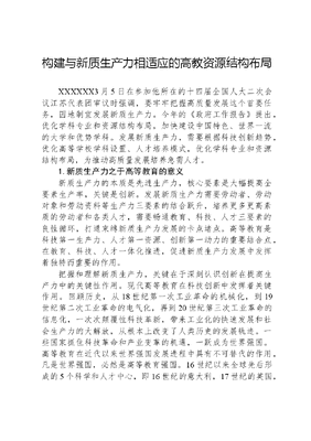 构建与新质生产力相适应的高教资源结构布局XXXXXX3月5日在参加他所在的十四届全国人大二次会议江苏代表团审议时强调,要牢牢把握高质量发展这个首要任务,因地制宜发展新质生产力。今年的《政府工作报告》提出,优化学科专业和资源结构布局,加快建设中国特色、世界一流的大学和优势学科。发展新质生产力,需要根据科技创新趋势,优化高等学校学科设置、人才培养模式,优化学科专业和资源结构布局,为推动高质量发展培养急需人才。1.新质生产力之于高等教育的意义新质生产力的本质是先进生产力,核心要素是大幅提高全要素生产率,关键是创新。发展新质生产力需要劳动者、劳动对象和劳动资料等生产力三要素的结合跃升,培养更多更高素质的劳动者和各类人才,需要畅通教育、科技、人才三要素的良性循环,打通束缚新质生产力发展的卡点堵点。高等教育是科技第一生产力、人才第一资源、创新第一动力的重要结合点,在教育、科技、人才一体化推进,促进新质生产力发展中发挥着独特而重要的作用。把握和理解新质生产力,关键在于深刻认识创新在提高生产力中的关键性作用。现代高等教育在科技创新中发挥着关键作用。回顾历史,从18世纪第一次工业革命的机械化,到19世纪第二次工业革命的电气化,再到20世纪第三次工业革命的信息化,一次次颠覆性科技革新,带来工业化的快速发展和社会生产力的大解放,从根本上改变了人类历史的发展轨迹。一些国家抓住科技革命和产业变革的机遇,一跃成为世界强国。高等教育在近代以来世界强国发展进程中具有不可替代的作用,凡是世界强国,必然是高等教育强国。16世纪以来全球先后形成的5个科学和人才中心,即16世纪的意大利,17世纪的英国,18世纪的法国,19世纪的德国,20世纪的美国。他们既是当时的科学和人才中心,也是当时的高等教育中心。教育、科技、人才三位一体发展,在促进科技创新和生产力发展中发挥着关键作用。国际经验和人力资本理论与实践表明,现代教育的普及和发展有利于提升人力资本,提高全要素生产率,从而实现经济的可持续发展。但是,在经济发展的不同阶段,不同类型层次的教育所发挥的作用不同。在经济发展处于中低水平阶段,基础教育发挥的作用更为显著,但当人均GDP突破1万美元关口,人均收入水平向高收入阶段迈进的过程中,高等教育发挥的作用更大。2023年,我国高等教育在学总规模为4763.19万人,高等教育毛入学率达到60.2%,高等教育普及化程度进一步提高。为助力发展新质生产力,我们需进行资源结构布局优化,扩大高等教育资源总量供给,促进优质高等教育资源扩容,提高高等教育资源投入效益,化解高等教育结构性短缺与布局不合理短板,将资源投入高等教育发展的重点领域和薄弱环节,以资源结构布局优化促进和实现高等教育高质量发展。具体而言,我们一方面要加大优质高等教育资源供给,进一步创造更多优质高等教育的入学机会,另一方面要提高战略性人才、高层次人才和紧缺型人才等急需人才的自主培养能力,构建高质量人才自主培养体系。2.建立与新质生产力相适应的人才培养体系发展新质生产力,既需要牵引源头创新的基础学科、交叉学科和新兴学科的拔尖人才,也需要服务新型工业化的工程技术人才和大国工匠、能工巧匠,更需要一大批投身中国式现代化的德智体美劳全面发展的社会主义建设者和接班人。发展新质生产力需要各级各类高等教育人才、各层次高等教育都要实现高质量发展。但是,从新质生产力发展需要看,从国际高等教育发展趋势看,高等教育各层次并不是均衡发展,也不是一成不变,需要根据经济社会发展尤其是科技进步趋势,进行适文可居文库——海量学习资料,手机电脑均可下载www.wenkeju.com度调整优化。从国际发展经验看,在高等教育从精英阶段向大众化发展的进程中,主要是增加高等职业教育和应用型人才培养数量,从而扩大高等教育规模,实现大众化和普及化。但是,在高等教育普及化之后,高等教育结构会发生较大变化,主要体现在研究生教育的快速发展和以研究型大学为代表的高等教育资源的扩张,高等教育层次结构的重心会逐步上移,即研究型大学和研究生教育在高教体系中的占比提高。目前,我国高等教育层次结构呈现金字塔型,高职为主的专科教育与应用型本科为主的本科教育占据了人才培养的主体部分,研究生教育虽然有所发展,但是在高等教育人才培养中的占比仍然偏低。2023年,我国在学博士生61.25万人,在学硕士生327.05万人,研究生在高等教育总规模中的占比达到10%左右,应该说增速还是较快的。但同期发达国家(地区)这一指标的平均水平达到20%以上,OECD(经济合作与发展组织)国家为24.4%,欧盟更是高达32.7%。2023年,我国普通、职业本专科共招生1042.22万人,其中,普通本科招生478.16万人,职业本科招生8.99万人,高职(专科)招生555.07万人,高职高专招生占比仍然