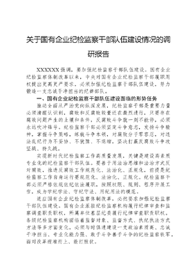 关于国有企业纪检监察干部队伍建设情况的调研报告XXXXXX强调,要加强纪检监察干部队伍建设。国有企业纪检监察体制改革以来,中央对国有企业纪检监察干部履职用权提出更高更严要求,必须加强纪检监察干部队伍建设,努力锻造一支忠诚干净担当的纪律部队。一、国有企业纪检监察干部队伍建设面临的形势任务推动全面从严治党向纵深发展,纪检监察干部是重要力量必须清醒认识到,腐败和反腐败较量还在激烈进行,只要存在腐败问题产生的土壤和条件,反腐败斗争就一刻不能停,必须永远吹冲锋号。纪检监察干部必须坚定斗争意志,发扬斗争精神,掌握斗争策略,练就斗争本领,对腐败分子零容忍,对违法乱纪行为不妥协、不犹豫、不退缩,坚决打赢反腐败斗争攻坚战、持久战。实现新时代纪检监察工作高质量发展,关键是建设高素质专业化的纪检监察干部队伍。要善于用法治思维和法治方式反对腐败,推进反腐败工作规范化、法治化、正规化,前提是纪检监察工作自身运行要规范化、法治化、正规化。纪检监察干部必须严格依规依纪依法履职,按照权限、规则、程序开展工作,成为学纪学法、守纪守法、用纪用法的模范。适应国有企业纪检监察体制改革,必然要求加强纪检监察干部队伍建设。国有企业派驻纪检监察机构履行纪律审查和监察调查职责职权,所属单位基层纪委履行纪律审查职责职权。各级纪检监察机构面临着监督对象、监督方式、执纪执法方式方法等多方面变化,必须与时俱进建设一支政治素质高、忠诚干净担当、专业化能力强、敢于斗争善于斗争的纪检监察铁军,面对改革迎难而上、能打胜仗。二、国有企业纪检监察干部队伍建设存在的问题政治素养有待提升。国有企业与市场、客户接触频繁,纪检监察干部难免受市场环境和不良风气影响,往往更重视对企业主营业务的学习,也更擅长与企业主营业务相关的违纪问题线索的处置,对全面从严治党的新部署新要求学习不深刻,对纪检监察机关的政治属性认识不够,缺乏政治敏锐性。核心能力有待锻炼。纪检监察干部在查处职务违法职务犯罪问题的同时,对措施使用、人员管辖、法规条款适用等具体问题把握不准确,收集证据不充分、证据链不闭合,重结果、轻程序;审查调查工作方法少,调查取证、审计查账、谈话等锻炼不够;对企业内各领域违纪问题的纪法衔接运用上把握不准。敢于斗争、善于斗争意识有待增强。国有企业利益输送、关联交易等新型腐败问题较为隐蔽,纪检监察干部对苗头性、倾向性问题发现不及时,或者发现了也不重视、避而远之,没有做到早纠正、早处理,咬耳扯袖、红脸出汗做得不够。自我监督管理的意识还不强,拿手电筒照别人多,照自己少。三、思考与建议通过落实新时代党中央有关纪检监察干部队伍建设的要求梳理分析各地区、各单位纪检监察干部队伍建设典型经验,结合学术界对胜任力要素模型的相关研究,梳理归纳纪检监察干部三大类、9项胜任力要素,建立能力素质模型。其中,政治素养是前提;专业能力是关键;岗位特质是保障。按照该模型,对新形势下国有企业加强纪检监察干部队伍建设提出如下对策建议:健全准入机制。一是科学制定编制标准。逐步调整专职纪检人员核定的标准,以集团内党员和监察监督对象作为基数,如比例可以定为1001∶,即每100名监督对象设置1个专职纪检人员编制,在专职配备难以达标的情况下设置兼职纪检监察干部,但专兼职比例保持在合理范围,确保监督力量充足。二是文可居文库——海量学习资料,手机电脑均可下载www.wenkeju.com完善资格准入制度。规范干部选调录用工作,严格标准、条件和程序,坚持凡进必考,注重从基层遴选政治过硬的优秀年轻干部,选调具有法律、财会、审计、经济、金融、工程建设等方面专业知识的高学历人才,优化各级干部队伍的专业知识结构。三是严格考试选拔流程。在公共考试之外增加专业性考试,考查纪法知识,评估履职技能水平。在面试环节,按照科学性原则,针对每个岗位建立情景模拟、专业能力测试的题库,考查个人性格特点,确保能够选拔出适应岗位要求的优秀人才。加大培养使用。一是抓实全员培训。加强培训顶层设计,综合考虑干部层级、职务、专业,力求达到全覆盖与针对性相结合。丰富培训内容,涵盖政治、业务、作风等内容。创新培训方式,注重线上培训和日常自学,强化线下实战和跟案学习,提升灵活运用政策、执纪执法水平。二是加强实践锻炼。建立纪检监察干部骨干人才库,选送优秀骨干赴上级纪委监委参与重大专案和专项工作,利用以案代培以干代训等方式选拔基层单位年轻纪检干部参与联合审查调查工作,在实践中增强对严的基调和纪法知识的认识和运用能力。三是实行干部交流轮换。定期实施轮岗,在监督检查、线索处置、审查调查、案件监督管理、干部监督等岗位之间进行轮换。加强系统内外干部交流,既把系统外的优秀干部选进来,注入新鲜血液,也把系统内的优秀干部交流出去,在新的岗位上锻炼成长,形成优进高出的良性循环。科学考核激励。一是健