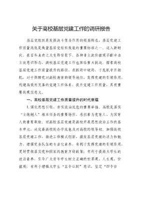 关于高校基层党建工作的调研报告基层党组织是发挥战斗堡垒作用的根基所在,基层党建工作质量高低是衡量基层党组织效能的重要标准之一。迈入新时代,在百年未有之大变局背景下,各种非主流价值观不断冲击主流意识形态,高校基层党建工作也面临重大挑战。探索高校基层党建工作质量提升的路径,在困局中破局,于危机中开新机,对于保障党对高校教育的领导地位,发挥党建的引领作用,构建高效而完善的党建工作体系,提升党建工作质量,具有重要的现实意义。一、高校基层党建工作质量提升的时代意蕴1.强化思想引领、夯实政治底色的重要举措。高校是落实立德树人根本任务的重要场所,承担着为党育人、为国育人的重要职能。而高校基层党建是高校开展思想政治工作的基本单元,决定着高校的办学底色及对高校的领导权。加强高校基层党建工作,推进工作模式创新,激发基层党建的活力和魅力,增强党务队伍的专业化素养,有利于发挥党建的引领作用,更好贯彻落实党和国家的教育方针政策;有利于提高大学生的政治素养,引导广大青年学生树立正确的世界观、人生观、价值观;有利于增强大学生五个认同意识,坚定四个自信、做到两个维护。以党建发挥思想引领作用,可以夯实高校育人底色,赓续红色血脉,培养出合格的社会主义建设者和接班人。2.落实三全育人理念、增强育人实效的关键环节。三全育人即全员、全过程、全方位育人。XXXXXX指出,加强和改进高校党的建设,是办好中国特色社会主义大学的根本保证。基层党建工作是高校整体党建工作的基础环节,亦是三全育人的应然之义,基层党建工作质量高低也是衡量是否践行三全育人理念的重要标准之一。提升基层党建工作质量,有利于落实三全育人理念,提升学生的综合素养。加强党务组织领导,统筹支部书记、支部委员、专职辅导员及广大党员教师的工作,开展常态化沟通,发挥育人合力,是全员育人的重要支撑。以党建引领确立学业导师制,由点到面,由低年级到高年级,实现学业全程指导,推动思政育人和党性育人同向同行,是全过程育人的重要落脚点。只有强化基层党建工作,促进党建育人、思政育人,以党建融合专业教育,推动党建和专业教育协同育人,才能发挥育人合力,实现全方位育人。3.促进教育改革、破解育人难题的有效途径。高校党建工作是高等教育改革发展的重要推动力,为高等教育改革发展提文可居文库——海量学习资料,手机电脑均可下载www.wenkeju.com供坚实的政治保障。随着信息技术的广泛应用,各种信息技术手段应运而生,各种非主流价值观纷然杂陈,使高等教育在面临重大机遇的同时,也面临严峻挑战。高校基层党建工作守正创新,是助力高等教育改革抓住机遇应对挑战的坚强后盾。高校基层党建不断创新工作方式方法,优化管理机制,提升破解育人问题的针对性,有助于发挥其排头兵作用,促进高等教育改革发展。二、高校基层党建工作存在的问题高校基层党建在凝心聚力、推进教育改革、强化组织领导方面发挥了重要作用,有效保障了社会主义社会制度下大学的政治底色和鲜明特色。然而,在复杂多变的现实环境下,仍有部分高校基层党组织在开展党建工作过程中存在创新性不足、管理机制不健全、党务队伍综合素质不高等现实问题。破解这些难题是强化党建工作、提升工作质量的必然要求。1.高校基层党建工作缺乏创新性。高校基层党建工作要不断守正创新,才能适应形势变化的新要求。然而,部分高校基层党组织由于理念更新不快、工作任务繁重、党务队伍人数不足等原因,工作模式单一化,工作方式方法简单。首先,新媒体未能有效赋能党建工作。部分高校基层党组织没有充分利用新媒体技术,互联网+党建意识不强,由此也限制了党员文可居文库——海量学习资料,手机电脑均可下载www.wenkeju.com教育的实效性,未能精准聚焦以适应时代发展的新常态。其次,部分基层党支部仍侧重于采用传统方式开展党建工作,单纯以讲座、会议等形式完成主题教育等系列活动,重数量、轻质量,缺乏创新动力,尽管完成基本规定动作,却忽视了党建效能的发挥和党员干部的获得感。2.高校基层党建工作管理机制不健全。加强高校基层党建工作,要明晰基层党组织工作由谁来开展、怎样开展、如何发挥党务工作人员作用等问题。然而,部分高校没有结合高校二级院系的实际设置基层党组织,基层党组织无法发挥组织保障和协同合作的效能。部分基层党支部指标体系建设不清晰,只是完成了规定动作,在如何加强品牌建设,发挥和增强基层党组织的影响力和引领力方面并不尽如人意。部分基层党组织激励机制不健全,评价和考核体系有待优化,部分党务工作者以躺平心态面对日常党务工作,没有发挥自身的应有作用。3.党务工作队伍综合素质不高。高素质的党务者工作队伍是强化党建工作的根基,党务工作队伍的素质高低直接影响党建工作的质量。然而,部分高校基层党组织对党务工作队伍建