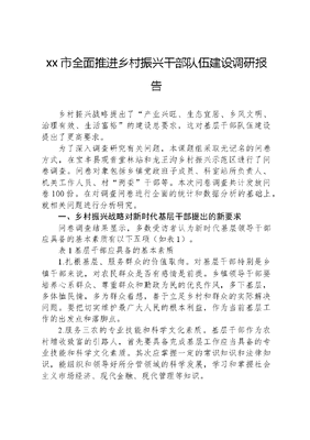 xx市全面推进乡村振兴干部队伍建设调研报告乡村振兴战略提出了产业兴旺、生态宜居、乡风文明、治理有效、生活富裕的建设总要求,这对基层干部队伍建设提出了更高要求。为了深入调查研究有关问题,本课题组采取无记名的问卷方式,在宝丰县观音堂林站和龙王沟乡村振兴示范区进行了问卷调查。问卷对象包括乡镇党政班子成员、科室站所负责人、机关工作人员、村两委干部等。本次问卷调查共计发放问卷100份。在对调查问卷进行全面的统计和数据分析的基础上,就相关问题进行分析研究。一、乡村振兴战略对新时代基层干部提出的新要求问卷调查结果显示,多数受访者认为新时代基层领导干部应具备的基本素质有以下五项(如表1)。表1基层干部应具备的基本素质1.扎根基层、服务群众的价值取向。对基层干部特别是乡镇干部来说,对农民群众是否有感情是前提。乡镇领导干部要培养心系群众、尊重群众和勤政为民的优良作风,多下基层,多体恤民情,多为群众着想,善于立足乡村和群众的实际解决问题。要把切实维护最广大人民的根本利益,作为当前基层工作的出发点和落脚点。2.服务三农的专业技能和科学文化素质。基层干部作为农村增收致富的引路人,首先要具备完成基层工作应当具备的专业技能和科学文化素质。其次应掌握一定的常识知识和法律知识,能组织和领导好所分管领域的科学发展,学习和掌握社会主义市场经济、现代金融、现代管理等知识。3.健康的身心素质。身体是革命的本钱,健康的身心素质也应该是优秀基层干部的标配。上面千条线、下面一根针基层工作的复杂性,要求基层干部时刻保持充沛的精力和丰富的创造力,能用清醒的头脑准确无误地观察和判断事物;基层工作的长期性要求干部要有坚定的信心、坚强的毅力、果断的性格、豁达乐观的心胸。此外,基层岗位和工作的艰苦还要求基层干部有强健的体魄,注重心理素质的培养和自身素质与性格的塑造。4.能与群众打成一片的人格魅力。实践证明,乡镇领导干部走村入户、深入群众是做好群众工作的基础。领导干部只有心里有群众,眼中有乡亲才能走进群众心里,取得群众的信任,获得群众的拥护。化解基层社会矛盾要求基层领导干部在依法依规、按政策办事的前提下,带着深厚的感情去做群众工作,要多教育、疏导、协商、调解,防止强迫、命令、颐指气使、滥用权力等简单粗暴的方式去激化矛盾。5.其他能力。首先是学习能力。基层领导干部要坚持向书本学习,向身边的老同事学习,向人民群众学习。要善于总结经验教训,不断提高解决复杂问题的能力和水平。其次要有较强的文字和口头表达能力。基层领导干部做好基层工作需要较强的文字和口头表达能力。出通知、发告示、写汇报材料和工作总结都需要文字功底,做好基层群众工作特别需要有很强的语言表达能力。再次要有较强的化解矛盾、处理危机的应急应变能力。当前,城乡发展不平衡,造成新矛盾、新问题层出不穷、错综复杂,这一点在基层更加突出。基层干部处在各种矛盾和问题相互交织的第一线,因此必须具备发现矛盾的敏锐、正视矛盾的清醒、直面矛盾的勇气和化解矛盾的自觉。二、当前基层领导干部队伍建设的现状(一)新时代基层领导干部队伍建设的成绩1.坚持党管干部原则,选拔了一大批对党忠诚的优秀干部进入乡镇领导班子。根据问卷调查,超过90%的受访者认为自文可居文库——海量学习资料,手机电脑均可下载www.wenkeju.com党的十八大(特别党的十九大)以来基层干部队伍整体水准在上升;对当前基层干部道德素质的评价中超过86%的受访者表示基本满意;认为乡村振兴战略中最关键的因素是基层干部的超过63%。2.坚持德才兼备、以德为先的原则,促进了乡镇领导干部队伍整体素质的提高。新时代乡镇领导干部的选拔坚持把德才兼备、以德为先作为选人用人的前提条件,注重选拔任用那些确有真才实学、能力突出的干部。特别从理想信念、政治品格、工作作风和道德品行等方面对干部的德进行评价,选出了一大批德才兼备的好干部。(二)基层干部队伍建设存在的主要问题和原因分析1.新时代基层领导干部队伍建设存在的主要问题。根据问卷调查,超过90%的受访者认为自党的十八大(特别党的十九大)以来基层干部队伍整体水准在上升,但只有40%的受访者认为当前基层干部队伍的整体素质很好,与乡村振兴战略的要求差距较大。2.我国乡镇领导干部队伍建设存在问题的原因分析(1)干部培养选拔机制不够优化。根据调研,90%以上的受访者认为当前基层干部建设存在的最大的问题是乡镇普通干部的培养选拔机制不够优化,优秀的干部难以提拔,而能力素质差、混天过日的人却得不到处理。乡镇队伍越来越难带,好多领导干部的精力被内耗在如何绞尽脑汁激励普通干部干事业上。(2)对基层干部的关怀激励机制不足。当前基层干部特别是乡镇干部身处基层最底端,矛盾多、任务重、工作环境差、工作压力大,待遇却不高,晋升机会也少,难以安心工作。三、加强基层