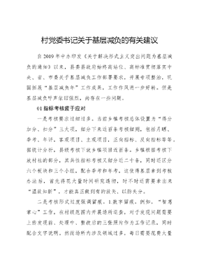 村党委书记关于基层减负的有关建议自2019年中办印发《关于解决形式主义突出问题为基层减负的通知》以来,县委县政府始终高站位、高标准贯彻落实中央、省、市委关于基层减负工作部署要求,开展专项整治,巩固拓展基层减负年工作成果,工作作风进一步好转。但是基层减负呼声依旧强烈,尚存在一些问题。01指标考核疲于应对一是考核要求过细过多。当前乡镇考核总体设置为得分加分、扣分三大项,细分下来近百条考核细则,包括月晒、季考、年评,客观项目、主观项目,正向指标、反向指标等等。据统计分析,县级考核下放乡镇项目近百条。乡镇根据考核下放村社的部分,其共性指标考核又细分近二十条,同时还区分六个板块和三个小组,配合季考和年考,这使得基层拿到考核办法后,首先得花大量时间研究透彻,时不时还需要拿出来温故知新,才能真正做到有的放矢、以防失分。二是考核形式过度强调留痕。1.数字留痕。例如,智惠掌心工作,在村级范围内开展场所巡查,对于发现问题需要上传发现前、处理中、整改后的三张照片作为工作记录,同时配合文字说明。然而场所内涉及领域过多,每日需要花费大量时间拍摄照片并上传,还可能出现由于照片角度等填报问题不得不再次上门拍摄的情况。2.纸质留痕。除了数字记录之外,仍然需要纸质台账来配合考核检查,台账的整理是极其繁重的过程,有的条线甚至需要多本台账,极大地增添了基层干部的工作负担。有的干部坦言,往往是用一半精力工作,用另一半精力来证明自己是在工作。3.创建留痕。虽然上级三令五申要减少村级的各类工作室、横幅广告、宣传标语、上墙资料等,但每年村级为此支出的经费仍是一笔较大的经济负担。02指尖负担日趋繁重一是软件下载繁多。据了解,当前乡镇、村两级共涉及使用各类系统、手机APP程序多达159个,平均每名村干部手机上至少安装10多个APP程序。而且部分系统都需要独立的账号和密码,对于密码的设定也要求不一。在日常开展工作、周期更新数据、年底考核信息时,村干部不得不对照不同账号密码,来回切换登陆。二是信息重复录入。由于不同政务系统有着跨层级、跨部门的建设主体,不同条线存在数据信息壁垒,基层干部需将相同信息重复录入到不同的系统中。例如房屋相关的几个系统,从事该条线的干部反映,房屋基础信息一般情况下是不会变化的,但是新系统由于数据不流通,干部不得不重复下村摸排、文可居文库——海量学习资料,手机电脑均可下载www.wenkeju.com重复手动输入信息。又如相同的文化活动信息需重复上传到文化礼堂和智慧文化云2个系统之中。三是指尖任务过多。为激发系统使用活跃度,将平台登入量、点击率、使用率、阅读量纳入对乡镇的考核,乡镇又将压力传导到村社,原本对管理工具服务工具的信息化建设变成了硬性指标。据了解,村社干部每人会连接到多个条线任务,部分APP还要求每日签到打卡、定时签到签退、按要求挂时长等,最终只提升了后台活跃度。例如志愿xx浙影通警钟农家书屋等,导致基层干部不得不按时来回切换登录、固定时间签到打卡,增加了基层工作量。就拿政协委员来说,2022年省市两级要求开展网上学习、评论跟贴的次数也不少。03精神压力日益凸显一是人员力量应付不及。据调查统计村社干部人员数量,包括两委加村聘人员往往10名不到,一名干部对接4-5个条线的任务,个别干部还肩负整个片区的任务,有时候存在时间冲突,来不及协调,难免手忙脚乱,不仅影响工作质量,也会导致干部疲于应付,担心工作无法顺利完成,从而产生心理压力。二是工作开展推进不易。其实很多日常考核都会涉及到群众参与,但由于次数频繁、过程复杂、沟通不到位等原因,容文可居文库——海量学习资料,手机电脑均可下载www.wenkeju.com易引发基层群众反感。例如,反诈APP安装推广,单月需完成一定数量的各类打卡式任务,xx好人评选需在微信公众号上点赞等。而且村内住户大多数为老人在家,老年机无法安装,使用智能机还需要村干部上门对其进行手机操作指导。对村干部来说,一头是上级任务的落实,另一头是群众的埋怨,导致工作推进不顺利,干群联系不和谐,干部情绪低落,产生心理压力。基层减负至关重要,为进一步减轻干部负担,保障基层集中精力抓发展,营造更好的工作氛围,现针对上述问题提出以下建议:1、积极向上反映,重视减负工作虽然列举了很多例子,但据调查,很多部门在考核指标设置、APP安装、宣传任务等方面,也是为了完成上级任务而不得已为之。比如数字化改革中推出的各类平台,打通数据壁垒说起来容易,但并非是县级或部门能够改进的。因此我呼吁县委、县政府及相关部门建议上级以浙政钉或浙里办集成系统,尽量给基层提供一个综合性政务系统和移动端客户端,工作人员只需登陆一个账号即可反映各类问题或完成上报任务。2、力所能及减轻指尖负担一方面