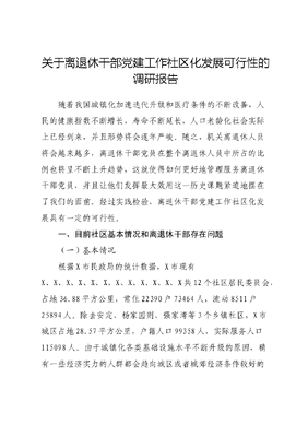 关于离退休干部党建工作社区化发展可行性的调研报告随着我国城镇化加速迭代升级和医疗条件的不断改善,人民的健康指数不断增长,寿命不断延长,人口老龄化社会实际上已经到来,并且形势将会逐年严峻。随之,机关离退休人员将会越来越多,离退休干部党员在整个离退休人员中所占的比例也将呈不断上升趋势,这就使得如何更好地管理服务离退休干部党员,并且让他们发挥最大效用这一历史课题紧迫地摆在了我们的面前。经过实践检验,离退休干部党建工作社区化发展具有一定的可行性。一、目前社区基本情况和离退休干部存在问题(一)基本情况根据X市民政局的统计数据,X市现有X、X、X、X、X、X、X、X、X、X、X、X共12个社区居民委员会,占地36.88平方公里,常住22390户73464人,流动8511户25894人。除去安定、杨家园则、强家湾等3个乡镇社区,X市城区占地28.57平方公里,户籍人口99358人,实际服务人口115098人。由于城镇化各类基础设施水平不断升级的原因,稍有一些经济实力的人群都会趋向城区或者城郊经济条件较好的区域买房或租房居住,离退休干部大多数也会根据自己的经济实力选择在这些区域居住。离退休干部党员退休以后,由于心态的变化,除了工资和待遇问题,大多不愿再和原单位发生一些不必要纠缠,这也是离退休干部党建依靠原退休单位来搞不通畅的一个重要原因。设想离退休干部党委积极对接社区党组织,对应城区8个社区设立8个党总支,根据实际,对应设立相应的网格党支部、小区党组织,整合社区党组织力量,共建老中少党员队伍,不断优化梯队建设,共享阵地资源,是一个完全可行的方案。迎宾路社区联合支部讲党课、做讲座、搞义诊等活动的成功举办,一定程度上证明了离退休干部党建社区化设想的可行性。(二)存在问题一是离退休干部党组织管理难度大。当前,职工党员离退休后党组织关系很多选择继续留在区域内机关单位党组织,但受限于心态、面子、健康、阵地、资金等诸多因素,机关党组织不愿主动组织离退休干部参与活动,实际上很难对他们实施有效管理。二是离退休干部党员参与热情度不高。部分党员在离退休后,思想上也随之退休,只关注待遇享受,不关心不热心组织生活,口号喊得高,实际参与时抵触情绪大,放松了自我教育,更乐于享受天伦之乐。三是党建工作的创新性不够。文可居文库——海量学习资料,手机电脑均可下载www.wenkeju.com由于离退休干部党委经费有限,组织权威性不足,日常工作中面对的大多又是领导岗位退下的老领导,组织活动时经常有越级指挥的尴尬心态,导致创新性不足。二、对如何开展离退休干部党建工作社区化的一些探索为进一步加强离退休干部基层组织建设,我市离退休干部党委尝试运用大统战思维党建工作法,不断拓展基层党组织、党员联系和服务群众的渠道,切实提升服务居民群众的能力。具体做法就是:精选老党员、团结小队员、吸引新成员、共同干事业。根据实际情况,离退休干部党委排除因主观客观因素导致参加活动不热心不方便的老党员,精选忠诚、担当、认真、负责、具备条件的离退休干部党员到社区报到。在开展活动的过程和各个环节中,团结参与活动的非离退休干部党员,吸引有激情的热心群众,通过因才任岗、志愿服务等切实开展工作。在长期的合作和生活过程中,凝聚党员和群众共同价值意识,增强把社区当家园的认同感,增强人员活动的参与感,增强党员和群众的使命感、获得感。在各类活动中,根据重点任务的不同,离退休干部党员可以发挥五大员的作用。一是党的方针政策的宣传员。利用自身资历优势,积极向周围群众宣传党的路线、方针、政策和社会主义建设的成就。引导群众正确认识改革开放和经济体制文可居文库——海量学习资料,手机电脑均可下载www.wenkeju.com变革中出现的一些问题,疏导思想,理顺情绪,为实现中国式现代化作出老干部的贡献。二是居民致富的推广员。通过组织周围群众到社区远程教育播放室观看电教片,为居民传送好的致富手段,使居民的剪纸艺术、特色饮食文化等都可以通过网络平台传送出去,达到致富和宣传X的双重目的。三是青年党员的教辅员。通过推荐具有政治、威望、经验等优势的离退休干部老党员,通过讲党课,讲革命故事,唱红歌等启迪教育后人,激励青年党员勇于承担,砥砺前行。四是城市驿站的管理员。各社区可以设立城市驿站便民,内设桌椅、饮水机、雨伞、报刊图书、棋牌、急救药箱、手机充电口、音响等便民设备,年轻党员忙于行政工作的时候,离退休干部党员完全可以根据居住地轮班管理驿站。日常工作内容还可以包括:1、组织居民群众文娱活动。2、设立民情台帐,收集、整理居民诉求、困难。3、做好整改台账,做到居民大事小情都了解,难事喜事都清楚。五是扶困排难的示范员。离退休干部利用原有在岗优势,在关心关爱困难群众日常生活中,协调相关单位开展为社区困难群众捐赠书