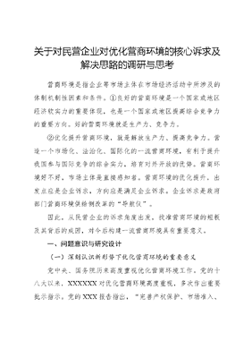 关于对民营企业对优化营商环境的核心诉求及解决思路的调研与思考营商环境是指企业等市场主体在市场经济活动中所涉及的体制机制性因素和条件。①良好的营商环境是一个国家或地区经济软实力的重要体现,也是一个国家或地区提高综合竞争力的重要方向。好的营商环境就是生产力、竞争力。②优化提升营商环境,就是解放生产力、提高竞争力。营造一个市场化、法治化、国际化的一流营商环境,有利于提升我国参与国际竞争的综合实力,培育对外开放的优势。营商环境好不好,市场主体是直接感知者。营商环境的优化提升,出发点应是企业诉求,方向应是满足企业诉求。企业诉求是政府部门营商环境供给侧改革的导航仪。因此,从民营企业的诉求角度出发,找准营商环境的短板及其背后的成因,对今后构建一流营商环境具有重要意义。一、问题意识与研究设计(一)深刻认识新形势下优化营商环境的重要意义党中央、国务院历来高度重视优化营商环境工作。党的十八大以来,XXXXXX对优化营商环境高度重视,多次作出重要批示指示。党的XXX报告指出,完善产权保护、市场准入、公平竞争、社会信用等市场经济基础制度,优化营商环境,强调营造市场化、法治化、国际化一流营商环境。首先,从发展阶段看,优化营商环境是助力企业高质量发展的重要支撑。当前,我国经济已由高速增长阶段转向高质量发展阶段,正经历质量变革、效率变革、动力变革,传统的劳动力、土地等生产要素的比较优势正在逐渐减弱,制度供给成为重要的核心竞争力。十四五时期我国政府的首要任务是构建世界一流的营商环境。②《中共中央关于制定国民经济和社会发展第十四个五年规划和二〇三五年远景目标的建议》提出,持续优化市场化法治化国际化营商环境。党的XXX报告提出,优化民营企业发展环境,促进民营经济发展壮大。新形势下,营造一流营商环境,面临新的机遇与挑战。一方面,随着改革的深入推进和实施,优化营商环境开始出现边际效用递减现象,如生产经营环节的行政审批事项削减空间有所缩小;另一方面,国内外环境更加错综复杂,市场主体的需求也日益多元化。为更好地满足市场主体对更敏捷、更通畅、更便利、更公平社会服务的需求,必须把优化营商环境摆在现代化建设的重要位置,下大气力、久久为功,啃硬骨头、闯深水区,持续推动营商环境优化升级,以营商环境长期改善的确定性对冲外部环境变化的不确定性,让市场主体本固根深、枝繁叶茂,加文可居文库——海量学习资料,手机电脑均可下载www.wenkeju.com快推动高质量发展。其次,从经济运行看,优化营商环境是推动经济回稳向好的重要举措。进入高质量发展阶段,叠加三年疫情冲击,民营企业和民营经济发展进入了一个新的特殊时期,面对前所未见的国内外环境,一些民营企业在迈向高质量发展的过程中遇到了许多问题,发展信心也受到了影响。XXXXXX在20xx年底召开的中央经济工作会议上指出:明年经济工作千头万绪,需要从战略全局出发,抓主要矛盾,从改善社会心理预期、提振发展信心入手,抓住重大关键环节,纲举目张做好工作。③如何改善预期、提振信心?优化营商环境是重要抓手。2023年x月x日,国务院总理李强主持召开国务院常务会议时强调,要把打造市场化、法治化、国际化营商环境摆在重要位置;从企业实际需求出发,在放宽市场准入、促进公平竞争、保护知识产权等方面,分批次加快推出针对性强、含金量高的政策措施。④为此,2023年多地密集出台相关文件,发力优化营商环境,有效引导市场预期。最后,从国际形势看,优化营商环境是应对外部环境变化的客观需要。从国际环境来看,经济全球化仍在发展,但贸易保护主义愈演愈烈,逆全球化思潮不断发酵。当前,全球第四轮与第五轮产业转移正加速推进,全球产业链供应链地理面临文可居文库——海量学习资料,手机电脑均可下载www.wenkeju.com重塑。①在全球化生产不可逆转的背景下,决定产业国内转移还是国际转移的核心原则,除了开放和安全外,最重要的是效率。具体来说,主要取决于国内营商环境和国际营商环境的优劣比较,以及省域间营商环境的差异。②虽然从长期来看,全球化的大势不可逆转,但短期则可能会遭遇一些波折,要适应这一趋势,我国必须提高国际竞争力,进一步融入全球经济。未来的竞争,从一定意义上说,就是营商环境的大比拼,国际竞争也是营商环境的竞争。我国社会主义制度的优越性,要通过优良的营商环境展现出来,就必须解放、创造和保护先进的生产力。③营造一个与国际接轨、法治化、便利化的营商环境,有利于提升我国参与国际竞争的综合实力,培育对外开放的新优势。(二)研究设计与调研方法政府发展经济的职能方式由招商引资过渡为优化营商环境本质上是一种制度创新,而营商环境作为一种公共产品,其生产者为政府,消费者为市场主体,即企业。④本文将从政府营商环境供给端和企业营商环境需求端展开分析。在案例选择