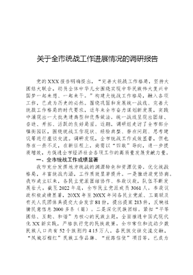 关于全市统战工作进展情况的调研报告党的XXX报告明确提出,完善大统战工作格局,坚持大团结大联合,动员全体中华儿女围绕实现中华民族伟大复兴中国梦一起来想、一起来干。构建大统战工作格局,融入各项工作,已成为历史的必然。围绕巩固和发展统一战线、完善大统战工作格局的时代要求,近年来全市奋力谋划新发展,实践中涌现出一大批先进典型和优秀做法,统一战线呈现出团结、奋进、开拓、活跃的良好局面。近期,调研组走访了全市部分镇街园区,围绕统战工作现状、经验典型、存在问题、思考建议等进行座谈交流。调研发现,全市统战工作成效显著,但也存在一些不足,在新征程上,尚需以四敢导向,进一步提质增效,为促进全市经济社会各项工作的高质量发展贡献力量。一、全市统战工作成绩显著我市充分发挥地方统战的渊源特色和资源优势,优化统战格局,丰富统战内涵,工作质效显著提升。一是推进政党协商。我市成立以来,各民主党派团结协作、参政议政,队伍不断发展壮大。截至2022年底,全市民主党派成员3061人,参政议政积极成绩显著,20XX年至20XX年间各民主党派、工商联及有关人民团体共提交大会发言81份,提出提案213件,反映社情民意信息2000多条(篇)。二是深化民族团结。紧扣平等团结、互助、和谐为核心的民族主题,全面推进中国式现代化XX新实践,严格执行党的民族政策。全市常住和流动少数民族人口共有52个族别约4.15万人,各民族交往交流交融,凤城石榴红民族工作品牌、丝路信使项目等,已成为我市叫得响、拿得出手的城市名片。三是加强民营经济统战工作。近年来省委统战部主要领导3年4次来泰调研民营经济统战工作,市委常委会7次专题研究民营经济统战工作。举办企业家大讲堂、民营经济人士三进(进党校高校、进传统教育基地、进党建示范企业)、理想信念教育培训班以及各类座谈研讨会113场,组建民营企业科技服务党外专家百人团、中小微企业委员会等,实施泰商回归工程,成立世界泰商联合会,打造我市样板,全省各设区市130余名民营企业家来泰学习借鉴经验做法。四是加强新的社会阶层人士统战工作。20XX年12月21日,XX市新的社会阶层人士联谊会(以下简称新联会)正式成立,截至2022年底,新的社会阶层人士总体规模已达29.67万。实现镇街新联会组织全覆盖,成立园区、商圈新联会5个,乡镇(街道)新联会85个,社区新联会1个。高标准打造两个省级工作实践创新基地——儒新社和未来之城以及靖江马洲心联荟、泰兴泰兴新力量等各具特色的新阶层活动阵地,在全省率先实现市、市(区)基地建设全覆盖。五是加强港澳台海外统战工作。全市海外华人华侨众多,其中不乏高层次科技人才,在诸多领域站在了世界科技前沿。我市与爱国侨领XX联手打造建立珍藏文物馆,以此激励人们报效祖国、建设家乡。二、全市统战工作存在的不足在迈向现代化的历史进程中,全市统战工作面临着新的挑战,也存在一些不足。一是面临复杂多变的国内外形势。当今世界正经历百年未有之大变局,不确定不稳定因素增多。从国内看,我国进入新发展阶段,面临着结构性、体制性、周期性问题相互交织所带来的困难和挑战,统一战线内部结构复杂性前所未有,矛盾风险挑战之多前所未有,多元思想文化交流交融交锋前所未有。二是大统战格局尚未形成。目前,大统战工作格局尚未完全形成,整体推进的制度体系有待丰富。对基层更多的是任务摊派和考核评比,政策支持、上下联动等文可居文库——海量学习资料,手机电脑均可下载www.wenkeju.com激活机制少。全市统战队伍面临总量和结构上的人才储备双重困境,制度保障和激励机制不足,影响着人才队伍的巩固发展。跨区域部门联动的机制有待形成,基层统战工作在一定程度上还存在着单打独斗的现象,跨区域部门间的协调配合、联防联动与综合治理的整体效应未充分发挥,如谈判旧址、珍藏文物馆、XX纪念馆虽然相距很近,但未能串联成片形成一体。三是基层统战工作融合创新不强。党的根基在基层,党的力量在基层,党和国家工作的落实主要靠基层。基层融合创新不够,统战工作与经济建设、政治建设、生态文明建设等地方实践融合创新不够深入,为国家治理的现代化提供方向指引、精神支柱和文化保障力度不够。技术含量不够,一些统战基地、统战资源分别隶属于不同的主管部门,在统战主题的打造上不够突出。管理深度不够,基层统战因工作任务重、要求高、力量薄弱,不同程度出现地位弱化、思维僵化、对象分化、抓手虚化等现象,地方统战部门的主要精力更多地投入在应对高质量发展和党建考核指标上,重政绩而实践创新不够。三、新征程上促进全市统战工作高质量发展的思路干部敢为、地方敢闯、企业敢干、群众敢首创是XXXXXX在中共中央政治局会议上提出的要求。针对统战工作中存在的瓶颈问题,应在党的全面领导下,发