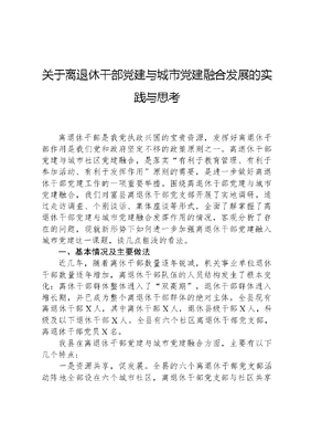关于离退休干部党建与城市党建融合发展的实践与思考离退休干部是我党执政兴国的宝贵资源,发挥好离退休干部作用是我们党和政府坚定不移的政策原则之一。离退休干部党建与城市社区党建融合,是落实有利于教育管理、有利于参加活动、有利于发挥作用原则的需要,是进一步做好离退休干部党建工作的一项重要举措。围绕离退休干部党建与城市党建融合,我们对富县离退休干部党支部开展了实地调研。通过走访调查、个别谈话、集体座谈等形式,全面了解掌握了离退休干部党建与城市党建融合发挥作用的情况,客观分析了存在的问题,现就新形势下如何进一步加强离退休干部党建融入城市党建这一课题,谈几点粗浅的看法。一、基本情况及主要做法近几年,随着离休干部数量逐年锐减,机关事业单位退休干部数量逐年增加,离退休干部队伍的人员结构发生了根本变化:离休干部群体整体进入了双高期,退休干部群体进入增长期,并已成为整个离退休干部群体的绝对主体。全县现有离退休干部X人,其中离休干部X人,退休县级干部X人,科级及以下退休干部X人。全县有六个社区离退休干部党支部,离退休干部党员X名。我县在离退休干部党建与城市党建融合方面,主要有以下几个特点:一是资源共享,促发展。全县的六个离退休干部党支部活动阵地全部设在六个城市社区,离退休干部党支部与社区共享会议室、党员活动室、阅览室等资源,解决了离退休干部党支部学习活动阵地问题。街道办和社区工作人员积极帮助辖区离退休干部使用微信、电脑等新媒体,为离退休干部老有所学、老有所乐、老有所为创造良好条件。二是活动共融,促和谐。离退休干部党支部的活动都能够与社区的活动有效结合,优势互补,共同举办活动,协助解决群众关注的热难点问题,促进了和谐社区建设。老党员、老干部积极参加社区的护林防火宣传、新型冠状病毒肺炎宣传、春节送春联、矛盾纠纷调解等工作;社区为离退休干部党员过政治生日,邀请离退休干部党员为社区年轻党员讲党课,端午节为老年人送粽子,参加离退休干部的茶话会、座谈会、与社区老党员一起唱红歌等,做到了活动共融、和谐发展。三是建言献策,解民忧。离退休干部党员在社区学习、与社区共同举办活动,相互支持,相互配合,他们充分发挥政治优势、经验优势,积极彰显银发力量,帮助社区居民解决实际问题,向县委县政府、县委老干局、社区积极反映问题,建言献策。太和社区离退休干部党支部成立的太和社区和事佬组织、沙梁社区的60、70志愿服务队、南教场社区的银发志愿服务队等组织,融入社区基层治理体系,助力中心、精准发力,积极参与社区共治共建活动,协调解决社区各类矛盾纠纷,及时反映社情民意,助力社区提升了治理水平,群众反响良好。二、存在问题在县委县政府的领导下,在各涉老部门和广大老干部的共同努力下,我县老干部作用发挥取得了一定的成效,老年人各类娱乐、健身、竞赛活动开展的有声有色。但在与社区党建融合开展中也存在一些不足。一是思想认识不到位。部分社区、单位和干部对老干部发挥作用的重要性认识不到位,片面地认为老干部工作主要是老干局的事,只是简单的给社区离退休干部党支部提供学习、活文可居文库——海量学习资料,手机电脑均可下载www.wenkeju.com动场所,但真正参与社区离退休干部党支部建设和相关活动的少。二是教育管理不到位。各部门单位、乡镇、街道和社区没有真正把离退休干部党建工作列入重要议事日程,离退休干部党建工作出现薄弱环节,造成部分老党员,既不参加离退休干部党支部的活动,也不参加所在单位党支部的活动,党性观念逐渐淡薄,正能量作用发挥不够。三是条件受限、保障不力。有的老干部因身体原因行动不便无法参与党支部的活动,有的退休后受个人爱好、子女意愿、家庭情况等因素影响,参与积极性不高,人员难组织、活动难开展的问题比较突出,部分离退休干部无法参与到发挥作用的行列中,存在心有余而力不足的现象。加之个别社区活动阵地布局不合理、缺乏多样化的功能分区,对老干部积极参与活动的吸引力有限。三、建议与对策根据工作实践和存在的问题,结合实际情况,对离退休干部党建融入城市社区党建工作,有以下四方面思考:一是出台离退休干部党建与城市党建融合发展的措施办法如何加强离退休干部的管理,需要进一步建立明确的、系统的管理办法。要坚持在党委政府的统一领导下,整合各方面资源,明确乡镇(街道)党委、部门单位对老干部工作的职责,将离退休干部党建工作纳入重要议事日程,街道社区要有专人负责,协调参与离退休干部党建工作,各部门单位要落实专人负责老干部工作,各司其职、各负其责,实现服务管理无缝衔接,形成齐抓共管的工作机制和社会合力。积极探索推行离退休党员干部双重管理模式,离退休干部党员可参加组织关系所在单位的组织生活,也可就近在居住地社区参加党组织活动,同时接受组织关系所在党组织和社区居住地党组织的双重管理。老干部原单位