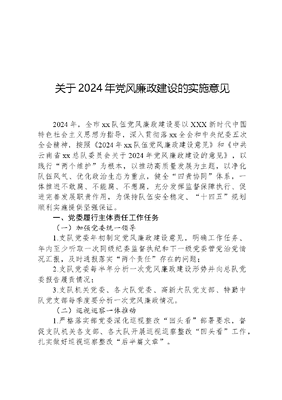 关于2024年党风廉政建设的实施意见2024年,全市xx队伍党风廉政建设要以XXX新时代中国特色社会主义思想为指导,深入贯彻落xx全会和中央纪委五次全会精神,按照《2024年xx队伍党风廉政建设意见》和《中共云南省xx总队委员会关于2024年党风廉政建设的意见》,以践行两个维护为根本,以推动高质量发展为主题,以净化队伍风气、优化政治生态为重点,健全四责协同体系,一体推进不敢腐、不能腐、不想腐,充分发挥监督保障执行、促进完善发展职责作用,为保持队伍安全稳定、十四五规划顺利实施提供坚强保证。一、党委履行主体责任工作任务(一)加强党委统一领导1.支队党委年初制定党风廉政建设意见,明确工作任务、年内至少听取一次同级纪委监督执纪和下一级党委管党治党情况汇报,及时通报落实两个责任存在的问题;2.支队党委每半年分析一次党风廉政建设形势并向总队党委报告履责情况;3.支队机关党委、各大队党委、高新大队党支部、特勤中队党支部每季度要分析一次党风廉政情况。(二)巡视巡察一体推动1.严格落实部党委深化巡视整改回头看部署要求,督促支队机关各支部、各大队开展巡视巡察整改回头看工作,扎实做好巡视巡察整改后半篇文章。2.以中央巡视的标准和力度深化内部巡察工作,高标准完成巡察三年全覆盖目标任务,年内对4个大队开展政治巡察。3.年内对已巡察的6个大队开展巡察整改回头看和巡察验收。(三)持续整治突出问题1.严格落实总队《进一步加强公文管理和会议组织工作的通知》《清理总队机关对下工作微信群的通知》要求,精简会议文件、优化数据统计,解决文山会海、失泄密、统计不实等问题;2.开展收送红包礼金专项治理,整治在比武竞赛、考核评比、检查督察、表彰奖励等工作中收送红包礼金买成绩、买名次等问题;3.开展机关党建灯下黑问题专项整治,纠治机关和直属单位在政治意识淡化、党的领导弱化、党建工作虚化、责任落实软化等方面存在的突出问题;4.开展消防装备和信息化项目招标采购突出问题专项治理,建立消防装备比价、通报、问责机制,纠治内外勾结、插手干预等问题;5.全面清理后勤财经领域历史遗留问题,纠治基层宣传费虚高、私设小金库等问题;6.开展选人用人检查,纠治违规选人用人、回避制度不落实、热点敏感岗位交流不够等问题;7.加大管酒治酒力度,强化主官工作日禁酒、随机测酒、饮酒报备等措施;8.开展消防执法微腐败、大队长现象专项治理,建立消防执法廉洁指数和评价体系,建立干部廉政档案,健全整治群众身边腐败问题长效机制;9.支队纪委每季度结合廉政风险分析和全队伍廉政工作需要,及时下发《纪律检查建议书》,提示各科室、各大队存在的风险隐患及工作要求。文可居文库——海量学习资料,手机电脑均可下载www.wenkeju.com(四)推进纪检体制改革1.制定下发《中共xx支队纪律委员会工作规程(试行)》,规范纪委工作秩序,及时调整、充实同级纪委委员,推动纪委实体化运作、实战化运行;2.发挥基层风气监督员作用,鼓励基层风气监督员主动发现上报违规违纪问题,依纪依规严肃问责追责,形成强大震慑;3.落实《纪检审计干部年度履职考核办法》,探索建立基层风气监督员考评机制,鼓励基层风气监督员大胆履职。(五)深化落实以案促改1.开通支队纪检网,搭建网络平台,加大违纪案件曝光力度,做到件件通报、事事曝光、点名道姓,释放越往后越严的信号;2.落实以案促改,指导案发单位党组织召开以案促改专题民主生活会,严格落实三会两书一案四查摆措施,最大限度发挥警示教育效能;3.严格执行部局《运用监督执纪第一种形态的工作意见》,督促各级党委履行对党员的教育、管理、监督职责;4.探索支队纪委、基层风气监督员每月集中学习制度,增强工作能力,强化纪律规矩意识。二、党委书记、副书记共同履行第一责任人职责工作任务(一)党委书记、副书记对党风廉政建设重要工作亲自部署、重大问题亲自过问、重点环节亲自协调、重要案件亲自督办;(二)党委书记、副书记要督促班子其他成员,履行全面从严治党主体责任,发现苗头性、倾向性问题及时进行谈话提醒,抓早抓小,防微杜渐。三、班子其他成员履行一岗双责工作任务(一)支队党委班子成员每半年听取一次分管科室全面从严治党工作汇报,督促分管职能部门围绕突出问题研究制定对策措施,并带领分管部门和领域抓好贯彻落实,及时解决重大文可居文库——海量学习资料,手机电脑均可下载www.wenkeju.com问题;(二)支队党委班子成员每半年向支队党委报告落实一岗双责情况和个人遵守廉政纪律情况;(三)大队党委、支部班子成员每半年向大队党委、支部报告落实一岗双责情况和个人遵守廉政纪律情况。四、纪委履行监督责任工作任务(一)协助落实主体责任1.支队纪委每月向支队党委汇报党