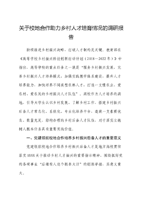 关于校地合作助力乡村人才培育情况的调研报告持续推进乡村振兴战略,打破人才制约是关键。教育部在《高等学校乡村振兴科技创新行动计划(2018—2022年)》中指出,高等学校的重点任务之一就是服务乡村振兴发展,完善乡村振兴人才培养模式,加强实践教学体系建设,提升人才培养能力,加快培养不同类型农林人才,打造一支懂农业、爱农村、爱农民的乡村振兴人才队伍。高校作为人才培养的高地,引导大学生认识乡村发展、了解乡村工作,搭建乡村振兴后备人才常态化、系统化、专业化培养平台,造就一支素质优良、数量充足、结构合理的乡村后备人才队伍,对于落实立德树人根本任务具有重要实践价值。一、党建领航校地合作培养乡村振兴后备人才的重要意义党建领航校地合作培养乡村振兴后备人才是地方高校贯彻落实AXXX关于推动乡村人才振兴的重要指示精神,围绕抓好党的各项事业后继有人这个根本大计的创新举措,其意义重大。(一)有利于实现培养高等教育人才与服务乡村振兴发展有机结合。立德树人是高校基层党组织最根本的政治使命。在全面推进乡村振兴战略的时代背景之下,高校党委充分履行管党治党、办学治校主体责任,与地方基层党组织结对共建,共同培养乡村振兴后备人才,既有利于纵深推进校地合作,加强大学生综合素质教育,又有利于促进学校特色优势学科与地方发展精准对接,助力乡村振兴,增强高等院校服务地方经济社会发展的驱动力。(二)有利于优化乡村振兴人才储备与完善乡村人才培养制度。农业农村人才是强农兴农的根本。党的十八大以来,农村人才队伍存量不断扩大,结构明显优化,素质大幅提升,但巩固拓展脱贫攻坚成果同乡村振兴有效衔接对人才的支撑作用提出了更高的要求。因此,积极探索更加精准的后备人才培养与输送,有利于拓宽乡村振兴后备人才培养和选派渠道,引导高学历、高素质人才充实乡村基层干部队伍,以高质量人才培养赋能乡村人才振兴。文可居文库——海量学习资料,手机电脑均可下载www.wenkeju.com(三)有利于搭建大学生就业需求与乡村人才供给通道。2023年,全国高校毕业生人数1158万人,比2022年增加82万人。鼓励大学生进入乡村就业不仅能够缓解就业压力,让大学生在广阔的乡村施展才能,实现自身理想抱负,而且还能够补齐当前乡村振兴人才队伍建设的短板。但当前大学生返乡就业还存在高校专业设置和乡村发展需求不匹配、回乡发展的认知偏差和相关政策支持不强等问题。高校党委与地方合作培养乡村振兴后备人才能够有效弥补上述不足,实现大学生进入基层就业与乡村人才振兴的有机协同。二、**师范学院乡村振兴后备人才育苗班运行现状及困境紧扣抓好乡村振兴后继有人这个任务,2023年3月**师范学院乡村振兴后备人才育苗班开班,为搭建乡村振兴后备人才常态化、系统化、专业化培养平台,拓宽高学历、高素质选育渠道,造就素质优良、数量充足、结构合理的乡村后备人才队伍作了有益尝试和实践。育苗班共开展4期,累计1019名学员参加了根植土壤阶段培训,其中44名学员入选精细文可居文库——海量学习资料,手机电脑均可下载www.wenkeju.com育苗班参加跟岗实习,获得了实习单位的一致好评;有36名学员到基层就业,在乡村振兴的大舞台上建功立业。2023年7—8月,《中国教育报》、教育导报网、**教育动态、《**日报》、川观新闻等国内媒体先后对育苗班作了专门报道。(一)乡村振兴后备人才育苗班运行现状1.校地深度合作,联合举办培养。2023年3月2日,**师范学院与中共**市委组织部联合开办乡村振兴后备人才育苗班,共同拟定乡村振兴后备人才培养协议。根据**市乡村振兴人才队伍建设需要,确定了重点培养一批有乡村就业志向在校大学生,成为服务于**市基层的后备人才的目标规划。2.创新选拔学员,建立融合师资。乡村振兴后备人才育苗班面向学院全体在校大学生,充分遵循人才成长发展规律,通过开设根植土壤班+精细育苗班分期分批培养学员。建立校内专家教授+基层一线干部融合师资库,由校内教授团队和校外具有较强理论水平、丰富农村工作经验的基层一线干部队伍组成,实现专业知识和实践经验的深度融合。文可居文库——海量学习资料,手机电脑均可下载www.wenkeju.com3.精选理论课程,开展现场教学。一是讲授专题理论。精选乡村振兴理论课程作为学院选修课程,设置现代农业发展、基层治理、农村党建、群众工作等专题课程,固定每周四明确一个专题进行讲授,使学员系统化接受理论教育。二是开展现场教学。依托**市基层党建示范点、乡村振兴示范村、农业龙头企业等设置现场教学点位,组织学员开展学习考察、校外实践实训。4.组织跟岗实习,强化定向培养。**师范学院、中共**市委组织部、**各县(市、区)委组织部门高度重视乡村振兴后备人才育苗班