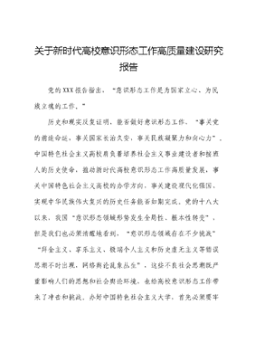 关于新时代高校意识形态工作高质量建设研究报告党的XXX报告指出,意识形态工作是为国家立心、为民族立魂的工作。历史和现实反复证明,能否做好意识形态工作,事关党的前途命运,事关国家长治久安,事关民族凝聚力和向心力。中国特色社会主义高校肩负着培养社会主义事业建设者和接班人的历史使命,推动新时代高校意识形态工作高质量发展,事关中国特色社会主义高校的办学方向,事关建设现代化强国、实现中华民族伟大复兴的历史任务能否如期完成。党的十八大以来,我国意识形态领域形势发生全局性、根本性转变,但是我们也必须清醒地看到,意识形态领域存在不少挑战拜金主义、享乐主义、极端个人主义和历史虚无主义等错误思潮不时出现,网络舆论乱象丛生,这些不良社会思潮既严重影响人们的思想和社会舆论环境,也给高校意识形态工作带来了冲击和挑战。办好中国特色社会主义大学,首先必须要牢牢把握意识形态工作领导权、主动权,推动高校意识形态工作高质量发展。一、高质量推动高校意识形态工作的特殊重要性(一)高校意识形态工作事关为谁培养人高等教育是教育事业的龙头,其办学使命、发展方向、教育内容、育人方式要同我国发展的现实目标和未来方向紧密联系在一起。AXXX指出:我们对高等教育的需要比以往任何时候都更加迫切,对科学知识和卓越人才的渴求比以往任何时候都更加强烈。扎根中国大地的社会主义大学,要始终把坚持为人民服务,始终将办人民满意的高等教育作为根本追求,这是高校办学治校的根本方向。在这一方向规定下,高校要坚持为中国共产党治国理政服务,为党治国理政提供坚实的思想文化基础和高水平的人才智力支撑;要坚持推进中国特色社会主义大学治理体系建设,为巩固和发展中国特色社会主义制度服务;要坚持为改革开放和社会主义现代化建设服务,积极服务国家经济社会发展,投身实现中华民族伟大复兴的伟大实践。(二)高校意识形态工作事关培养什么人文可居文库——海量学习资料,手机电脑均可下载www.wenkeju.comAXXX指出:我国高等教育肩负着培养德智体美劳全面发展的社会主义事业建设者和接班人的重大任务。培养社会主义建设者和接班人,既是党的教育方针,也是我国各级各类学校的共同使命。高校要完成这个重大任务和共同使命,就必须坚持正确政治方向,这既是对中国特色社会主义大学根本使命的深刻阐述,也是对高校做好意识形态工作的明确要求。这个政治方向,就是始终坚持扎根中国大地,始终坚持中国特色社会主义,始终坚持马克思主义在意识形态领域的指导地位;这个政治方向,就是始终坚持以社会主义核心价值观为引领,传承中华优秀传统文化,深化爱国主义、集体主义、社会主义教育,着力培养担当民族复兴大任的时代新人。(三)高校意识形态工作事关怎样培养人AXXX在同北京大学师生座谈时指出:要把立德树人的成效作为检验学校一切工作的根本标准,要把立德树人内化到大学建设和管理各领域、各方面、各环节,做到以树人为核心,以立德为根本,这既是高校人才培养的价值旨归,也是高校人才培养的根本方式。意识形态工作的内容、成效决定了给学文可居文库——海量学习资料,手机电脑均可下载www.wenkeju.com生立什么样的德,决定了高校树什么样的人。在对青年学生的德育教育中,既要加强大德教育,激励学生努力践行对国家、民族的时代使命,把个人理想融入爱国、报国之情的个人实践;也要加强公德教育,引导学生自觉培养公德意识,养成自觉遵守的良好习惯;还要加强私德教育,要求学生在日常道德践履中严格约束自己的操守和行为,培养德才兼备的一代新人。二、当代社会思潮在高校的传播及影响社会思潮作为意识形态的重要组成部分,是反映特定环境中,人们的某种利益或要求并对社会生活有广泛影响的思想趋势或倾向。作为一定社会时期内流行的思想趋势或倾向,社会思潮打着深深的意识形态烙印,带有鲜明的价值导向、群众导向和时代导向。在我国当下流行传播的各种社会思潮中,既有先进、积极向上的因素,亦有滞后、消极反动的糟粕。这些社会思潮中的消极和反动因素,持续冲击着高校意识形态阵地,同时也呈现出新的传播态势。(一)高校始终是社会思潮传播的前沿地带文可居文库——海量学习资料,手机电脑均可下载www.wenkeju.com有学者曾指出:教育本身就是一个这样的场所,不同的集团在此基于自己社会的、文化的和宗教的目的,竞相致力于建立自己的霸权。高校是人才的高地,同时又是思想和文化的高地,是理论创造、研究、传播之所,本身就是意识形态领域。高校师生具有开阔的视野、敏锐的思维、较高的理论水平、较强的质疑精神和独立思考能力,不同的思想、观点、主张在高校交融、交流、交锋,使得高校成为了社会思潮传播的晴雨表和主阵地。尤其是对于当代大学生群体来说,他们活跃的思维、