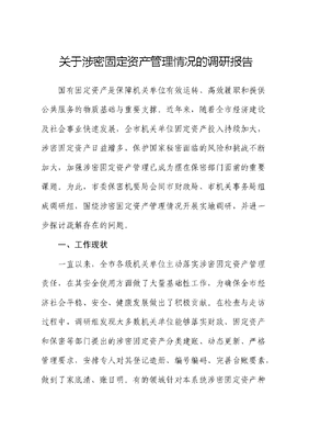 关于涉密固定资产管理情况的调研报告国有固定资产是保障机关单位有效运转、高效履职和提供公共服务的物质基础与重要支撑。近年来,随着全市经济建设及社会事业快速发展,全市机关单位固定资产投入持续加大,涉密固定资产日益增多,保护国家秘密面临的风险和挑战不断加大,加强涉密固定资产管理已成为摆在保密部门面前的重要课题。为此,市委保密机要局会同市财政局、市机关事务局组成调研组,围绕涉密固定资产管理情况开展实地调研,并进一步探讨疏解存在的问题。一、工作现状一直以来,全市各级机关单位主动落实涉密固定资产管理责任,在其安全使用方面做了大量基础性工作,为确保全市经济社会平稳、安全、健康发展做出了积极贡献。在检查与走访过程中,调研组发现大多数机关单位能够落实财政、固定资产和保密等部门提出的涉密固定资产分类建账、动态更新、严格管理要求,安排专人对其登记造册、编号编码、完善台账要素,做到了家底清、账目明。有的领域针对本系统涉密固定资产种类多、数量大、实物价值高等情况,在由相关部门牵头建立涉密固定资产总台账的同时,还指定内设机构或部门具体负责涉密设施设备的登记、造册和管理工作,通过条块结合、齐抓共管,做到账物清楚、账实相符、管理规范,为涉密固定资产日常使用和销毁处置奠定了良好基础。有的单位贯彻落实上级主管部门有关国有固定资产管理要求,以及国家秘密管理各项规定,针对党政机关电子政务内网和本系统专网设备、密码通信设备、人防工程、防暴设备等涉密固定资产及其流转环节,制定了专门管理制度,如制定、修订国有资产管理办法、涉密政府采购管理暂行办法、国有资产有偿使用实施细则等,对资产采购、项目建设、使用管理、租赁、处置等环节作出具体规范,加强内控管理强度与对外安全保密力度。部分市(区、县)行政主管部门将保密管理要求融入本地国有资产管理规章,按照谁使用,谁保管,谁负责的原则,明确涉密固定资产使用单位主体责任。同时,在近年来推进的信创工程中,不少单位采取涉密设备统一销毁、非密设备合理调剂和报废销毁等处置方式,为节约利用设备及安全处置提供了有效的操作途径。文可居文库——海量学习资料,手机电脑均可下载www.wenkeju.com二、问题与风险调研组在走访中发现,部分单位对涉密固定资产表现出重配置、轻管理的现象,存在认识不到位、概念不明晰、制度不健全、责任未落实等问题,为有效保护国家秘密和开展国有资产管理埋下了风险隐患。(一)涉密固定资产管理制度不健全、不配套,存在监管缺失问题。由于安全保密原因,目前在日常工作中,市(区、县)并未将涉密固定资产纳入行政事业单位国有资产管理系统,实施统一的登记入账管理,而是依靠各单位独立做账管理。与非涉密固定资产科学规范的管理体系相比,涉密固定资产在管理制度上明显滞后,缺少全流程管理体系,导致保密、财政和资产主管部门对本级行政事业单位购买的涉密固定资产家底不清,不利于相关部门按照保密和国有资产管理法律法规,有效开展涉密固定资产监管,以及产权登记与界定、产权纠纷调处、资产统计与评估、资产清查等各项工作。不少单位也纷纷反映,由于找不到关于涉密固定资产管理的法规和制度依据,在资产购置、使用、审计、处置等工作中时常遇到是什么、怎么办、文可居文库——海量学习资料,手机电脑均可下载www.wenkeju.com如何管等实际问题,一些单位废旧涉密资产长年积压堆放,资产处置销毁成为一大棘手问题。(二)对涉密固定资产认识有偏差,导致管理混乱,存在失泄密风险。涉密固定资产的形成主要有两种途径:一是资产本身就是国家秘密,如含核心密码和普通密码的设备和软件、部分军用警用设施设备、事关国家安全的高科技信息产品、人防工程设施等;二是相关资产用于存储、处理和保护国家秘密,如电脑、打印机、复印机、服务器、通信工具、销毁设备,以及交通工具、相关建筑物和场所等,这类资产中有的可通过脱密处理,转化为非涉密资产继续使用。调研中发现,由于部分领导干部、保密管理人员、使用人对涉密固定资产概念和形成过程认识不清、把握不准,导致管理上出现混乱。比如,有的单位把涉密固定资产纳入行政事业单位国有资产管理系统,存在泄密风险;有的非密固定资产转变为涉密用途后,没有及时从行政事业单位国有资产管理系统中核销下账,埋下了风险隐患;有的涉密固定资产未经脱密处理,就直接转变为非密用途,或者经过脱密处理,转变为非密用途后,没有在行政事业单位文可居文库——海量学习资料,手机电脑均可下载www.wenkeju.com国有资产管理系统中同步登记,成为账外资产,脱离了资产主管部门监管,存在资产流失风险。(三)涉密固定资产管理方式粗放,导致安全风险增加。由于涉密固定资产未纳入行政事业单位国有资产管理系统集中监管,也没有统一的制度规定,目前大多数单位采取的是自行登记造册、自主管理的模式