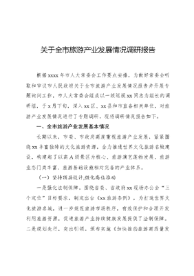 关于全市旅游产业发展情况调研报告根据xxxx年市人大常委会工作要点安排,为做好常委会听取和审议市人民政府关于全市旅游产业发展情况报告并开展专题询问工作,市人大常委会组成以一级巡视xx同志为组长的调研组,于x月下旬,深入xx区、xx县和市直各相关单位,对旅游产业发展情况进行了专题调研,现将调研情况报告如下。一、全市旅游产业发展基本情况长期以来,市委、市政府高度重视旅游产业发展,紧紧围绕xx丰富独特的文化旅游资源,全力推进世界文化旅游名城建设,构建起了以高A级景区为核心、旅游演艺蓬勃发展、旅游业态门类丰富、旅游基础设施相对完备的产业体系。(一)坚持顶层设计,强化高位推动一是强化法制保障。围绕省委、省政府xx现场办公会三个定位目标要求,制定出台《xx旅游条例》,为打造世界文化旅游名城,进一步规范旅游市场秩序,有效保护和合理开发利用旅游资源,促进旅游产业持续健康发展提供了法制保障。二是规划先行,突出引领。颁布实施《加快推动旅游高质量发展守护好xx旅游金字招牌实施方案》、《xx市打造世界文化旅游名城三年行动方案(xxxx-xxxx年)》、《xx市打造世界文化旅游名城xx条保障措施》、《建设世界文化旅游名城,提升文化xx品牌三年行动计划(xxxx-xxxx)》、《xx市产业强市三年行动方案(xxxx-xxxx年)》、《xx市打造全国文旅高质量发展示范城市三年行动计划(xxxx-xxxx年)》等一系列规划、措施,引领旅游产业高质量发展。三是深化行业改革。着力推进旅游综合管理体制、加强旅游综合执法、创新旅游协调参与机制、优化景区服务管理、深化导游旅行社体制等改革,坚决执行市场准入负面清单制度,严格落实放管服各项改革要求,有效激发文旅市场主体活力,旅游产业得以强劲复苏。今年x至x月,xx全市接待旅客x,xxx.xx万人次,是xxxx年同期水平的xxx.xx%,实现国内旅游收入xxx.xx亿元,是xxxx年同期水平的xxx.xx%。其中,中秋、国庆两节期间来xx游客数量达xxx万人次,是xxxx年同期水平的xxx%,实现国内旅游收入xx.x亿元,是xxxx年同期水平的xxx%。(二)夯实发展基础,拓展品牌效应一是旅游品牌含金量持续提升。截止目前,我市拥有星级饭店xxx家,全国乡村旅游重点村镇x个,国家级文明旅游示范单位x家,国家级、省级旅游休闲示范街区x个,夜间文化文可居文库——海量学习资料,手机电脑均可下载www.wenkeju.com和旅游消费集聚区x个,旅游演艺剧目x场,文保单位xxx个(国家级xx处、省级xx处、市级xx处),非遗名录xxx项(国家级x项、省级xx项、市级xx项)。A级景区从原来的xx个增加到xx个。同时,xx文化旅游区xA级景区创建工作已向国家文旅部申报测评,x国家级旅游度假区已报省文旅厅审核,xx古城-xx雪山世界级旅游景区建设正在积极推进,xx旅游品牌知名度不断增强。二是旅游产品业态不断丰富。实施旅游+、+旅游,建成xx等一批文旅综合体验产品,建成xx个半山酒店、xx个国家级旅游民宿,文化体验、康体养生、户外拓展研学等新业态不断呈现。以乡村旅游助力乡村振兴,推动白沙、拉市x个镇入选全国乡村旅游重点镇,文林、均良等x个村入选全国乡村旅游重点村,在全省各州市中位居前列。柔软时光•亲近纳西之旅线路入选全国乡村旅游精品线路。三是市场主体规模日益壮大。目前,全市由文旅部门实施行政审批和标准化管理的文旅市场主体共x,xxx余户,旅行社xxx家,直接从业人员达xx万余人,间接从业人员近xx万人。(三)加强行业治理,规范经营活动一是强化旅游行业治理。深入推进整治乱象、智慧旅游提升品质旅游革命三部曲,围绕《xx省旅游市场秩序整治工作措施》和旅游从业人员八不准规定,制定出台《关文可居文库——海量学习资料,手机电脑均可下载www.wenkeju.com于持续规范旅游市场秩序工作方案》,持续开展旅游市场秩序整治铁拳行动,对旅游市场违法违规行为采取零容忍态度,依法依规,从严从快从重查处违法行为,不断巩固旅游市场秩序整治成果,营造安全规范有序的旅游市场环境。二是持续强化旅游市场监管。推行xx天无理由退换货机制和旅游红黑榜制度,健全完善x+x+N+x旅游市场综合监管等十大旅游市场监管机制,实现了社会治安事件发生率持续下降、旅游投诉持续下降,旅游人数、旅游收入、游客满意度不断提升的两降三升良好局面。(四)加大投入力度,助力企业纾困一是资金投入力度不断增强。xx年,全市安排文化旅游体育与传媒支出xx,xxx万元,比上年同期增支x,xxx万元,增长xx.x%。xxxx年预算安排文化旅游体育与传媒支出资金xx,xxx万元,增长x.x%。同时,每年整合x,xxx万元