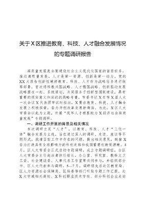 关于X区推进教育、科技、人才融合发展情况的专题调研报告高质量发展是全面建设社会主义现代化国家的首要任务。推动高质量发展,人才是第一资源、创新是第一动力。党的XX大报告创新性地将教育、科技、人才作为战略任务进行统筹部署,首次将科教兴国战略、人才强国战略、创新驱动发展战略摆在一起、系统谋划,共同服务于创新型国家建设,具有重要的现实意义和深远的战略考量。市委书记X在市X届人大一次会议X代表团审议时指出,X要在教育、科技、人才融合发展上积极探索,奋力开创改革发展新局面。为此,X区人大常委会以此为主题,开展筑牢人才根基助力X经济社会高质量发展专题调研。一、调研工作开展的背景及相关情况本次调研立足人才,以教育、科技、人才三位一体融合发展为主线,旨在通过深入的调研、走访、座谈等不同形式,找准目前工作中存在的问题,提出相关意见,助推X奋力打造具有全球影响力的科创走廊和我国重要创新策源地。4月,区人大常委会正式启动专题调研,成立专题调研组,由区人大常委会主任赵汝青担任组长,办公室、研究室、教科文卫工委、社会建设委、人事代表工作室等共同参与,并组织部分市、区人大代表参与调研。5—7月,调研组先后赴区教育局、区人力资源社会保障局、区科委等部门听取专题工作汇报,赴X大学城相关高校、X科创职业技术学校、部分科创企业走访座谈,并向区经委、区人才办等部门书面征集相关经验做法。组织召开部分市、区人大代表调研座谈会,邀请基础教育、高等教育、高新技术、企业服务等相关领域代表结合自身工作,共同探讨课题调研的意义和重点,深入挖掘各自领域在人才挖掘、培养和使用中的困难和瓶颈,并征集相关意见建议。7月底,形成了调研报告初稿,广泛征求相关委办局,有关人大常委会组成人员,各街镇、经开区代表小组及部分市、区人大代表的意见建议,形成调研报告(讨论稿)。二、X区教育、科技、人才融合发展工作现状2023年,X区人民政府将教育、科技、人才融合集成发展列为政府十二项专项行动之一,初步形成了《X区推进教育科技人才融合集成发展专项行动方案》年内正式发布,重点围绕抓主体,建立密切联系的政、企、校、所长效合作机制;抓载体,教育、科技、人才相关部门各尽其责、形成合力;抓项目,探索实现重点项目突破,加快打造教育科技人才融合集成发展区级示范样板。依托高校学科和人才优势,结合高校双一流建设、高水平地方高校建设、高峰高原学科建设、一流专科高等职业教育建设等目标,与X大学城八所高校和X 985高校共同签署深化教育科技人才融合发展项目,做好人才队伍建设顶层设计,精准实施人才引育。延揽全球顶尖科技人才,全区院士专家工作站81家,位居全市前列。设立百亿级规模的长三角G60科创走廊科技成果转化基金。第五届科技成果拍卖会暨X市职工创新成果转化交易平台首拍,当届拍卖成交额接近110亿元,比上一届成交额翻一番。2022年,XR&D投入强度达6.79%,创历史新高。在策源地X高质量发展带动下,九城市R&D投入强度从3%提升到3.55%,远超全国平均水平;九城市PCT国际专利申请数量增长1.6倍,占全国1/9,占全球2.85%。(一)百年大计,教育为本。X区突出科创属性,以人才培养为基点,以资源为抓手,以评价为导向,以项目为依托,文可居文库——海量学习资料,手机电脑均可下载www.wenkeju.com坚持办X人民满意的教育。一是建立科创中心。X一中创新教学组织,深化课程改革,持续落实个性化教育,深度实施跨学科综合实践课程,让学生沉浸于创新力勃发的学习环境中,在各类科技比赛和活动中取得现象级的成果。在科创实验班绍裘班奋进班课程供给的基础上,建立了科创中心,拥有物理DIS实验室、生物学科分子实验室、信息学科机器人实验室等固定的专用教室,使科技教育成为现象级卓越高中不可或缺的重要内容。二是构建云间芯脑。上外云间搭建中国芯智慧脑科创学习联盟,以芯脑为载体,结合生物医疗、人工智能、万物互联场景建造特色软硬件协同的新型教学平台和展示空间;坚持全年段、全覆盖、全学科、全空间理念,依托X超硅半导体、G60脑智基地等区内科创企业专业优势,开展主题课程,以思维训练和寓教于乐为导向,打造良性学习闭环。三是凸显X现象。在年内举行的第38届X市青少年科技创新大赛中X区师生共获奖272项,其中一等奖35项,XX一名学生荣获大赛最高奖项——X科学技术协会主席奖。XX、XX、XX、XX、XX成为十四五期间首批X市科技教育特色示范学校;XX中未来物理学家、XX中科技创新社、XX中云间创客工作坊、XX中学机器人社、XX智能机器人等成为十四五期间首批X市学生科技创新社团,不断探索科学、多元的育人机制。四是立足大学之府。围绕三大先导产业和六大产业集群,结合X经济