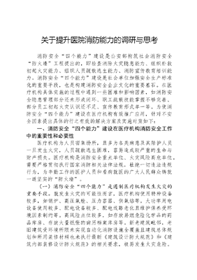 关于提升医院消防能力的调研与思考消防安全四个能力建设是公安部构筑社会消防安全防火墙工程提出的,即检查消除火灾隐患能力、组织扑救初起火灾能力、组织人员疏散逃生能力、消防宣传教育培训能力。消防安全四个能力建设是社会单位加强安全生产标准化的重要手段,也是构建消防安全企业文化的重要基石。在医疗机构具体实施的过程中遇到一些困难和影响因素,如消防安全隐患管理部分还未形成闭环、职工疏散技能掌握不够完善、部分员工初起火灾认识还不足、宣传教育形式单一等。为使消防安全四个能力建设在医疗机构有效推广应用,针对不安全因素提出具体的行之有效的解决方案及实施对策如下:一、消防安全四个能力建设在医疗机构消防安全工作中的重要性和必要性医疗机构为人员密集场所,且多为各类病患及其陪护人员一旦发生火灾,人员疏散逃生困难,容易造成较严重的生命与财产损失。医疗机构是消防安全重点单位、火灾风险高危单位,需要严格贯彻执行国家消防相关法律法规,杜绝一切违法违规行为,为辛勤工作的医护人员和看病就医的广大人民群众铸就一道坚实的防火墙。(一)消防安全四个能力是遏制医疗机构发生火灾的重要手段。就发生火灾的可能性而言,医疗机构使用特种设备较多,如锅炉、高压氧舱、压力容器、供氧站等。大功率用电设备使用较多、配电设备较多、配电线路老化且维护保养受环境因素制约等。高风险点位较多,如存放易燃危险化学品的药品库房、存放大量纸张的病历档案库房等。新老建筑毗邻,老旧建筑受环境所限未实现自动化消防设施全覆盖且建筑总体规划和所用装修材料也未执行最新《建筑设计防火规范》和《建筑内部装修设计防火规范》的相关要求,极易发生火灾危险。消防安全四个能力中的首个能力,检查消除火灾隐患能力就是解决消除此类问题的重要手段,通过学习掌握检查消除火灾隐患能力,能够使单位专职安全管理人员及全体职工在日常工作中就能发现并消除火灾隐患,防患于未然,极大地遏制医院火灾事故的发生率。(二)消防安全四个能力是降低火灾损失的必要武器就发生火灾后果的严重程度而言,医疗机构属于人群高度聚集的人员密集型场所,人员数量多且构成复杂,骨科、眼科ICU等临床科室不良于行患者较多且对医疗机构环境不熟悉,发生火灾极易造成群死群伤的后果。医疗机构精密贵重仪器较多,现代大型综合医疗机构为高效快速地解除患者病痛,引进的先进设备越来越多,这将导致医疗机构的电路越来越复杂,各台设备之间相互联系,发生火灾火势蔓延较快、覆盖设备较多,会造成难以估量的经济财产损失。消防安全四个能力中的组织扑救初起火灾能力、组织人员疏散逃生能力是应对火灾发生后损失严重的必要武器。众所周知,一场完整的火灾事故共有4个阶段即初期增长阶段、充分发展阶段、猛烈燃烧阶段(轰燃)、衰减阶段。在火灾初期增长阶段,过火面积不大,烟气流动较慢,火焰辐射出的能量不多,造成的损失也不大,正是人力灭火的最佳时机,此时如未能进行有效扑救灭火,而是等待消防救援,则会错过最佳灭火时机。组织人员疏散逃生能力能使医院职工在火灾发生初期迅速反应,在过火面积小、烟气还未开始蔓延时,疏散在院患者及各岗位职工。所以扑救初起火灾能力和组织人员疏散逃生能力能有效保障人民生命财产安全,是降低火灾损失的必要武器。(三)消防安全四个能力是营造安全氛围、提升安全素养的重要基础。在火灾案例的警示下,医疗机构职工的消防安全意识有所加强,但要如何来塑造全院的消防安全氛围,如何提升全体职工消防安全素养,又成了摆在人们面前的一个难题。而消防安全四个能力中的消防宣传教育培训能力给出文可居文库——海量学习资料,手机电脑均可下载www.wenkeju.com了解决问题的答案。单位领导认真开展形式多样的消防安全宣传活动、开展消防安全教育培训活动,让全体职工感受到领导对消防安全的重视,上行下效。消防宣传教育培训能力,解决了单位如何提升消防安全素养、如何营造消防安全氛围的难题,是保障单位消防安全的重要基石。二、影响消防安全四个能力建设在医疗机构中推广的因素(一)职工基本消防素养有待提高。《中华人民共和国安全生产法》第二十一条第一款要求建立健全并落实本单位全员安全生产责任制,加强安全生产标准化建设。《中华人民共和国消防法》第一章第二条要求消防工作贯彻预防为主、防消结合的方针,按照政府统一领导、部门依法监管、单位全面负责、公民积极参与的原则,实行消防安全责任制,建立健全社会化的消防工作网络。消防安全四个能力建设要求每个员工均能掌握检查消除火灾隐患能力,但在医疗机构中,员工消防安全的意识及能力仍有待提高。对消防隐患识别能力不强,对于细微的隐患征兆则难以发现,未能掌握基础灭火技能,遇突发状况难以保持冷静,无法有效疏散现场人员,对灭火器具及疏散引导工具的使用不熟练等。日常工作繁重,工作之余多选择休息和