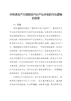 对新质生产力赋能现代化产业体系的内在逻辑的探索一、引言党的XXX报告提出建设现代化产业体系,建设现代化产业体系是实现现代化经济体系的基础,也是实现中国式现代化发展的重要标志,更是实现中华民族伟大复兴的重要抓手。如何在新一轮科技革命和产业变革时代,形成构建现代化产业体系的内在动力,无疑是亟须解决的重大难题。2023年9月7日,XXXXXX在考察东北时指出:积极培育新能源、新材料、先进制造、电子信息等战略性新兴产业,积极培育未来产业,加快形成新质生产力。新发展格局下,大力发展新质生产力,已成为构建现代化产业体系的关键性战略举措。新质生产力在科技创新、产业变革的加持下对产业现代化体系建设的作用越来越明显。新质生产力以科技创新为引擎,以新兴产业为主导,以产业优化为方向,更加关注生产要素的新质投入、资源配置的效率提升、经济效益的新型驱动。自新质生产力提出以来,学术界对其关注度不断提升,现有研究主要集中于以下三方面:一是从基本概念出发,重点阐述其基本特征[1-2]、生成逻辑[3]、战略意义[4]、理论逻辑与实践路径[5];二是从指标测度出发,根据其特征选取合适的指标基于中国情景利用熵值法进行量化[6];三是从影响研究出发,探讨新质生产力赋能高质量发展[7]、助力新型工业化[8]、形成发展动力[9]、助推产业调整[10]、赋能产教融合发展[11]等应用性研究。然而,研究的视野广度还需拓展,目前对新质生产力赋能现代化产业体系建设等问题仍需进一步深入研究。基于此,本文在分析新质生产力理论内涵与时代特征情况下,重点探究新质生产力如何赋能现代化产业体系的内在逻辑,识别新质生产力赋能现代化产业体系的现实挑战,提出新质生产力赋能现代化产业体系的实现路径。二、新质生产力的理论内涵与时代特征新质生产力是在数字化、智能化与技术化快速发展的条件下,由技术革命性突破、生产要素创新性配置、产业深度转型升级而催生呈现的新形式和新质态,它以劳动者、劳动资料、劳动对象及其优化组合的质变为基本内涵。其起点在新,关键在质,落脚点在生产力。新主要是区别于传统生产力,以科学技术为手段,聚焦于新兴产业、高科技产业、未来产业和现代化产业;质主要是相对于量而言,强调生产要依靠知识力量、依靠科技手段、数字技术和创新赋能以达到生产提质增效;新质即在数字化和智能化的时代,文可居文库——海量学习资料,手机电脑均可下载www.wenkeju.com将科技创新等要素赋能于现代化产业以衍生新形式和新质态。生产力主要体现在马克思提出的三个关键要素:劳动力、劳动对象和劳动资料。第一,新质生产力要求具备高素质的新劳动力,主要体现在劳动理念和劳动技能两个维度。一方面,在全社会营造重视人才和人才创造财富的氛围,激励广大劳动者释放聪明才智,转变劳动观念,跟上时代潮流,积极主动学习新技能,发挥自身的不可替代性,为现代化建设提供根本保障。另一方面,掌握适应未来产业发展的劳动技能,利用数字化、智能化和信息化提升自己的综合劳动能力,以匹配现代化产业体系建设和经济高质量发展所需要的劳动力,通过高素质的劳动生产率促进产业优化,促进经济发展。第二,新质生产力需求新介质的劳动资料,包括提供生产基础的物质资料和起到传导作用的中介资料。一是人们用以改变和影响劳动对象的一切物质资料,既有传统的基础设施,也有数字经济催生的数字新基建等资料。二是协助劳动者将技能传导至劳动对象的中介资料,主要通过创新和数字化的手段来实现创造力:创新是新质生产力实现的核心,创新为劳动资料的改良创造了有利条件,通过创新突破关键性技术的瓶颈,必将引发生产变革,产生质的变化;数字化则有利于提升生产文可居文库——海量学习资料,手机电脑均可下载www.wenkeju.com和管理效率,降低运营成本,提升全要素生产率,促进数实融合,发挥乘数效应,进而形成具有数字化、绿色化和智能化等特性的新介质。第三,新质生产力需求新料质的劳动对象,体现在新质产业和绿色发展两个层面。一方面,在百年未有之大变局下,全球产业链供应链调整的情况下,加之科技创新成果不断转化,数字经济快速发展,人们对劳动对象也在不断发生改变,对于不同地区的产业做出不同的要求,包括东部地区培育世界先进制造业集群、中部地区打造现代装备制造业及高技术产业基地、西部地区建成资源精深加工等劳动密集型产业和绿色食品基地、以及东北地区争取传统优势产业的改造升级。另一方面,新质生产力要求具备生态意识,实现人与自然和谐相处与可持续发展,加速新旧动能转换与数字化赋能,形成经济系统的绿色循环发展。劳动对象日益趋于类目增加、虚实共存,由此演变为新料质。新质生产力是在新发展格局下科技创新与产业优化变革的情形下提出的新概念,赋予了鲜明的时代特征。一是