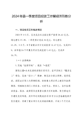 2024年县一季度项目投资工作暨经济形势分析一、项目投资工作推进情况2024年1-3月,区完成全社会固定资产投资24.61亿元、同比增长15.4%,一季度预计完成46亿元、同比增长61.2%。1-2月,8个省重点项目完成投资12.67亿元,完成率*%;拟申报16个市重点项目完成投资7.45亿元,完成率16.7%。(一)主要做法1.实施挂图作战,跑出*速度围绕支撑*未来发展的招商引资项目,区牢固树立服务至上理念,发扬店小二精神,制定出台国土保障、投资促进、园区运行等六大保障机制,绘制重大项目开工建设作战保障图,明确相关部门工作任务、时间节点、责任人,全方位调动资金、服务、政策等各类要素向重大项目集聚,努力营造项目建设良好环境。用半年时间规划启动22平方公里临港经济开发区建设,突破了重点项目无处承载的瓶颈。不到3个月完成金能、惠科项目3000亩用地拆迁,不到2个月完成金能项目土地利用规划调整及报征,创造了7天签约、70天首批设备进场、117天开工建设的*速度,打破了建区以来单体投资规模最大、引进速度最快、开工时间最短等多个历史记录。2.四个聚焦取得项目投资新突破一是聚焦项目招引。围绕电子信息、绿色环保等重点领域实施精准招商,坚持全员全域招商、市区联动招商,开展小分队招商86次,2017年签约项目35个、签约金额656.31亿元,实现百亿级产业项目零突破。二是聚焦拓展空间。抢抓*阳城市总规修编契机,将22平方公里的临港经济发展区纳入修编范围,用时两月整理产业用地4200亩,其中已报征入库875亩。三是聚焦要素保障。紧抓政策窗口期,创新运用PPP、EPC+融资等方式,引入社会和银行资金73.9亿元,超前接入水、电、气、路等要素,编制区域规划环评,推进吴家、玉皇等乡镇污水处理项目。四是聚焦高效服务。推行重大招商项目、重点企业绿卡服务,建立项目作战室,设文可居文库——海量学习资料,手机电脑均可下载www.wenkeju.com立流动警务室,实行一个项目、一套班子、一个专员服务制度,积极践行诚信政府承诺,全面兑现优惠政策4887万元。3.加快推进临港经济发展区从无到有一是强化用地保障。建立规划国土信息数据平台,主动对接市住建、交通、规划等部门,全面梳理产业布局、空间规划和现有土地等信息,实施项目征地攻坚战,用时120天拆除8万余平米房屋,搬迁*户农户、15家企业,在吴家、石塘等地整理工业用地4200亩,有效拓展承载空间。二是实现多元融资。针对园区基础设施薄弱、资金缺口大等瓶颈,通过项目融资、设立基金等六大类办法拓宽投融资渠道,建立起财政资金引导、社会资本参与的多元融资方式,成功吸引30.4亿元社会资金参与横九路工程、吴家污水处理厂等基础设施项目建设。三是力促项目落地。围绕项目签约—建设—投产全过程,实施重点项目领导联系、联审联办、跟踪问效等服务制度,设置一窗制审批,开辟重点项目推进绿色通道,一对一开展优先申请项目用地、信贷融资等政务服务,解决项目文可居文库——海量学习资料,手机电脑均可下载www.wenkeju.com选址、用地预审等推进问题32个,成功引进总投资479亿元的金能移动能源、富临精工二期等6个重大产业项目。(二)存在问题我们项目投资工作虽取得了一定成绩,但还面临诸多困难和挑战。一是项目建设周期漫长。当前在谈的一批大项目、好项目从签约、引进、落地、开工到建设、竣工、投产、见效均需要历经漫长的过程,个别项目从签约到开工至少需要1-2年,对投资增长造成一定影响。二是要素供给缺乏保障。*属市辖区,无独立规划、国土审批权限,土地报征、规划许可、环境影响、资金争取等仍是制约项目落地的主要瓶颈。再者部分用地挂牌价格高于周边区域,给项目招商带来较大难度。三是结构性矛盾依然突出。产业发展仍以传统服务业为主,两新产业占比虽逐年提高,但与全市平均水平仍存在一定差距。企业规模结构大多表现为中小企业,且行业较为分散,未形成具有朝阳前景的产业链和产业集群。(三)下一步工作打算文可居文库——海量学习资料,手机电脑均可下载www.wenkeju.com面对困难,*唯有保持发展定力,以破釜沉舟、背水一战的坚定决心打好2024年项目投资攻坚战。一是精准部署,狠抓投资目标管理。紧紧围绕2024年投资目标,合理分解下达全年及开门红目标任务。进一步完善投资预判预警机制,认真做好全区投资运行情况动态监测和分析,按月组织新项目入库入统,确保应统尽统。继续加强与统计部门协调,进一步畅通项目入库资料的收集、整理、上报渠道;配合做好投资统计制度改革工作,实现投资平稳发展。二是突出四个一批,着力扩大有效投资。狠抓项目签约,紧密对接在谈项目,力争惠科、城北新城等一批重大项目尽