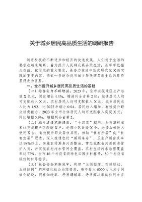 关于城乡居民高品质生活的调研报告随着科技的不断进步和经济的快速发展,人们对于生活的要求也越来越高。着力提升人民群众高品质生活,是牢牢把握走在前、做示范的重大要求,是奋力推进中国式现代化X新实践的重要内容,探索一条适合我市城乡居民高品质生活的路径显得尤为重要。一、全市提升城乡居民高品质生活的基础(一)综合实力不断增强。2023年,全市实现地区生产总值X亿元,同比增长4.4%,增速列全省第2位;城镇居民人均可支配收入X元,农村居民人均可支配收入X元,城乡居民收入比为1.92,比2022年缩小0.04。居民收入增加,有效提升群众消费能力,2023年全市全体居民人均可支配收入实现X元,同比增幅5.9%,增幅列全省第2。(二)城乡建设不断提质。十四五期间,全市高标准累计完成棚户区改造X户,老旧小区改造X个,老楼加梯投入使用X台,有效提升群众居住品质,推动住有所居向住有宜居迈进。深入推进农村厕所革命,卫生户厕普及率达98%以上。实施农村黑臭河道整治,常态化配备河道保洁管护人员,并实现农村污水管网全覆盖,农村生活污水治理覆盖率达77%。全市46个村获省级特色田园乡村称号,50个村获省级传统村落称号。(三)社会安全不断筑牢。构建三级指挥、四级联动、五级协同的网格化社会治理格局,每年投入6000万元用于网格化建设,网格知晓率、矛盾调解率、矛盾解决率均位列全省第一。深化精网微格工程,划分综合网格7066个、专属网格215个、微网格3.21万个。建立一网统管、一网通办两网体系,实现一号对外、一体派单、闭环运行,着力解决群众急难愁盼问题,实打实解决基层治理难题,增强群众获得感幸福感。(四)民生实事不断发力。每年安排全部财力的75%以上、新增财力的80%以上用于改善民生,扎实推进民生幸福工程,培育了一大批在全国、省内有影响力的民生工作品牌,塑造了30多个系列民生品牌。建成邻里中心·五美驿站72家,社区人气不断集聚,日均到访社区人数上涨28.2%,月提供服务活动数增加34.8%,居民满意率提高21.4%,投诉量下降18.9%,促使社区真正活起来。截至2023年年底,全市建有乡镇卫生院100个、社区卫生服务中心34个,村卫生室1067个、社区卫生服务站62个,基本建成15分钟健康服务圈,让群众在家门口就能得到便捷的医疗卫生服务。(五)社会文明不断提升。全市建成新时代文明实践中心(所、站)1715个,持续开展城乡结对、文明共建,构建起覆盖广泛、方便群众、精准服务的文明实践服务圈。建成市区十大市民文化广场,开放一批24小时自助图书馆、城市书房、阅读书吧,数字博物馆掌上图书馆投入使用。打造梅郎故里、戏曲圣地品牌,聚力提升里下河文学影响,合力传承郑板桥风骨,弘扬百姓日用而不觉的文化价值观,持续擦亮健康名城、幸福X城市名片。二、全市提升城乡居民高品质生活的短板虽然全市连续三年获评中国最具幸福感城市,我市城市知名度、美誉度得到进一步提升,但对照高质量发展的要求,对表群众实际需求,城市功能品质、民生供给质量还存在差距和短板。(一)居民收入水平相对较低影响着高品质生活构筑基础2023年我市居民人均可支配收入X元,低于全省的平均水平。文可居文库——海量学习资料,手机电脑均可下载www.wenkeju.com收入水平影响着消费支出,2023年我市居民人均消费支出为X元,全省排名第7位,与苏南城市相比还有一定差距,这是我市高品质生活建设的重要制约因素。(二)民生需求多样化增加了高品质生活的供给难度。新时代社会主要矛盾发生重大历史性变化,人民群众消费需求、民生诉求呈现多层次多样化特征。但当前我市供需适配能力较弱,传统服务领域的供给过剩、新型高品质服务供给不足,供给结构难以适应人民群众多样化需求的矛盾突出,生活消费环境与人民群众的期待不相适应的矛盾突出,从根本上打通制约消费潜力释放的堵点难点、更好满足多样化民生需求任务艰巨。(三)城市功能品质提升是市民对中心城市发展的迫切期待。近年来,围绕一轴一核三极三城总体布局,城市功能有所提升,城市面貌加速蝶变。但活力轴各片区空间相对割裂,支路成网体系尚未健全,向心力不强、离散度较高、辐射力有限。中心城区的商贸、教育、医疗、文化等服务功能,与周边城市相比缺乏竞争优势,与所辖县级市比,也无比较优势,没有形成功能级差,需要持续用力、精准发力,全力补短板、强功能、惠民生。(四)文化产业发展不足是当前文化供给的瓶颈。目前,综合性大型文化设施普遍存在场馆老化、设施陈旧、功能缺失等问题,市美术馆展陈能力差,梅兰芳大剧院亟待升级,精品小剧场建设滞后。与周边城市相比,我市在文化产业投入上明显不足,2023年度文化产业、旅游专项资金分别仅有700万元、900万元。而兄