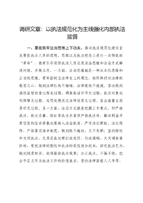 调研文章:以执法规范化为主线强化内部执法监督一、要在筑牢法治思维上下功夫。推动执法规范化建设首先要在执法人员的思想、思维以及执法理念上进行一次彻底的革命,教育引导消防执法人员运用法治思维和法治方式解决问题、开展工作。一方面,法治思维就是一种法本位思维和正当性思维。要牢固树立法律至上的观念,始终保持对法律的敬畏之心,做到法律红线不触碰、法律底线不逾越。坚决做到消防监督检查过程无过错、调查取证环节无过错、执法对象权利保障无过错、处罚处理决定法律适用无过错、自由裁量主观意识无过错。另一方面,法治方式就是把握三个重点。即严格执法、依法办事,除日常执法办案须严格执法外,解决利益矛盾引发的信访举报也要纳入法治轨道,严守法定职权、法定程序,严格落实清单制度,做到既不越权、又不失职;坚持理性和文明执法,尤其是在处理行政处罚、行政强制、火灾调查案件时,要把法律的刚性和执法的柔性结合起来,讲究执法艺术,做到刚柔相济,取得最佳执法效果;公正执法、不偏不倚,把公平正义作为执法工作的价值追求,坚持法律面前人人平等、程序公正与实体公正并重,积极推行双随机、一公开监管模式,正确行使行政自由裁量权,维护社会和谐稳定。二、要在树立正确考评导向上下功夫。推动执法规范化建设,关键是要着力构建科学有效的考评体系。首先,要树立正确的政绩观,牢固树立以人民为中心的执法思想,深入践行XXXXXX训词精神,克服急功近利的思想,务实推进执法规范化建设。要正确处理案件质量与业务数据的辩证关系,扎实办好每一起案件,在确保案件质量的前提下,强力推进消防业务工作。其次,提升法制人员地位、赋予更高权威、增强制衡推动力,做大做强内部执法监督力量。再次,要优化绩效评价机制,做好执法质量与绩效考核的合理衔接,树立起选人用人的正确导向,充分发挥绩效考核的指挥棒作用,让责任心强、执法质量高、工作业绩突出的执法人员,组织上能关心,待遇上能提升,构建人尽其才、才尽其用、劳有所获的执法质量激励约束机制。三、要在注重执法办案细节上下功夫。随着执法规范化建设的推进,执法工作的重心要放在各个执法环节的细节上、执法人员日常行为习惯的养成上,力求从细节入手、从点滴做起,规范执法行为。要进一步规范检查、受案及后续的处置工作,在充分总结监督检查、火灾调查办案经验教训的基础上,文可居文库——海量学习资料,手机电脑均可下载www.wenkeju.com进一步细化规范和流程,努力减少因执法环节不规范引发的行政复议、行政诉讼及涉消信访事件。要规范办案细节,从证据收集、办案程序、文书制作入手,细化各环节流程,特别是围绕受案、取证、集体议案、告知、决定、送达等易出现问题的环节,严禁避重就轻、弄虚作假。要规范案件处理,认真落实每一起案件的处理流程,防止因案件处理不当引发信访举报导致执法人员被追责问责。充分发挥法制员对执法办案的审核监督职责,对每个执法案卷均严格检查,每一个细节都过关后方能报领导审批。对办结的执法案件及时结案归,确保每一份案卷都如期装订入库。四、要在提升执法案件质量上下功夫。强化内部执法监督,是解决执法不公不严,提升执法公信力的有力保证。一是建立常态执法监督机制。要按照《xx市消防执法项目考评检查规则》标准和要求,进一步强化案件考评工作。逐渐形成法核人员从受案监督到案中指导,再到案后考评的法制审核模式,不断健全完善案件审核把关机制,确保案件质量。二是加强大队执法办案场所建设。在大队设立案件办理的专门场所,并设置录音录像的相关设备,案件办理的各个环节全程同步录音录像,实现对执法办案流程一站式管理、智能化管控、无缝隙监督。三是强化监督问责,提高警示效能。对消防执法人员的一文可居文库——海量学习资料,手机电脑均可下载www.wenkeju.com般不良行为及时进行教育提示,对滥用职权、玩忽职守等给消防部门造成不良影响的行为,一经查实将依据法律法规及纪律规定进行严肃追责问责。四是规范自由裁量权,确保合法公正。严格按照《消防救援局关于对部分消防违法行为实施行政处罚的裁量指导意见》和《消防行政处罚裁量基准(试行)》的相关规定,对行政处罚案件无论罚多罚少必须坚持集体讨论制度,以保证行政处罚程序合法、实体公正、过罚相当。五、要在提升执法人员素质上下功夫。一是加强执法队伍管理。严格落实执法人员考核制度,对少数庸懒散,不爱钻研业务,执法能力较弱的人员要予以警示和教育。建立支队消防监督业务人才库,通过执法办案能手评选、业务技能竞赛、岗位技能比武等多种形式,评选优秀执法人员,发挥引领示范作用。二是加强执法培训和交流学习。针对执法人员自身实际和业务知识需求,本着缺什么、学什么、练什么的原则,定期开展业务培训和练兵比武活动,采取邀请专家授课,以老带新、案例评查等方式,从案件受理、证据调取