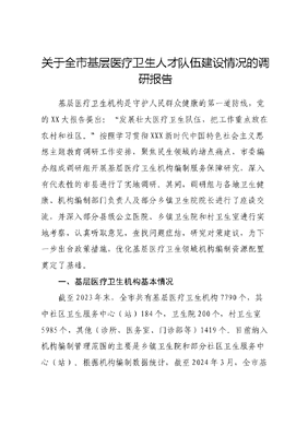关于全市基层医疗卫生人才队伍建设情况的调研报告基层医疗卫生机构是守护人民群众健康的第一道防线,党的XX大报告提出:发展壮大医疗卫生队伍,把工作重点放在农村和社区。按照学习贯彻XXX新时代中国特色社会主义思想主题教育调研工作安排,聚焦民生领域的堵点痛点,市委编办组成调研组开展基层医疗卫生机构编制服务保障研究,深入有代表性的市县进行了实地调研。其间,调研组与各地卫生健康、机构编制部门负责人及部分乡镇卫生院院长进行了座谈交流,并深入部分县级公立医院、乡镇卫生院和村卫生室进行实地考察,认真听取意见,查找问题症结,研究对策建议,为下一步出台政策措施,优化基层医疗卫生领域机构编制资源配置奠定了基础。一、基层医疗卫生机构基本情况截至2023年末,全市共有基层医疗卫生机构7790个,其中社区卫生服务中心(站)184个,卫生院200个,村卫生室5985个,其他(诊所、医务室、门诊部等)1419个。目前纳入机构编制管理范围的主要是乡镇卫生院和部分社区卫生服务中心(站)。根据机构编制数据统计,截至2024年3月,全市基层医疗卫生机构共核定事业编制9700名,实有在编人员7400人,空编2300名,空编率24%。按2023年末全市常住人口987万和相应的机构编制标准测算,编制总量基本能够达到编制标准,但编制使用效益较低。据卫生部门统计,乡镇卫生院和社区卫生服务中心(站)实有在岗职工14000人,编外聘用人员较为普遍。二、主要做法和成效(一)加大机构编制保障力度。推进基层医疗卫生机构管理体制和运行机制改革,进一步规范和加强乡镇卫生院机构编制管理,制定出台《××市乡镇卫生院机构编制管理规定(试行)》,全市以县为单位为乡镇卫生院统一核定事业编制9700名,实行总量控制和动态管理,严禁挤占和挪用,切实保障基层医疗卫生工作需要。(二)推进基层医疗卫生机构标准化建设。全面推进基层医疗卫生机构标准化建设和服务能力建设,实施《××市基层医疗卫生机构建设三年行动计划(2020—2023年)》,对标国家规定的服务能力标准,以优质服务基层行活动为载体,推动基层医疗卫生机构服务能力提升。截至2023年底,全市实现乡镇卫生院和社区卫生服务中心(站)服务能力全面达标。文可居文库——海量学习资料,手机电脑均可下载www.wenkeju.com(三)持续强化基层卫生人才队伍建设。全市全面实施基层卫生人才工程,通过转岗培训、订单定向培养、全科住院医师规范化培训、基层骨干医师培训等途径,县乡特招医学生1500人、特岗全科医生164人,培养培训全科医生5000余人,培养订单定向医学生324人,在职培训976名基层卫生骨干,在线培训1.5万人,为构建分级诊疗制度提供了坚实的人才支撑。(四)高质量推进紧密型县域医共体建设。全面推进优质医疗资源均衡布局,加快健全适应乡村特点、优质高效的乡村医疗卫生体系,高质量推进紧密型县域医共体建设,提质增效,扩容下沉,推动优质医疗资源公平可及。2019年,全市共有6个县(市)被纳入全国首批县域医共体建设试点。截至2024年3月,全市10个县(市)组建了19个紧密型医共体,县带乡、乡管村、县联市,县域整合一体、资源共享,为全国医共体建设提供了××方案。(五)不断完善乡村医生队伍保障。建立老年村医补助制度,对连续工作10年、到龄退出的老年乡村医生按每人每月300元发放生活补助,目前全市有5800人享受老年村医补助。建立多途径、多形式的乡村医生全员培训机制,并将具有执业文可居文库——海量学习资料,手机电脑均可下载www.wenkeju.com(助理)医师资格证书的乡村医生纳入369人才工程各项计划统筹安排。三、调研发现的问题(一)基层医疗卫生机构人才引进难、留不住现象普遍存在。受执业环境、薪酬待遇和发展空间等限制,在权衡考虑个人发展、目标追求、生活品质等现实需求后,年轻医务人员普遍倾向将城市作为就业首选地。同时,近年来县级以上公立医院和民营医院发展迅速,不断虹吸基层医疗技术骨干,基层工作岗位逐渐成为年轻医务人员积累医疗工作经验、获取以及提升个人医疗执业资质的平台或跳板,一些年轻人考取执业医师资格后,一旦有上级医院抛来橄榄枝给出优厚条件,便离职走人。(二)基层医疗卫生机构有编不补与编外大量聘用并存。一方面,全市基层医疗机构空编率达24%,调研走访的乡镇卫生院普遍存在编制使用效率不高问题;另一方面,为满足工作需要,基层医疗机构又存在大量编外聘用人员。据调研了解,大多数乡镇卫生院均有一部分员工甚至业务骨干长期在岗不在编,受限于身份、学历、进入渠道等原因,导致有编不能补,编制资源的正向激励和引导作用未能有效发挥。如:某县乡镇卫生院、社区卫生服务中心共核定编制130名,实有文可居文库——海量学习资料,手机电脑均可下