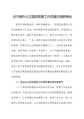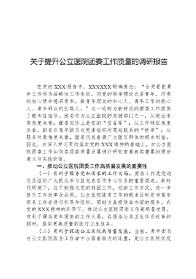 关于提升公立医院团委工作质量的调研报告在党的XXX报告中,AXXX明确提出:全党要把青年工作作为战略性工作来抓,用党的科学理论武装青年,用党的初心使命感召青年,做青年朋友的知心人、青年工作的热心人、青年群众的引路人。这一论断为新时代的团委工作提供了根本性指导。团委作为公立医院的关键部门之一,从政治本质角度来看,团委实际上是党的后备军;从工作特征角度来看,团委在青年团员与党团组织间架起联系的桥梁;从服务对象角度来看,团委代表着最广大团员群体的根本利益。因此,在深入学习贯彻落实党的XXX精神的基础上,对公立医院团委工作如何实现高质量发展进行研究有着极其重要的理论意义与实践价值。一、推动公立医院团委工作高质量发展的重要性(一)有利于服务党和国家的工作大局。团委工作是党动员及组织广大民众参与且完成各项中心任务的重要渠道。新时代环境下,应不断强化党的群团工作,创新工作方式,进一步提升工作效率及品质。公立医院团委工作的根本目标是对青年医务工作者进行引导和组织,同时为其提供各方面的服务。在党的XXX精神的引导下,推动公立医院团委工作高质量发展,有利于服务党和国家的工作大局,在服务公共卫生体系改革的同时,提供更高质量的医疗卫生服务。(二)有利于促进公立医院高质量发展。当前,青年团员在公立医院医务工作者中占据着较大的比重,是公立医院实现高质量发展的核心力量。新时代环境下,公立医院高质量发展面临全新的机遇及挑战,更加需要青年医务工作者的力量。在党的XXX精神的引导下,推动公立医院团委工作高质量发展,应全面发挥团委在青年医务工作者中的引领作用,推动其积极投身到公立医院高质量发展事业中,充分激发青年医务工作者的创造性和主动性,促进公立医院的高质量发展。(三)有利于推动青年群体成长成才。随着公立医院改革的不断深化,青年团员的重要作用逐渐凸显。团委作为医院与青年医务工作者间的联系纽带,可以将青年团员紧密联系起来,引领他们积极参与医院的各项工作及活动。在党的XXX精神的引导下,推动公立医院团委工作高质量发展,可以全面发挥团文可居文库——海量学习资料,手机电脑均可下载www.wenkeju.com委在青年医务人员培养、引导及组织方面的重要作用,不断提高青年团员的综合素质,推动青年群体成长成才,为公立医院的可持续发展提供强有力的人才保障。二、公立医院团委工作现状分析(一)青年团员思想政治工作开展难度较大。公立医院属于公共服务组织,需要为广大群众提供各种各样的医疗服务,所以,医务工作者尤其是青年群体每天承担着较为繁重的医疗任务,业余时间分散,公立医院团委集中对青年团员开展思政教育工作的难度相对较大。除此以外,公立医院各科室的负责人通常只会考虑该科室年度考核目标的达成情况,对青年医务工作者思想政治工作的关注度并不是很高。例如,有些科室负责人误以为团委工作仅仅是走个过场而已,认为明确要求自己科室的青年团员长时间参与各式各样的团委活动可能会对正常的医疗服务行为产生影响,从而忽视了对团干部的培养工作,有碍于公立医院青年团员思想政治工作的有序开展。(二)团委组织建设有待进一步强化。在现阶段的公立医院团委工作中,团委组织建设仍存在较为薄弱的地方,组织建文可居文库——海量学习资料,手机电脑均可下载www.wenkeju.com设有待进一步强化。从公立医院的工作实际来看,各科室青年医务工作者的流动性较大,部分科室的支部组织建设相对滞后,无法对青年团员进行合理有效的规范,对公立医院团委工作的正常实施有着较大程度的影响。与此同时,各科室支部组织负责人的整体素质仍需不断提高。部分负责人缺乏对公立医院团委工作的全面认识,大部分都是循规蹈矩地完成医院团委下达的各项工作任务,缺乏主动参与组织活动的积极性;有些支部组织负责人即使参与团委工作的积极性比较高,然而因为专业能力及相关工作经验的欠缺,导致团委工作有较大的随意性和盲目性,无法全面发挥公立医院团委工作的根本价值。除此以外,大部分支部组织负责人都是兼职的,每日都有较多的医疗服务工作任务,导致其无法将太多时间与精力放在团委工作上,进而影响到医院团委工作的开展。三、对策与建议(一)坚持党建带动公立医院团委工作的基本原则。新时代环境下,公立医院团委工作的高质量发展应始终坚持以党的XXX精神为根本引领,坚持党建带动公立医院团委工作的基本文可居文库——海量学习资料,手机电脑均可下载www.wenkeju.com原则。一是不断优化公立医院团委组织结构,以支部引导和组织青年医务人员。在公立医院各科室建设团支部,主要包含行政、医技、外科、内科、住培及后勤等,进一步细化组织结构,以各科室为基本单位成立团支部,形成科、院两级团组织体系,以此实现医院团委工作的全面覆盖。遵循党的XXX精神,着重突出党建带团建的