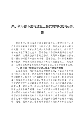 关于新形势下国有企业工会发展情况的调研报告新形势下,国内市场经济体制改革进入全面深化阶段,各产业逐渐朝着就业渠道宽、分配方式多、劳动关系多元的新方向发展。同时,国有企业改革如火如荼地向前推进,企业职工结构也发生了深层次变革。国有企业工会组织是联系企业与员工的桥梁,它既是企业运营的监督者,又是职工利益的维护者。面对新形势对国内产业链的冲击,国有企业工会工作迎来新机遇与挑战,如何通过开拓新的工作路径实现团结员工、靶向发力,促进企业高质量发展已成为国有企业工会工作的重要议题。一、新形势下创新国有企业工会工作路径的意义工会是代表、维护职工利益的特殊组织,与企业内各职能部门均无从属关系,但其工作实践路径又与企业各类业务有着密切的联系。国有企业内部的职能分化较为复杂,职工的工作属性和性格特点也各不相同,需要由工会适时沟通协调,在合乎规定的前提下尽可能满足员工诉求,为企业的发展稳定军心、凝聚力量。新形势下,经济全球化推动国内产业不断转型发展,国有企业竞争压力剧增。为在日新月异的市场中站稳脚跟,企业必须针对内部工作进行创新优化。创新工会工作有助于企业管理者更全面地捕捉到员工的实际状况与工作中的问题,并据此落实有针对性的优化措施,为国企供给侧结构性改革扫清阻碍。同时,创新工会工作有利于增强员工的归属感和企业的凝聚力。管理者与员工、员工与员工之间能够借助工会平台展开充分的交流,促进企业重大事项和员工工作信息的上下流动,推动企业生产活动平稳、有序推进。此外,科学、高效的工会工作有利于构建和谐、清朗的企业文化氛围,引导员工以更强的精神动力、更佳的精神面貌投身于工作,从而提升企业的生产效率与品质。二、新形势下国有企业工会工作的现状(一)管理模式难以适应企业改革创优趋势。新形势下,国有企业更加注重工会工作的完善与优化,在全面深化各项工作进程的同时,注重对员工的关心与帮扶,提升员工的工作幸福感与企业归属感,丰富工会工作的经验。不过,国有企业职工管理模式依然较为陈旧,对管理模式的优化仍处于情理层面,管人用人、监督治理、部门协调等方面的制度容易流于形式。很多制度的更新跟不上新形势对企业发展的客观要求。此外,当前部分国有企业工会不仅管理制度落后,在执行层面也存在不少漏洞。工会本该是服务职工、服务群众的专门机构,但部分国有企业工会在运营实践中有着超出必要的权力特质与行政属性。极个别国有企业工会管理者大搞一言堂,对基层员工的个人诉求视而不见,甚至出现暗箱操作现象,大幅降低了工会服务质量与企业内部改革效率。(二)管理者的专业素养不足以推动企业业务能力提升。新形势对国有企业工会工作人员的职业素养提出了更高要求,工会工作要求管理者掌握基本的工作技能,并具备丰富的实践经验和扎实的马克思主义理论水平。很多工会管理者在有意识地向上述要求靠拢,但由于往昔工作中积累的经验与新形势下的工会工作格局存在一定代沟,工会管理者的专业素养常常跟不上时代发展的要求。在工会工作的过程中,部分工会管理者和工作人员思想观念落后、专业素养不高。为了解员工的心态变化、帮助困难员工走出困境,工会经常需要开展常态化、高密度的走访调研工作,这对工会管理者和工作人员的个人素养、文可居文库——海量学习资料,手机电脑均可下载www.wenkeju.com沟通技能、调查能力有着较高的要求。例如,要想了解一名员工的婚恋问题,就必须以较高的共情能力打开员工心扉,深入了解其生活。但是,当前很多工会管理者并不具备这种不怕困难、精益求精的工作态度,服务能力与专业素养均不够高,难以为创新工会工作路径提供有效的助力。(三)信息化建设水平难以满足企业生产经营需求。随着信息技术的发展普及,国内各类产业快速迈入自动化、智能化阶段,纷纷借助大数据、区块链和人工智能等技术提升自身的业务水平。国有企业工会也迎合时代发展趋势,主动提升信息设备、软件程序等基础设施的建设水平,同时,在建档归档、绩效考核、工作记录与发布等具体的工作中融入信息技术,如利用钉钉、微信群、公众号发布企业战略规划与奖惩标准等。但是国有企业工会没有针对本身的工作特性开发相应的工作平台,导致信息技术的介入呈现较大的随意性,缺乏规范的信息化工作体系。由于国有企业工会本身并不具有营利性质,因此没有受到基于客户需求增长所产生的倒逼效应的直接影响,在信息化建设方面慢人一步,并间接抑制了企业业务效能的提升。由于缺少完善的信息化工作平台,工会在教育推广、交流沟通与活动设计等方面难以形成规范化、集约化的工作流程。部分工会管理者只是机械地完成上级分发的任务,对工会本身所秉持的服务精神与团结理念并不放在心上。此外,很多管理者虽然有着较强的服务意识,但缺少对企业文化、党建文化及各岗位职能特点的了解途径,在一定程度上阻碍了工会工作的顺利开展。三、新形势下国有企业工会工作创新提效的