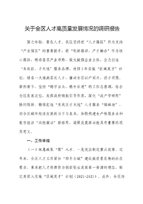 关于全区人才高质量发展情况的调研报告国之命脉,重在人才。我区坚持把人才强区作为支持产业强区的重要抓手,将创新驱动、产才融合作为核心路径,精准落实产业布局,做大做强企业主体,全力打造来我区、才无忧服务品牌,连续3年实施区域英才计划,储备一大批高层次人才,推动全区以产而兴、因才而强。新形势下,坚持稳字当头、稳中求进的工作总基调,结合全区发展定位,发挥政府领航引导作用,深化政产学研用协同创新,精准打造来我区才无忧人才服务强磁场,对全区城市经济发展的当下与未来,加快构建生产性服务业和数字经济双轮驱动新格局,凝聚发展新动能具有重要的现实意义。一、工作举措(一)优惠政策聚人才。一是突出制定重点政策。近年来,全区人才工作紧扣四个主城建设高质量发展的内在要求,秉承把人才资源作为创新创业发展第一资源的理念,制定并深入实施区域英才计划(2021-2025)。此外,全区持续打造名校高企产才行活动品牌,更大范围招引集聚海内外优秀人才,补齐全区专业人才缺口,并全方位支持保障人才就业创业,营造来我区、才无忧的服务环境。二是加快完善配套政策。出台《关于实施区域英才计划(2021-2025)的意见》的同时,加快四个子计划完善落地。聚焦智能制造业、新一代信息技术等方向,实施产业强区人才引进计划。十四五期间,聚焦城市经济发展需要,实施行业紧缺型人才引进计划,在民生保障人才引进培养计划中注重教育和卫生人才的引进培养。聚焦智能制造业、现代服务业,实施大学生就业创业促进计划,并在加强互动联系、建立绿色通道、促进合作对接、保障权益落实等方面提供应享尽享的政策支持。(二)多措并举育人才。一是整合人才培养项目。全区以产业需求为导向,聚焦智能制造业、新一代信息技术等方向,推出产业强区人才叠加包随心包定制包,以创业孵化、项目资助、跟奖跟补、生活服务等多种形式,推动创业变革、效率变革、服务变革,吸引了一批科技人才项目在文可居文库——海量学习资料,手机电脑均可下载www.wenkeju.com联想星云创新中心和长江金融产业园落户。二是实施重点人才工程。全区致力完善人才涵养蓄水池,整合教育卫生等民生保障领域人才政策,从人才端、供给侧发力,奖补并重,进一步将人才优势转化为营商环境优势。区第十四批科技镇长团配合区科技局密切关注人才及其项目团队的研发情况,及时解决发展需求,帮助申请研发经费,激发人才创新活力。对外招引高层次人才,立足区新一代信息技术产业优势,兼顾其他前瞻技术领域,以重点产业需求和技术缺口为导向,全方位多渠道挖掘高层次人才及团队,引入5G边缘云河湖巡视监测智能船技术及产业化等博士团队(项目)签约入驻,努力集聚人才高智资源,推动创新发展。三是开展人才素能培训。我区积极探索内培+外引人才工作模式,聚焦本土人才培育。指导星云创新中心开展双百菁英科技企业家特训营,覆盖制造业、信息技术、新零售、生物医药等领域,为本土各类双创主体搭建交流分享创业创新经验的平台,营造良好的双创文化氛围。文可居文库——海量学习资料,手机电脑均可下载www.wenkeju.com(三)因势利导用人才。一是培育企业孵化载体。让扶持政策落地落细,让企业发展得到真正实惠。我区积极探索助力培育企业孵化载体新模式。我区去年全年新增市级孵化器1家、众创空间2家。联系社会资本投资建设孵化载体,吸引创投公司为前景好、科技含量高的在孵企业提供投融资服务,扩大孵化载体金融服务渠道也是区第十四批科技镇长团助力企业发展的积极探索。在深入贯彻《**区关于加快推进产业发展的政策意见(修订版)》等惠企政策基础上,帮助星云创新中心累计获得1536万元资金扶持,并享受场地、租金、物业等方面的优惠。二是搭建校地合作平台。我区持续擦亮名校高企产才行活动品牌,围绕校地融合,举办西安招才引智**日区域专场活动,赴上海、广州、深圳等6个城市双招双引推介人才政策环境,与省政府驻深办、南航、西安理工等单位签订合作协议,搭建校地合作新平台,东大校友经济产业园人才工作站正式启用,西理智造园、东大国家技术转移中心和校友经济产业园先导区、南航国家技术转移分中心等平台建设快速平稳推进。与此同时,高校人才工作站建设有条不紊推进,文可居文库——海量学习资料,手机电脑均可下载www.wenkeju.com经统计,东大校友经济产业园先导区目前已经入驻企业15家,吸纳高层次人才30余人,其中数字经济领域企业6家,初步形成了以智能制造、数字经济为核心的产业集群。三是建设科技示范高地。我区坚持以高层次平台集聚高层次人才,让引来的凤有枝可栖。近年来,我区持续推动官塘创新社区建设,围绕1+2+6产业体系
