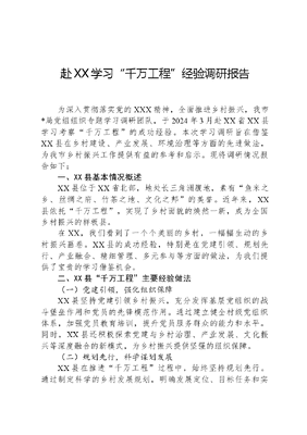 赴XX学习千万工程经验调研报告为深入贯彻落实党的XXX精神,全面推进乡村振兴,我市*局党组组织专题学习调研团队,于2024年3月赴XX省XX县学习考察千万工程的成功经验。本次学习调研旨在借鉴XX县在乡村建设、产业发展、环境治理等方面的先进做法,为我市乡村振兴工作提供有益的参考和启示。现将调研情况报告如下:一、XX县基本情况概述XX县位于XX省北部,地处长三角洲腹地,素有鱼米之乡、丝绸之府、竹茶之地、文化之邦的美誉。近年来,XX县依托千万工程,实现了乡村面貌的焕然一新,成为全国乡村振兴的样板县。在XX,我们看到了一个个美丽的乡村,一幅幅生动的乡村振兴画卷。XX县的成功经验,特别是在党建引领、规划先行、产业融合、精细管理、多元参与等方面的做法,为我们提供了宝贵的学习借鉴机会。二、XX县千万工程主要经验做法(一)党建引领,强化组织保障XX县坚持党建引领乡村振兴,充分发挥基层党组织的战斗堡垒作用和党员的先锋模范作用。通过建立健全村级党组织体系,加强党员教育培训,提升党员服务群众的能力和水平。同时,XX县还积极探索党建与乡村治理、产业发展、文化振兴等深度融合的新模式,为乡村振兴提供坚强的组织保障。(二)规划先行,科学谋划发展XX县在推进千万工程过程中,始终坚持规划先行。通过制定科学的乡村发展规划,明确发展定位、目标任务和实施路径。在规划编制过程中,XX县注重听取群众意见,尊重地方特色,确保规划符合实际、具有可操作性。同时,XX县还加强规划实施的监督检查,确保规划落地生根、取得实效。(三)产业融合,促进农民增收XX县以农业为基础,大力发展乡村旅游、休闲观光等新兴产业,推动一二三产业融合发展。通过培育新型农业经营主体,推广现代农业技术,提高农业生产效益和农产品附加值。同时,XX县还积极打造乡村旅游品牌,提升乡村旅游服务质量和水平,吸引更多游客前来观光旅游,带动农民增收致富。(四)精细管理,提升乡村品质XX县注重乡村精细化管理,通过完善基础设施、加强环境整治、提升公共服务水平等措施,不断改善乡村人居环境。同时,XX县还积极推进乡村文化建设,挖掘乡村文化资源,打造具有地方特色的文化品牌,提升乡村文化内涵和品质。(五)多元参与,凝聚发展合力XX县在推进乡村振兴过程中,注重发挥政府、市场、社会等多元主体的作用,形成合力推动乡村振兴。政府通过制定政策、提供资金支持等措施,为乡村振兴提供有力保障;市场通过引入社会资本、推动产业创新等方式,为乡村振兴注入活力;社会通过志愿服务、文化教育等途径,为乡村振兴贡献力量。三、对我市乡村振兴工作的启示与建议通过本次赴XX学习千万工程经验的活动,我们深刻感受到了乡村振兴工作的深远意义与巨大潜力。结合XX县的成功经验和我市的实际情况,我们获得以下重要启示,并提出相应的建议。(一)坚持以人民为中心的发展思想,把实现人民对美好生活的向往作为出发点和落脚点XX县在实施千万工程过程中,始终坚持以人民为中心的发展思想,将农民群众的切身利益放在首位。通过不断改文可居文库——海量学习资料,手机电脑均可下载www.wenkeju.com善农村生产生活条件,提高农民的生活质量,使农民有更多获得感、幸福感、安全感。这启示我们,乡村振兴工作必须紧密围绕农民群众的需求和期望,解决他们最关心、最直接、最现实的利益问题,才能真正赢得农民的支持和拥护。为此建议:建立健全农民需求反馈机制,定期收集农民意见和建议,确保乡村振兴工作更加贴近实际、符合民意;加大农村基础设施建设力度,提升农村公共服务水平,不断改善农民生产生活条件;深入开展农民教育培训,提高农民素质和技能水平,拓宽农民增收致富渠道。(二)坚持新发展理念,推动乡村振兴XX县在实施千万工程过程中,坚持新发展理念,注重发展方式的转变和发展质量的提升。通过推动农业高质高效、乡村宜居宜业、农民富裕富足,实现了乡村振兴的全面发展。这启示我们,要推动乡村振兴,必须坚持以新发展理念为统领,推动发展方式转变,实现高质量发展。为此建议:加强乡村振兴战略规划,明确发展目标和路径,确保各项工作有序推进;推动农业产业转型升级,发展绿色生态农业,提高农产品附加值和市场竞争力;加强农村生态文明建设,保护农村生态环境,实现农业生产和生态保护的良性循环。(三)强化系统观念,推动城乡融合发展XX县在实施千万工程过程中,注重统筹城乡发展,推动城乡要素平等交换和双向流动。通过加强城乡基础设施和公共服务设施建设,实现了城乡关系的深刻变革。这启示我们,要推动乡村振兴,必须强化系统观念,将农村和城市作为一个有机统一的整体来考虑,推动城乡融合发展。为此建议:加大改革力度,破除城乡二元结构,推动城乡要素平等交换和双向流动;加强城乡基础设施和公共服务设施建设,实现城乡基础设施互联互通、公共服