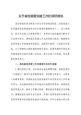 关于高校基层党建工作的调研报告基层党组织是发挥战斗堡垒作用的根基所在,基层党建工作质量高低是衡量基层党组织效能的重要标准之一。迈入新时代,在百年未有之大变局背景下,各种非主流价值观不断冲击主流意识形态,高校基层党建工作也面临重大挑战。探索高校基层党建工作质量提升的路径,在困局中破局,于危机中开新机,对于保障党对高校教育的领导地位,发挥党建的引领作用,构建高效而完善的党建工作体系,提升党建工作质量,具有重要的现实意义。一、高校基层党建工作质量提升的时代意蕴1.强化思想引领、夯实政治底色的重要举措。高校是落实立德树人根本任务的重要场所,承担着为党育人、为国育人的重要职能。而高校基层党建是高校开展思想政治工作的基本单元,决定着高校的办学底色及对高校的领导权。加强高校基层党建工作,推进工作模式创新,激发基层党建的活力和魅力,增强党务队伍的专业化素养,有利于发挥党建的引领作用,更好贯彻落实党和国家的教育方针政策;有利于提高大学生的政治素养,引导广大青年学生树立正确的世界观、人生观、价值观;有利于增强大学生五个认同意识,坚定四个自信、做到两个维护。以党建发挥思想引领作用,可以夯实高校育人底色,赓续红色血脉,培养出合格的社会主义建设者和接班人。2.落实三全育人理念、增强育人实效的关键环节。三全育人即全员、全过程、全方位育人。AXXX指出,加强和改进高校党的建设,是办好中国特色社会主义大学的根本保证。基层党建工作是高校整体党建工作的基础环节,亦是三全育人的应然之义,基层党建工作质量高低也是衡量是否践行三全育人理念的重要标准之一。提升基层党建工作质量,有利于落实三全育人理念,提升学生的综合素养。加强党务组织领导,统筹支部书记、支部委员、专职辅导员及广大党员教师的工作,开展常态化沟通,发挥育人合力,是全员育人的重要支撑。以党建引领确立学业导师制,由点到面,由低年级到高年级,实现学业全程指导,推动思政育人和党性育人同向同行,是全过程育人的重要落脚点。只有强化基文可居文库——海量学习资料,手机电脑均可下载www.wenkeju.com层党建工作,促进党建育人、思政育人,以党建融合专业教育,推动党建和专业教育协同育人,才能发挥育人合力,实现全方位育人。3.促进教育改革、破解育人难题的有效途径。高校党建工作是高等教育改革发展的重要推动力,为高等教育改革发展提供坚实的政治保障。随着信息技术的广泛应用,各种信息技术手段应运而生,各种非主流价值观纷然杂陈,使高等教育在面临重大机遇的同时,也面临严峻挑战。高校基层党建工作守正创新,是助力高等教育改革抓住机遇应对挑战的坚强后盾。高校基层党建不断创新工作方式方法,优化管理机制,提升破解育人问题的针对性,有助于发挥其排头兵作用,促进高等教育改革发展。二、高校基层党建工作存在的问题高校基层党建在凝心聚力、推进教育改革、强化组织领导方面发挥了重要作用,有效保障了社会主义社会制度下大学的政治底色和鲜明特色。然而,在复杂多变的现实环境下,仍有部分高校基层党组织在开展党建工作过程中存在创新性不足、文可居文库——海量学习资料,手机电脑均可下载www.wenkeju.com管理机制不健全、党务队伍综合素质不高等现实问题。破解这些难题是强化党建工作、提升工作质量的必然要求。1.高校基层党建工作缺乏创新性。高校基层党建工作要不断守正创新,才能适应形势变化的新要求。然而,部分高校基层党组织由于理念更新不快、工作任务繁重、党务队伍人数不足等原因,工作模式单一化,工作方式方法简单。首先,新媒体未能有效赋能党建工作。部分高校基层党组织没有充分利用新媒体技术,互联网+党建意识不强,由此也限制了党员教育的实效性,未能精准聚焦以适应时代发展的新常态。其次,部分基层党支部仍侧重于采用传统方式开展党建工作,单纯以讲座、会议等形式完成主题教育等系列活动,重数量、轻质量,缺乏创新动力,尽管完成基本规定动作,却忽视了党建效能的发挥和党员干部的获得感。2.高校基层党建工作管理机制不健全。加强高校基层党建工作,要明晰基层党组织工作由谁来开展、怎样开展、如何发挥党务工作人员作用等问题。然而,部分高校没有结合高校二级院系的实际设置基层党组织,基层党组织无法发挥组织保障文可居文库——海量学习资料,手机电脑均可下载www.wenkeju.com和协同合作的效能。部分基层党支部指标体系建设不清晰,只是完成了规定动作,在如何加强品牌建设,发挥和增强基层党组织的影响力和引领力方面并不尽如人意。部分基层党组织激励机制不健全,评价和考核体系有待优化,部分党务工作者以躺平心态面对日常党务工作,没有发挥自身的应有作用。3.党务工作队伍综合素质不高。高素质的党务者工作队伍是强化党建工作的根基,党务