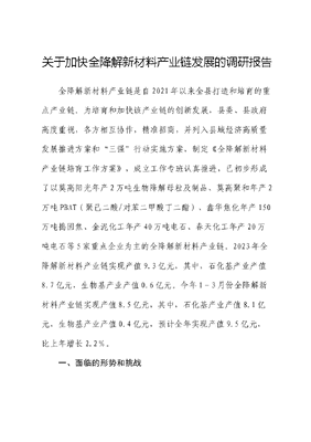 关于加快全降解新材料产业链发展的调研报告全降解新材料产业链是自2021年以来全县打造和培育的重点产业链。为培育和加快该产业链的创新发展,县委、县政府高度重视,各方相互协作,精准招商,并列入县域经济高质量发展推进方案和三强行动实施方案,制定《全降解新材料产业链培育工作方案》,成立工作专班认真推进,已初步形成了以莫高阳光年产2万吨生物降解母粒及制品、莫高聚和年产2万吨PBAT(聚己二酸/对苯二甲酸丁二酯)、鑫华焦化年产150万吨捣固焦、金泥化工年产40万吨电石、春天化工年产20万吨电石等5家重点企业为主的全降解新材料产业链。2023年全降解新材料产业链实现产值9.3亿元,其中,石化基产业产值8.7亿元,生物基产业产值0.6亿元。今年1-3月份全降解新材料产业链实现产值8.5亿元,其中,石化基产业产值8.1亿元,生物基产业产值0.4亿元,预计全年实现产值9.5亿元,比上年增长2.2%。一、面临的形势和挑战(一)全降解新材料产业发展机遇。当前限塑禁塑已成为可持续发展的共识。我国年生产塑料1亿吨,需求量在9000万吨左右,废弃塑料对环境的危害日益严重,引起了党和政府的高度重视。2008年国务院下发了《关于限制生产销售使用塑料购物袋的通知》;2019年国家发改委进一步明确了《产业结构调整指导目录(2019年本)》,新增了生物降解塑料及其系列产品开发、生产和应用等作为鼓励类产业;2020年国家发改委、生态环境部出台了《关于进一步加强塑料污染治理的意见》,规定到2020年底全国范围餐饮行业禁止使用不可降解的一次性塑料用品;2021年为进一步加强塑料污染全链条治理,推动十四五白色污染治理取得更大成效,国家发改委、生态环境部印发了《十四五塑料污染治理行动方案》,2023年国家工信部、生态环保部等六部门出台了《关于十四五推动石化化工行业高质量发展的指导意见》,建立完善生物降解塑料相关标准体系,加快可降解材料制品等绿色轻工产品消费。在全国限塑禁塑浪潮的大背景下,加快发展全降解新材料产业具有巨大的市场潜力和发展空间。文可居文库——海量学习资料,手机电脑均可下载www.wenkeju.com(二)国内全降解新材料产业发展现状。全降解新材料产业是国家确定的战略性新兴产业之一。现在国内全降解新材料产业尚处于推广阶段,其中PBAT和淀粉基塑料、PBS(聚丁二酸丁二醇酯)和PLA(聚乳酸)是当前国内研究和应用最多、技术相对成熟、有一定产业化规模的全降解新材料。据统计,全国已建成生产的全降解新材料企业有19家,年产能119万吨,产值约256亿元,在建企业有14家,年产能290万吨。这些企业主要分布在江苏、河南、安徽、吉林和新疆等地。目前全国全降解新材料加工使用量约100万吨,未来五年,降解新材料需求保持快速增长,到2025年全降解新材料需求量约为350-450万吨。由于限塑禁塑政策执行不力,当前新上项目超过市场需求承载能力,产能相对过剩。(三)全县全降解新材料产业发展面临的挑战。莫高阳光和莫高聚合是目前全省唯一生产生物降解新材料的企业,具有良好的发展远景。我县全降解新材料产能仅占全国已建成产能的3.4%。相较于全县其它打造和培育的产业链、规模相对较小、基础也不够稳固,以现有的产能和发展条件,按照全县全文可居文库——海量学习资料,手机电脑均可下载www.wenkeju.com降解新材料产业链培育发展规划目标,要形成以聚乳酸和生物降解塑料为核心的产业集群,并成为全国重要的全降解新材料产业基地任务艰巨。二、存在的问题(一)限塑禁塑政策不及预期。从2008年国家出台限塑禁塑政策以来,近些年国家相关部委和部分省市都陆续发布出台了各种限制和禁止一次性塑料制品的政策文件,但在实际执行和落实上与文件要求相差甚远,没有出台针对可降解塑料行业配套政策及细化监管措施等,限塑禁塑政策一直没有得到强制性实施,使得全降解新材料及其用品在省内没有得到大规模推广,致使我县全降解新材料产品在省内市场受阻,省外拓展因成本较高困难较大。(二)土地制约因素较大。受全县国土空间规划三区三线划定范围影响,工业园区(县城东部片区)可用土地不足,原规划的生物降解新材料产业园用地量较大无法保障,工业园区(**片区)亦因土地原因,石化级新材料的一些项目无法落地,整体产业链建设进展缓慢。文可居文库——海量学习资料,手机电脑均可下载www.wenkeju.com(三)基础项目影响产业链快速延伸。全降解产业链的基础项目是电石、乙炔和BDO(1,4-丁二醇),因春天化工停产,复产难度大,金泥化工电石(使用金川区境内石灰石自有矿原料)仅能满足金川公司需求,我县用于生产下游产品的原材料严重不足,沿海采购原材料回销下游产品成本很高,依托资源优势,尽快采取引资和以商招商的方式