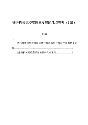 推进机关党校高质量发展的几点思考(2篇)目录1.坚持党建引领提升培训质效推动新时代党校工作高质量发展22.推进机关党校高质量发展的几点思考5坚持党建引领提升培训质效推动新时代党校工作高质量发展中共山东省国资委党校自成立以来,始终坚持把加强党校建设和党员教育培训作为贯彻新时代党的建设总要求和新时代党的组织路线的重要内容,深入学习贯彻XXXXXX关于党校工作重要论述要求,认真落实《中国共产党党校(行政学院)工作条例》《2019-2023年全国党员教育培训工作规划》及我省实施意见,完善体制机制,整合系统资源,高质量完成各类调训、培训任务,被评为山东省先进党校。一、坚持统筹谋划,全面落实党校系统工作部署一是加强组织领导。坚持把党校工作纳入省国资委党委党建工作总体安排,成立由省国资委党委书记任校长,分管领导任常务副校长的领导体系。指导各省属企业党委和企业党校密切配合,推动教育培训工作协调推进、形成合力。二是统筹安排计划。印发《省属企业2019-2023年党员教育培训工作实施方案》,对总体目标、课程体系、培训方式、组织保障等提出明确要求。结合省国资国企改革发展和党的建设工作实际,每年研究制定党校培训计划,及时跟进学习XXXXXX最新重要指示批示精神和省委部署要求,分期分批、分层分类开展系统文可居文库——海量学习资料,手机电脑均可下载www.wenkeju.com培训。三是压实培训责任。坚持把党员教育培训作为各级党组织书记全面从严治党述责述廉和抓基层党建工作述职评议重要内容,纳入党建工作责任制考核,并作为各级党组织评先树优的重要依据,督促指导各级党组织切实担负起党员教育培训主体责任和党组织书记第一责任人责任。二、把牢政治原则,确保教育培训工作正确方向一是坚定政治方向。坚持党校姓党这一根本原则,把学习贯彻XXX新时代中国特色社会主义思想作为中心内容和首要任务,深入开展马克思主义基本原理和中国特色社会主义理论体系学习培训,突出抓好思想政治建设和能力建设,教育引导广大党员干部自觉向党中央决策部署对标看齐,带头做两个确立的坚决拥护者和两个维护的忠诚践行者。二是夯实主业主课。强化党的理论教育和党性教育的主业主课地位,开展党的十九届历次全会、党的XXX精神专题培训,组织不忘初心、牢记使命主题教育读书班和党史学习教育专题学习班,每年举办基层党组织书记轮训、党务工作者示范培训等班次,累计举办各类培训百余批次,培训省属企业领导人员、经营管理骨干、党务干部、基层党组织书记等两万余人次。三是坚持从严治校。坚持把从严治党要求和从严治校方针结合起来,通过日常监督、重点任务督办等形式,对各类培训开展督导检文可居文库——海量学习资料,手机电脑均可下载www.wenkeju.com查,推动形成多部门联合管理、全程督导,班委自主管理、学员自律管理的培训管理模式。三、推动创新提质,持续提升教育培训工作成效一是完善课程体系。始终把质量立校作为党校工作的重要抓手,针对国资国企党员干部教育培训实际,广泛开展问卷调查、调研考察,摸清培训需求、按需因材施教。在开展党的创新理论、党史国史教育、党章党规学习等主体班次的基础上,菜单式、精准化开办国企统一战线、党建工作实务等培训。二是创新教学形式。科学设置专家授课、考察观摩、研讨交流、学员论坛、学情反馈等环节,创新开展案例教学、现场比武、党性体检等精品实操课程,将沉浸式、情景式教学融入培训。三是加强阵地建设。在山东省乡村振兴齐鲁样板研究院挂牌中共山东省国资委党校泰安教学基地,在山东人才集团泰山高级经理研修院挂牌山东国资党员干部培训基地。指导省属企业建好用活红色教育基地、党性教育基地、网络教育平台,广泛开展党史知识大赛、红歌快闪、党史微课、艺术党课等活动,进一步汇聚优质资源,提升培训质效。文可居文库——海量学习资料,手机电脑均可下载www.wenkeju.com推进机关党校高质量发展的几点思考党校是干部教育培训的主阵地、主渠道,机关党校作为重要组成部分,发挥着重要作用。近年来,中央、省委对新时代党校事业发展的更高标准,机关干部队伍思想政治建设的更高要求,机关干部学历层次和理论水平的不断提高,给机关党校的培训工作提出了更高的要求。机关党校承担的教学培训任务、学员培养目标等方面与其他党校相比也更具机关特色。必须在继续发挥好党校优良传统和政治优势的基础上,贴合机关实际,突出机关特色,全面加快教学科研改革创新
