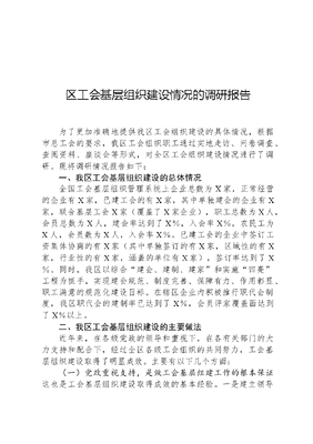 区工会基层组织建设情况的调研报告为了更加准确地提供我区工会组织建设的具体情况,根据市总工会的要求,我区工会组织职工通过实地走访、问卷调查、查阅资料、座谈会等形式,对全区工会组织建设情况进行了调研。现将调研情况报告如下:一、我区工会基层组织建设的总体情况全国工会基层组织管理系统上企业总数为X家,正常经营的企业有X家,已建工会的有X家,其中单独建会的企业有X家,联合基层工会X家(覆盖了X家企业),职工总数为X人,会员总数为X人,建会率达到了X%,入会率X%,农民工为X人,会员数为X人,入会率X%。已建工会的企业中签订工资集体协商的有X家(其中单独签订的有X家,区域性的有X家,行业性的有X家,涵盖的单位有X家),签订率达到了X%。同时,我区以综合建会、建制、建家和实施四亮工程为抓手,实现建会规范、制度完善、保障有力、作用彰显、职工满意的规范化建设目标。在辖区企业内积极推行职代会制度,我区职代会的建制率已达到了X%,会员评家覆盖面达到了X%以上。二、我区工会基层组织建设的主要做法近年来,在各级党政的领导和重视下,在各有关部门的大力支持和配合下,经过全区各级工会组织的共同努力,工会基层组织建设取得了明显成效。主要有以下几个方面:(一)党政重视支持,是做工会基层组建工作的根本保证这也是工会基层组织建设取得成效的基本经验。一是建立领导机构。目前,我区各镇(街道)的工会主席均由镇(街道)班子成员负责。二是坚持党建带工建的方式。我区各镇(街)在部署党建工作时,同步部署、检查、考核、评比工会组建工作,做到了党建带工建、工建促党建。(二)健全建会机制,是工会基层组建工作常抓不懈的制度保证。为了使工会基层组织建设工作长期有人抓、有人做,近年来,我区工会对各镇(街道)工会、企事业工会组织不断建立健全各项工会组建工作机制,以机制促进建会。一是分片包干制度。每年年初我区工会全委会领导都要与各镇(街道)工会分管领导签订责任状的方式,明确主要领导和分管领导的责任。二是目标管理制度。这是促进各镇(街)工会联合会组建的普遍做法。(三)随着发展改变建会方式,是工会基层组建工作的思路。我区工会在基层组织建设过程中,从实际出发,通过建立联合基层工会、基层工会联合会、社区工会或本地区域性、行业性工会等方式,把难以单独建会单位的职工组织起来,通过组建工会联合会、联合工会等方式,把大量分散、流动的职工团结在工会组织周围。三、当前工会基层组织建设中存在的问题与不足(一)个别单位的党政领导和企业法人思想认识模糊的问题。个别单位的党政领导不重视工会工作,工会工作常处于被忽视的尴尬地位,导致很多工会工作无法正常开展。而部分企业法人的《工会法》意识缺乏,认为企业建不建工会对企业发展影响不大,甚至认为建立工会可能影响企业对职工的管理,工会只会增加自己的对立面,出现问题工会都是站在职工方这种错误观点;再者就是认为本企业已经做到管理渠道畅通、职工福利能按时发放,没有必要建立工会。(二)立法不健全的问题。虽然《工会法》规定企业、事业单位、机关有会员25人以上的,可以建立基层工会委员会,但是并没有是强制性的要求一定要建立工会组织,部分文可居文库——海量学习资料,手机电脑均可下载www.wenkeju.com企业在不建立工会时,也没有法律支撑。又如,有些企业建立了工会组织,也选举了工会主席和工会委员,但是工会主席也只能听从企业老总的安排,并不能实实在在的做好工会工作,为职工群众服好务。(三)部分工会干部自身的问题。一是部分基层工会干部对工会基层组织建设的艰巨性、长期性、复杂性没有足够的认识,认为能建的都建了,缺乏对这项工作长期的、系统的规划和安排。二是部分基层工会干部存在畏难情绪。常归咎于党政领导对组建工会支持力度不够、企业对组建工作有抵触情况等客观因素,因而对待工会工作态度不积极,缺乏组建工会的积极性、主动性和自觉性。(四)工会组织的作用没有完全发挥。从我们调查了解的情况看,我区虽然大多数的党政机关都已建会,而且有些还是很早以前就已建会的,但是工会却没有发挥过作用。有些党政机关单位在经过人事调动之后,未能对工会组织及时换届、改选,致使工会组织呈现瘫痪状态。还有些党政机关单位的工会因为没有开展活动,所以职工完全不知道工会的存在,这种情况既有单位领导不重视,工会干部工作积极性不高的问题,又有兼职过多无精力顾及工会工作,或无经费保障无法开展工作的问题。四、对策与建议(一)加强工会政策法规的宣传教育,大力提升工会工作的影响力。要切实加强《工会法》、《贵州省工会工作条例》、《劳动法》等法律法规的宣传教育,不断提高党政领导、企业经营者和广大职工对工会工作的认知,使全社会切实认识到工会基层组织建设,是整个工会组织建设的基础,直接关系巩固党的阶级基础和扩大党的群众基础,是必须长期坚持