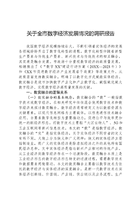 关于全市数字经济发展情况的调研报告我国数字经济规模持续壮大,不断引领着实体经济的发展各领域纷纷开启了数字化转型的进程。数字化转型伴随着新型生产要素与传统生产要素、新兴技术与传统技术的相互融合,其实质是融合发展。市政府十分重视数字经济的高质量发展,相继推出了《数字XX建设行动方案(20XX—2023年)》和《XX市促进数字经济产业发展若干政策》等政策文件,从政策层面支持数实融合,明确了以数字化方式赋能实体经济。数实融合是我市加快数字产业化和产业数字化、做强做优做大数字经济、实现数字经济高质量发展的关键。一、数实融合的逻辑关系(一)数实融合的基本概念。数实融合的数一般指数字技术或数字经济,在相关研究中往往混合使用数字技术和数字经济来探讨数实融合。数字经济通常被定义为以数据资源为关键要素,以现代信息网络为主要载体,以信息通信技术融合应用、全要素数字化转型为重要推动力,促进公平与效率更加统一的新经济形态。而数字技术主要指大区云物人、5G和工业互联网等新兴信息技术,本文的数是指数字经济。数实融合的实是指实体经济,关于实体经济不同学者的定义有所不同,大致上分为狭义和广义两种:狭义的实体经济主要指制造业,而广义的实体经济是除虚拟经济之外的其他所有国民经济总和,文中实体经济是指与新兴产业相对的传统产业。从工业经济到数字经济存在一个过渡阶段,数实融合本质上是工业经济形态向数字经济形态转变的过渡过程,需要数字技术和数据要素两轮驱动。本文的数实融合主要指以数字技术为依托的数字经济与实体经济的深度融合,是新一代数字技术在实体经济创新链、价值链、产业链、供应链以及业务流程、生产方式、商业模式等环节和领域的渗透和广泛应用的动态过程。数实融合能够利用数字技术对实体经济进行全流程、全方位的革命性重塑,充分发挥数据这一新型生产要素的效用,提升全要素生产率,从而推动数字产业化和产业数字化。(二)数实融合的演进历程。数实融合大致呈现三个阶段:第一阶段,数字经济与实体经济融合形式较为单一,二者只是简单相加,数字化要素开始少量地向实体经济渗透;第二阶段,新兴信息技术的不断发展为数实融合提供了技术支撑,数字经济与实体经济的融合进入快车道,并且在诸多领域数字经济引领实体经济发展;第三阶段,数字经济与实体经济的融合已涵盖全产业、各领域,大区云物人、5G和工业互联网等数字技术和数据资源以及数字化人才等数字化要素成为重要的新型生产要素,数字经济与实体经济浑然一体。目前,数实融合已成为实现数字经济高质量发展的重要动力和主要方式,我国数字经济也逐步进入深化应用、规范发展、普惠共享的新阶段。(三)数实融合促进数字经济高质量发展的作用机制。数字技术和数据要素双核驱动是数实融合的内在逻辑,也是数实融合促进数字经济高质量发展的重要作用机制。一方面,数实融合最直观体现的是以数字技术为依托的数字经济与实体经济的深度融合,通过数字技术能够有效提升实体经济中资本、技术、劳动力等生产要素的协作能力和生产效率,在加速传统产业数字化的同时,也孵化出了新产业、新模式和新业态,形成带有数字基因的新实体经济,助推数字经济高质量发展。另一方面,数实融合充分发挥了数据这一关键生产要素的最大效应,数据作为战略性资源和基础性资源,带有重要生产力的属性。通过对数据的收集、存储、加工、处理、分析,极大地促进了企业转向数据驱动生产、管理、销售、服务,利用数据、技术与场景应用的深度结合能够有效推动数字产业化和产业数字化向纵深推进,充分释放数据要素在数字经济高质量发展中的倍文可居文库——海量学习资料,手机电脑均可下载www.wenkeju.com增效应。二、全市数字经济发展现状(一)新型基础设施不断完善。近年来,我市大力开展双千兆网络建设,不断夯实5G信息网络基础,5G网络的覆盖程度和使用效率显著提高,星火链网超级节点也已投入运行,并成功获评国家千兆城市、建设信息基础设施和推进产业数字化成效明显市。现如今,我市建有3.4万个5G基站、14个工业互联网标识解析二级节点、27个省级工业互联网平台,已建设成为东北地区最大的网络通信枢纽节点。我市还拥有东北首个人工智能计算中心、数据工程与智能计算重点实验室和人工智能重点实验室等多个创新基础设施平台,为我市数实融合提供了技术平台支撑。(二)数字产业茁壮成长。我市数字产业规模持续增大,数字经济核心产业增加值位居东北地区前列。2023年上半年,我市软件和信息技术服务业营业收入达46.2亿元,保持两位数的高速增长。我市广泛布局了人工智能、5G应用、智能终端、网络信息安全、云计算和区块链等数字产业,专门组建数字产业发展公司,投资数十个数字产业项目,并出台相关政策每年拿出1.5亿元专项支持软件产业发展,对互联网综合百强企业、中国软件百强企业和全球软件