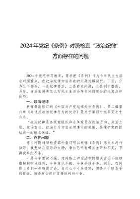 2024年党纪《条例》对照检查政治纪律方面存在的问题2024年党纪学习教育,要求把《条例》作为今年民主生活会对照重点,在政治纪律方面存在的问题对照剖析。下面,分为三个部分,一是纪律要求,二是存在问题,三是剖析整改。另外,在后面讲讲怎么写民主生活会存在问题部分的注意点和技巧。一、政治纪律根据最新修订的《中国共产党纪律处分条例》,第二编第六章《对违反政治纪律行为的处分》是关于第四十九条至七十六条。政治纪律是各级党组织和全体党员在政治方向、政治立场、政治言论、政治行为方面必须遵守的规矩,是维护党的团结统一的根本保证。二、存在问题存在问题对照检查部分我们可以根据《条例》原文来进行拟写,就是站在领导的立场,看自己还有哪些差距和不足,下面我举例五条。一是斗争意识不强。对网络上和生活中的错误言论不能够旗帜鲜明地批判,斗争意识不强、斗争手段不多。例如,在网络上看到一些错误言论,自己心中十分愤怒,但是由于联系不到作者,就没有去进行直接批判和斗争。二是理论武装不够。虽然能够严格落实第一议题制度但是在学深、学透方面还存在差距。例如虽然认真系统学习了,但是研讨不够,还没有和同志们一起深入交流探讨。三是思想认识不足。对党的政治纪律没有进行深入思考,没有完全弄明白具体的要求。虽然对《条例》进行了全文阅读,但是对《条例》修订的对照、原因还没有弄明白,总是认为自己指导政治纪律是什么,在认识上面还存在不足。四是家人管教不严。在坚决反对迷信活动上态度不坚决,不能彻底肃清家庭风气。例如虽然家人没有什么宗教信仰,但是当孩子生病的时候,总习惯求神保佑,碍于情面和对孩子的关心,没有及时制止,虽然这是小事,但是也反映出家人科学意识不强。五是自我要求不高。对一些网络谣言缺乏辨别,总认为这些跟我无关。例如在网络谣言面前,总认为自己不转发就可以了,但是当身边朋友转发之后,不去及时劝阻和解释,对自己的要求不高,存在事不关己的现象。三、剖析整改原因剖析和整改措施一般是两个部门的内容,只要用一段话进行撰写即可,我们大家都写过很多的民主生活会对照材料了,所以在这个方面不赘述。下面,举一个例子。这些问题的存在,根本上是因为本人对党的政治纪律学习不够、理解不深、执行不力,对《条例》认识还不足,没有真正从政治方向、政治立场、政治言论、政治行为方面严格要求自己。下一步,本人将认真全面学习《条例》关于党的政治纪律方面的规定,严格对标对表、贯彻执行,守好自己的底线,确保始终同上级保持高度一致。四、技巧经验一是要掌握方法,以中规中矩为主线。所谓方法就是抄的方法,怎么抄是个大学问。因为有些理论性的语言是原创不出来的,有些问题也是很难思考到的,这就涉及到一个文可居文库——海量学习资料,手机电脑均可下载www.wenkeju.com技巧的问题。首先要做的,就是搜集一些范文,这样进行一个对比,自己脑海中就能够大致有一个思路,每一方面该提哪方面的问题;然后就是着手写作,总的概念就是要中规中矩,也就是说不能一味创新,按照步骤来,每一方面的先写自己在这方面做了什么、取得了什么成效,简单提一提,虽然是提问题,但是必要的总结还是需要的,随后就开始写固定话术但经深刻反思,还存在以下问题:,这个时候你就列出一是、二是、三是来,综合一下搜集到的范文,找出一些可以写的问题,先把内容列上去,然后对应的搜集一些内容放进去,最后就是琢磨标题问题了,要中规中矩又要创新,对标题进行大幅度修改,这样才不会跟别人撞车。同时,提炼标题更能体现问题的深刻性,那么标题改完,别人的就变成自己的了。二是要把握分寸,以无关痛痒为主线。所谓分寸就是问题怎么提,例如第一方面的问题,可以提理论学习的深度还不够、学用结合的广度还不够、指导实践的力度还不够,那么这几个问题乍看起来确实存在问题,但是实质上又没有说什么问题,那么在每一个问题下面还是要先提一提自己之前做了什么,再提提差距在哪里,这样领导看了就会很满意。同时,特别要注意一些原则性的东西不能提,因为这是必须要做到的,你一旦提一些原则性问题,那么就是犯错误了,领导本来没有犯错误的,后来被你写成犯错误了,这就千万碰不得。所以,分寸必须要把握好,提出的问题要适度,不能过于尖锐,这样很容易出问题。同时,要注意一点,晚上搜集来的素材范文,有时候是乱七八糟搞的,不能一抄了之,要注意辨别,这一点非常重要。三是要紧握实际,以具体工作为主线。所谓实际就是要结合具体工作来写,比如总结成绩时要讲具体的数据,讲问题时要讲具体的不足,分管项目的要讲固投和项目建设情况,分管产业的要讲产业质效和困难,不能泛泛而谈,这样会文可居文库——海量学习资料,手机电脑均可下载www.wenkeju.com很虚,也很容易撞车。文可居文库——海量学习资料,手机电脑均可下