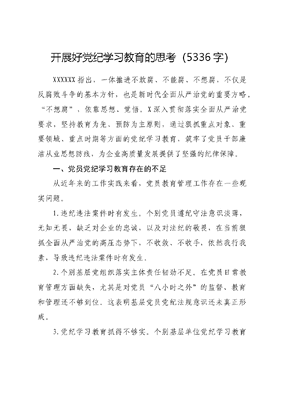 开展好党纪学习教育的思考(5336字)XXXXXX指出,一体推进不敢腐、不能腐、不想腐,不仅是反腐败斗争的基本方针,也是新时代全面从严治党的重要方略。不想腐,依靠思想、觉悟。X深入贯彻落实全面从严治党要求,坚持教育为先、预防为主原则,通过狠抓重点对象、重要领域、重点时期等方面的党纪学习教育,筑牢了党员干部廉洁从业思想防线,为企业高质量发展提供了坚强的纪律保障。一、党员党纪学习教育存在的不足从近年来的工作实践来看,党员教育管理工作存在一些现实问题。1.违纪违法案件时有发生。个别党员遵纪守法意识淡薄,无知无畏,缺乏对企业的忠诚,以及对法纪的敬畏,在当前狠抓全面从严治党的高压态势下,不收敛、不收手,依然我行我素,导致违纪违法案件时有发生。2.个别基层党组织落实主体责任韧劲不足。在党员日常教育管理方面缺失,尤其是对党员八小时之外的监督、教育和管理还不够到位。这表明基层党员党纪法规意识还未真正形成。3.党纪学习教育抓得不够实。个别基层单位党纪学习教育蜻蜓点水走过场,没有取得实效。基层管理人员对警示教育的作用重视不够,认为思想教育是虚的,总感觉一些党员如果想犯错,即使再教育也没用。有的基层单位参与纪律教育活动应付了事,对一些重要会议精神和案例通报,没有按要求及时传达,还有的单位教育活动向下梗阻现象依然存在。4.企业法规管理问题依然存在。个别党员法规意识不强、制度执行不严、管理水平不高,物资采购、工程建设、招标投标等重点领域,存在经营风险和廉洁风险,反映出一些长期形成的惯性思维还未彻底扭转。5.党员干部履职能力存在差距。有的党员学习能力不强,对党纪条规掌握不深不透,对党风廉政建设新要求不熟悉,导致违纪而不自知。有的党员综合素质和工作能力不足,执行制度不到位,也是违纪违规问题出现的主要原因。二、加强党员党纪学习教育的对策1.抓住重点对象重点教育。俗话说上行下效。党员干部由于身份地位特殊,在廉洁自律方面具有很强的示范、导向作用,对本部门或分管范围内的党风廉政建设承担着领导责任,他们对党风廉政建设的认识和态度,直接影响到本部门和单位党风廉政建设各项工作。因此,要经常教育、督促党政一把手按照党风廉政建设责任制的要求,亲自抓、负总责。文可居文库——海量学习资料,手机电脑均可下载www.wenkeju.com要在坚持集体学习与个人学习相结合的方式下,积极探索立足实际学讲结合的互动学习方式,充分发挥一把手在讲廉洁、倡廉洁工作中的示范引领作用,采取一把手登台授课,以廉洁党课的形式开展党纪条规宣讲活动,重点宣讲党员干部必须遵守、领导干部必须熟知、党务干部必须熟练运用的党章、准则、条例、规则、规定、制度等,覆盖到党支部、全体党员和关键岗位人员,促进广大党员干部明确责任要求、守好纪律底线,有效实现监督关口前移。为新提任干部上好履新第一课,在思想上筑牢廉洁从业第一道防线,既能增强新提任干部廉洁自律意识,做到抓早抓小,也是对新提任干部的爱护与鞭策,是加强领导干部教育、管理、监督工作的有效手段。2.抓住重点领域重点教育。管钱、管物、管人的实权部门,往往是违纪违规的易发、多发区。因此,健全和完善公开制度,加大对重大决策、财务管理、物资采购、人事任免等环节的监督力度,并有针对性地加强对这些重点部门和重点领域党员领导干部进行教育,教育引导他们正确认识和处理公与私、亲与清、情与法的关系,使他们面对各种诱惑,时刻有一种如临深渊、如履薄冰的危机感。同时跟踪落实好廉洁风险教育,充分发挥业务部门监管责任,督促业务部门开展廉洁风险文可居文库——海量学习资料,手机电脑均可下载www.wenkeju.com识别和宣传教育活动,根据业务领域廉洁风险特点,通过风险识别、案例警示等教育形式,使关键岗位人员知风险,明底线。定期组织纪委办公室干部送教下基层,深入基层关键岗位进行党纪法规宣讲、政策解读、案例剖析、廉洁风险防控辅导等,把思想政治工作贯穿日常教育全过程,教育帮助党员干部少犯错误,及时纠正错误。3.抓住重点时期重点教育。开展多种形式的纪律教育活动。狠刹四风,坚持标本兼治、综合治理、惩防并举、注重预防的原则,强化党章党规党纪知识的教育学习,进一步提高党员干部纪律规矩意识。同时紧盯中秋春节等传统节日违纪违规问题易发、多发时期的纪律教育,早打预防针,勤注防腐剂。通过集中教育重申纪律要求,强化思想防线,恪守纪律底线,坚决杜绝节日腐败,严防四风问题反弹回潮。充分发挥以案释纪作用,狠抓党纪党规宣传教育,引导广大党员干部讲规矩、知行止、存戒惧、守底线。加强对节日期间落实中央八项规定精神等情况进行明察暗访。加大监督检查力度,特别是对党员干部六大纪律的落实等关键环节必查,对借节日之机吃喝送礼、公车私用、