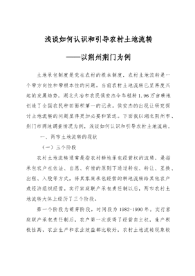 浅谈如何认识和引导农村土地流转——以荆州荆门为例土地承包制度是党在农村的根本制度,农村土地流转是一个带方向性和带根本性的问题。当前农村土地流转已呈再度兴起的发展趋势,湖北大冶市农民侯安杰今年租种1.96万亩耕地创造了全国农民种田面积第一的记录。侯安杰的出现让研究探讨土地流转的问题显得更加必要和紧迫。下面我以湖北荆州市、荆门市两地调查情况为例,浅谈如何认识和引导农村土地流转。一、两市土地流转的现状(一)三个阶段农村土地流转通常是指农村耕地承包经营权的流转,是指承包农户在依法、自愿、有偿的原则下通过转包、转让、互换、出租、入股等方式,将其家庭承包经营的耕地流转给其他农户或经济组织经营。实行家庭联产承包责任制以后,两市农村土地流转大体上经历了三个阶段。第一个阶段为萌芽阶段,时间段为1982-1990年。实行家庭联产承包责任制后,农户第一次获得了经营自主权,生产积极性高,农业生产和农业效益都比较好,农村土地流转现象较少,但在少数地方开始出现,由此产生了第一批种田专业户。第二个阶段为被动性发展阶段,时间段为1991-2002年,这期间农业生产成本增加较快,农民负担逐年加重,农民外出经商打工的越来越多,举家外出、外迁的现象也很普遍,农村出现了大量的弃田撂荒现象。在各级政府推动下,土地被动流转,一些种田能手和企业得到了大量耕地,农村开始出现了较大规模的土地规模经营。第三个阶段为恢复性发展阶段。时间为2003年至今。我省农村推行税费改革和综合配套改革,全面开展农村土地二轮延包工作,农村土地由包袱变成财富,农民由弃田变成要田甚至抢田,种田大户有半数以上退出未经合法流转的土地,土地规模经营势头锐减,出现较严重的倒退现象。农民在得到了土地承包权并且拿到土地承包经营权证之后,觉得种田的比较效益还是低,出外打工还是比种田挣钱,农村劳动力转移继续加大增多,农村土地流转再度兴起,并很快进人活跃阶段,流转量、流转形式都明显增加。但还没有恢复到2002年的流转水平。(二)八种形式当前农村土地流转有八种形式。一是转包,即承包农户将承包地转给本集体经济组织其他承包农户从事农业生产。二是转让,即承包农户经发包方(村委会)同意,将承包期内全部或者部分承包土地让渡给第三方,由第三方履行土地承包合同的权利和义务,转让后原土地承包关系自行终止,原承包户承包期内土地承包经营权部分或全部失去。三是互换,即承包方之间为各自需要和便于耕种管理,对属于同一集体经济组织的承包地块进行交换,同时交换相应的土地承包经营权。四是出租,即承包农户将所承包的土地全部或部分出租给本集体经济组织以外的他人从事农业经营。五是入股,即农户将所承包的土地承包经营权量化为股权,入股从事农业合作生产。六是委托流转,由农户委托集体经济组织或中介组织流转其土地承包经营权。此外还有委托代耕和拍卖经营两种形式。(三)七条成效农村土地流转的再度兴起,顺应了农村经济社会发展的新要求,它对于推动农村生产力发展和现代农业发展、促进新农村建设,意义重大。一是促进了土地规模经营。荆州市土地规模经营的农户达到1848户,涉及面积13.2万亩。荆门市土地规模经营面积达到8.7598万亩。二是增加了流转双方的收人。土地流转实现的是双赢。从流出的一方看,农民不仅得到每亩100元至1000元不等的流转费,还可以享受各种惠农补贴,更可以放心地就近或者外出打工,获取更大的劳动收人。从流入方来看,增加土地面积后获得了更多的农业资源,产生了较好的规模经营效益。荆门市粮食生产状元刘若峥2007年种粮纯收人46万元。三是提升了农业综合生产能力。一方面各地为服务大户规模经营改善了水电路等基础设施,另一方面,大户也主动投资基础设施建设,两方面合力提高了农业综合生产能力。四是加快了农业机械化进程和农业科技推广步伐。土地流转产生种田大户,种田大户大都是农业机械大户,也是科技示范户。五是解决弃田抛荒问题,保障粮食生产安全。随着农村劳动力的大量转移,有的地方开始出现新的土地撂荒现象。各地土地流转的努力工作及时地解决了这个问题。六是扩大农民就业,促进农村劳动力转移。土地流转的最大价值就是为转移农民提供后方保障,也就是让农民放心出外打工挣钱。而通过土地流转产生的种田大户,他们又为农民的再就业提供平台。七是催生农村新的经济社会组织更快更好地发育成长。随着土地流转和种田大户的产生,一些服务性的政府组织和民间组织伴随产生。二、当前农村土地流转的总体评价和问题、原因分析我们认为当前大规模的土地流转还没形成,现在只是恢复性发展阶段。表现在两个方面。一是总量不大。我们说农村土地流转呈恢复性发展,但还没有恢得到过去2002年的顶峰时期。2002年荆门市土地流转面积达到10万亩,后来降到4万亩。现在上升到8万-9万亩。荆门市的土地流转面积只占全市总耕地面积的6%,荆州市只占4%