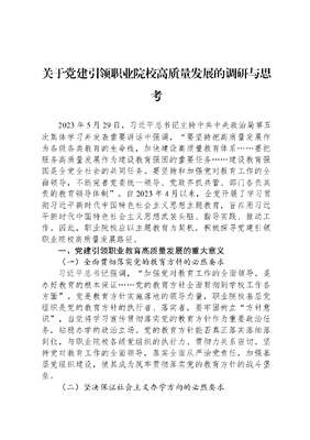 关于党建引领职业院校高质量发展的调研与思考2023年5月29日,习近平总书记主持中共中央政治局第五次集体学习并发表重要讲话中强调,要坚持把高质量发展作为各级各类教育的生命线,加快建设高质量教育体系……要把服务高质量发展作为建设教育强国的重要任务……建设教育强国是全党全社会的共同任务。要坚持和加强党对教育工作的全面领导,不断完善党委统一领导、党政齐抓共管、部门各负其责的教育领导体制。自2023年4月以来,全党开展了学习贯彻习近平新时代中国特色社会主义思想主题教育,旨在用习近平新时代中国特色社会主义思想武装头脑、指导实践、推动工作。因此,职业院校应以主题教育为契机,积极探寻党建引领职业院校高质量发展路径。一、党建引领职业教育高质量发展的重大意义(一)全面贯彻落实党的教育方针的必然要求习近平总书记强调,加强党对教育工作的全面领导,是办好教育的根本保证……党的教育方针全面贯彻到学校工作各方面。党是教育方针实施落地的领导力量,职业院校基层党组织是党的教育方针的执行者、落实者,要牢固树立方针意识,自觉将学习宣传贯彻落实党的教育方针作为重要政治任务,站稳办学的政治立场。党的教育方针能否真正落实落细落到位,与职业院校各级党组织的执行力、贯彻力关系密切。坚持党对教育工作的全面领导,落实全面从严治党责任,加强基层党组织建设,使其成为筑牢贯彻落实党的教育方针的战斗堡垒。(二)坚决保证社会主义办学方向的必然要求培养什么人、怎样培养人、为谁培养人这是教育的根本问题。职业教育肩负的育人使命不仅是要培养出精于技艺的技术技能人才,更需要培养出掌握精湛技术且胸怀国之大者的能工巧匠、大国工匠。《关于推动现代职业教育高质量发展的意见》明确指出,坚持党的领导,坚持正确办学方向,坚持立德树人……培养更多高素质技术技能人才、能工巧匠、大国工匠,为全面建设社会主义现代化国家提供有力人才和技能支撑。这为职业教育发展明确了目标,为推动高质量的人才培养指明了方向。职业院校要坚持党的领导,走中国特色社会主义教育发展道路,坚定社会主义办学方向,培养忠于党和人民伟大事业的接班人。(三)新时代新征程开创事业发展新局面的必然要求在全党深入开展学习贯彻习近平新时代中国特色社会主义思想主题教育,对于职业院校现阶段由规模化发展向内涵式高质量发展、由双高校建设向实现职业本科层次办学目标转变,优化自身定位,具有重大现实意义。因此,以学习贯彻习近平新时代中国特色社会主义思想主题教育为契机,党建引领职业院校高质量发展,是新时代新征程开创事业发展新局面的必然要求。二、党建引领职业教育高质量发展的困境(一)发展困境:职业院校发展质量还不高新中国成立以来,在党的领导下,我国职业教育走过了奠基式发展阶段和规模式发展阶段。在职业教育飞速发展的良好态势之下,职业院校发展仍呈粗放式发展模式,管理模式较为简单,发展质量还不高。党的十八大以来,特别是《国家职业教育改革实施方案》颁布以来,我国职业教育开启了提质培优、增值赋能的新赛道,面临着高质量发展的新要求。这就需要职业院校要积极应对新形势,响应党和国家事业发展对高技能型人才的迫切需要,着力解决内涵式发展的新问题新矛盾。面对新形势新任务,职业院校务必要坚持党对教育事业的全面领导,充分发挥党总揽全局、协调各方的积极作用,加强顶层设计,集中优势力量,克服发展难题,以党建引领职业教育高质量发展。(二)现实困境:人才培养与社会需求相脱节随着我国由高速增长阶段向高质量发展阶段的转变,中国工业发展也由中国制造向中国智造转变,加快建设现代化产业体系已成为社会主义现代化强国和中华民族伟大复兴的重要内容。随着现代化产业体系的快速建设,现代化产业工人与高级技能型人才的需求在增加,但职业院校培养的人才具有一定的滞后性,与产业需求存在脱节。如专业设置不能适应现代化产业发展需要、技能型人才水平不高等。职业院校基层党组织应发挥党建的引领作用,促进职业院校人才培养符合地方经济社会发展需求,以内涵式建设和高质量发展实现二者有效衔接。(三)内部困境:职业院校党建落实不到位职业院校党建落实不到位,有如下表现。一是党建与业务相脱离。党支部党建与业务存在两张皮、以党务代替党建等现象,未能够很好地发挥党建的引领作用,一支部一品牌一支部一特色的落实力度不够。二是抓住关键少数有待提高。少数职业院校在管党治党上曾存在宽松软问题,党组织功能弱化,党员意识淡漠,个别学院领导干部理想信念动摇、宗旨观念淡薄,严重影响了所在学校的健康稳定发展。因此,要落实全面从严治党责任,加强党组织建设,强化党性教育,提升党员意识。三、党建引领职业教育高质量发展的实践路径(一)强化首位意识,提高政治三力习近平总书记先后在不同场合强调指出,党的政治建设是党的根本性建设,决定党的建设方向和效果